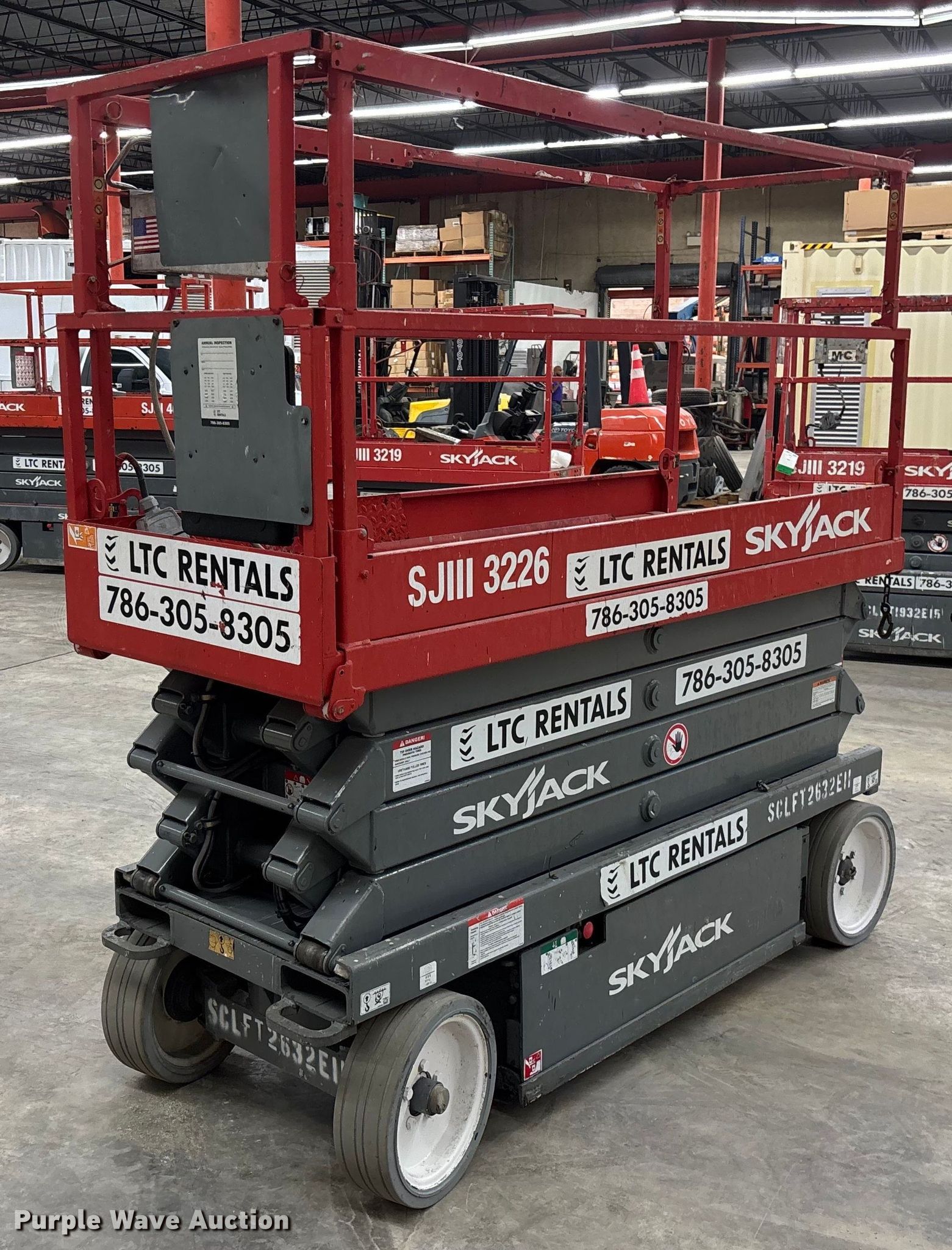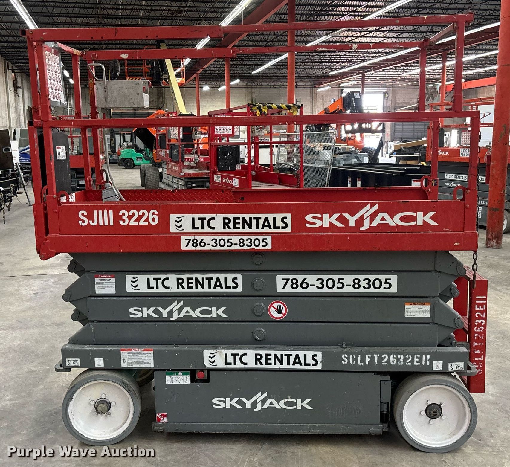 Purple Wave is selling a used Scissor or Vertical Lift in Florida. This item is a 2015 Skyjack 3226 scissor lift with the following: Hours: 158 on meter, Serial: 27023329