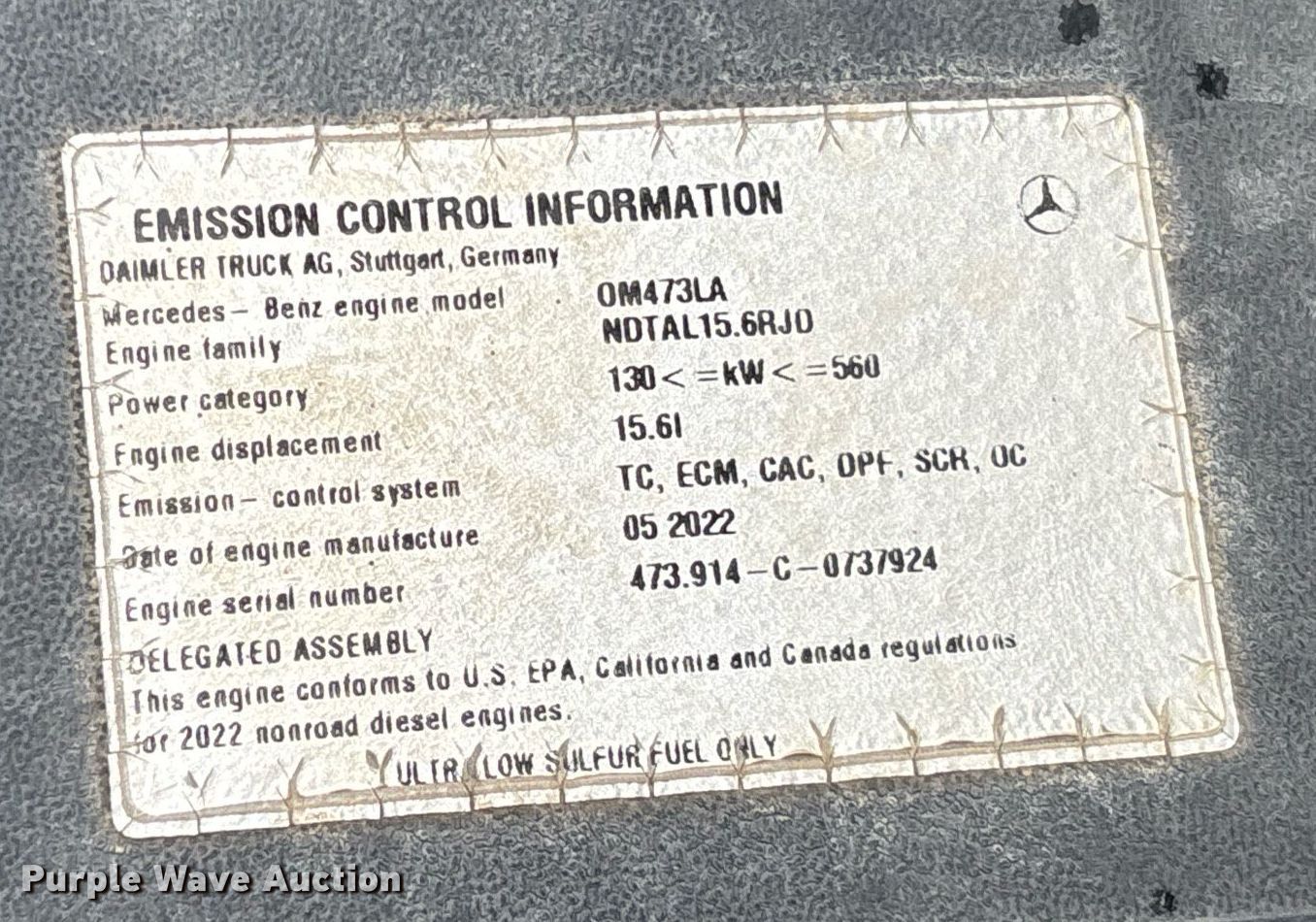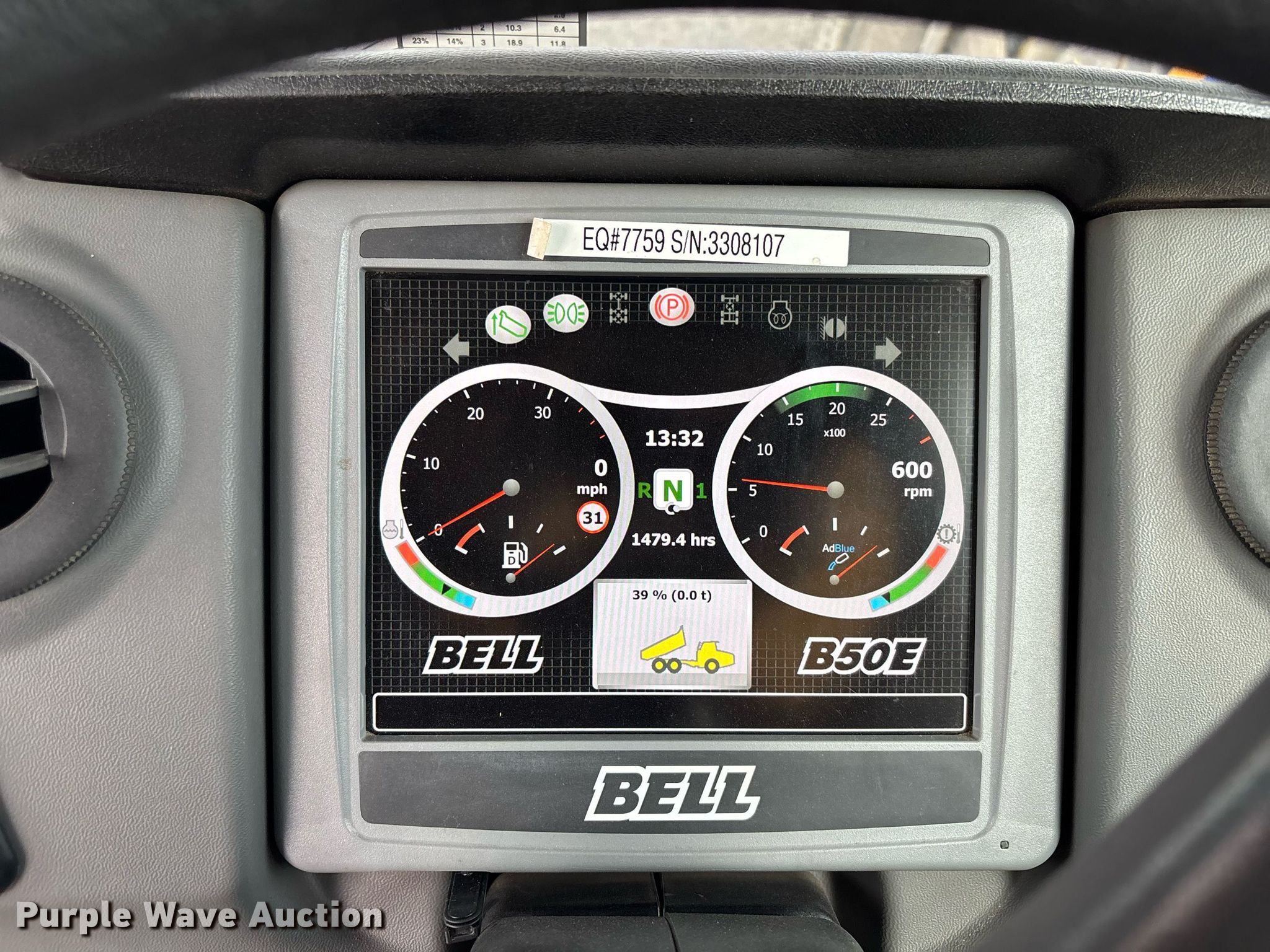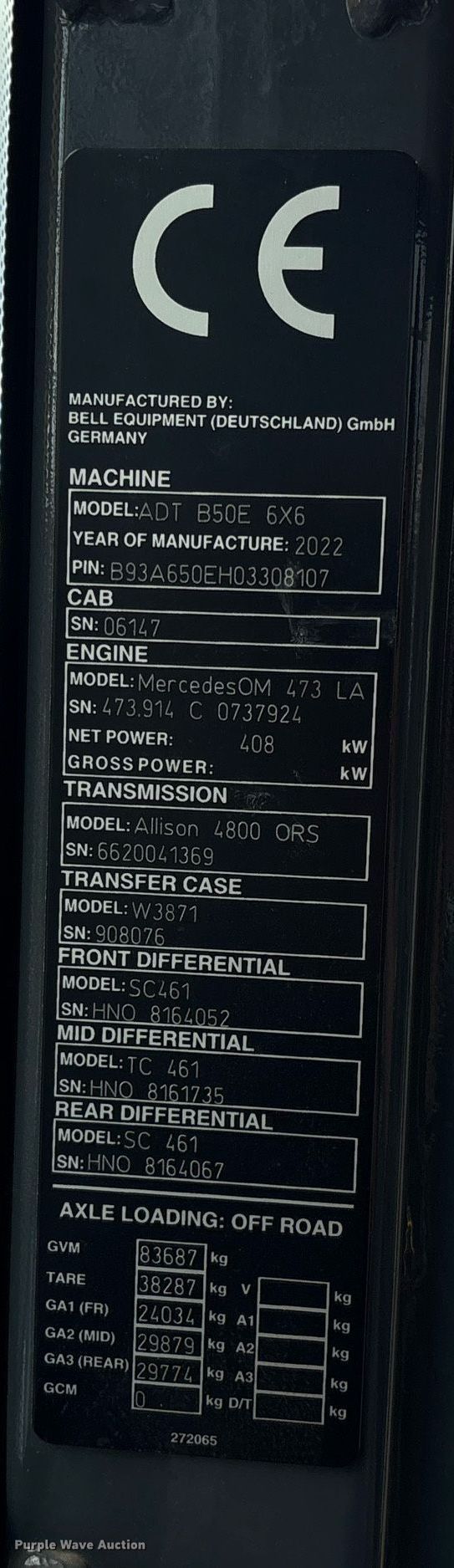 2022 Bell ADT B50E articulated haul truck. Hours: 1,479 on meter, Serial: B93A650EH03308107. Engine Mercedes-Benz OM473LA, Displacement: 15.6L, Cylinders: 6, Fuel type: Diesel, kW: 408. Transmission Allison 4800 ORS, Automatic. Chassis Six wheel drive. Interior AC, Heat, Backup camera, Auto lube. Features Dump bed Bell, Capacity: 50 tons. Tires Size: 875/65R29, Brand: Goodyear. Lease Return. Apopka, FL 32703