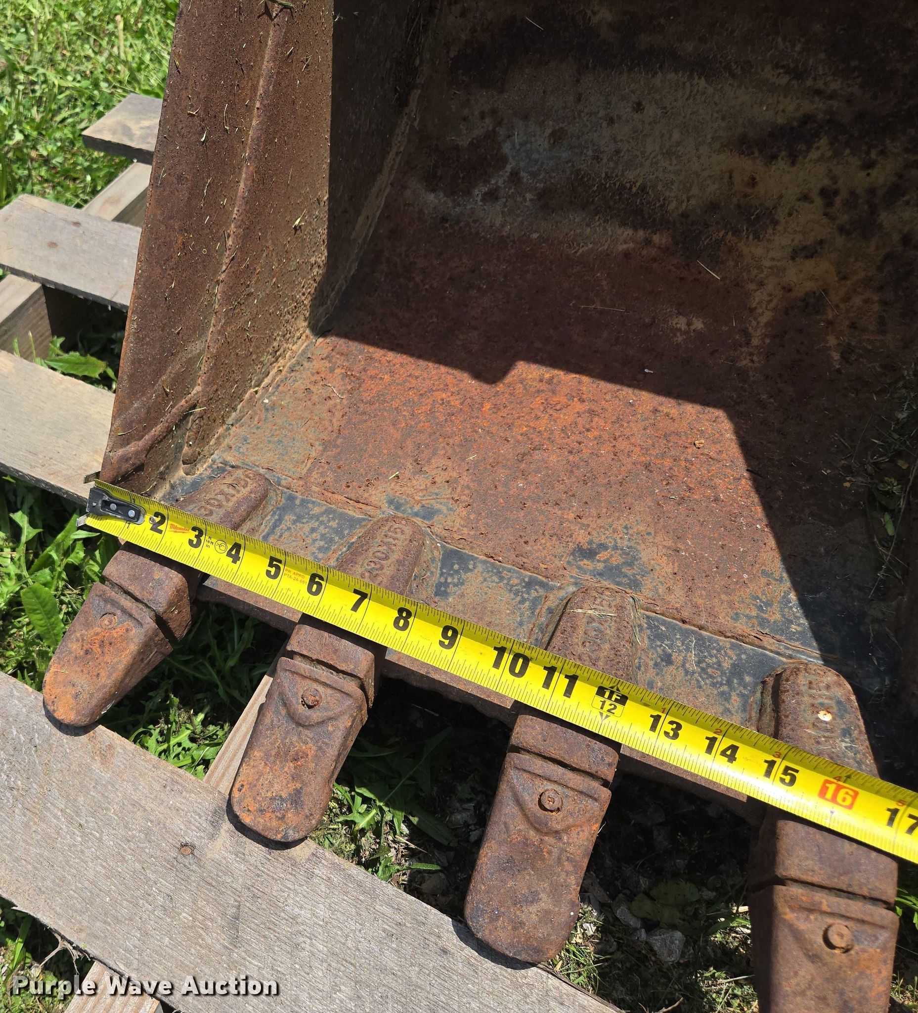 Backhoe bucket. Features. Backhoe bucket Width: 18", Teeth: 4, Pin diameter: 1.25". Notes Removed from a Bradco 509 backhoe attachment. Carydale Farm. Liberty, MO 64068