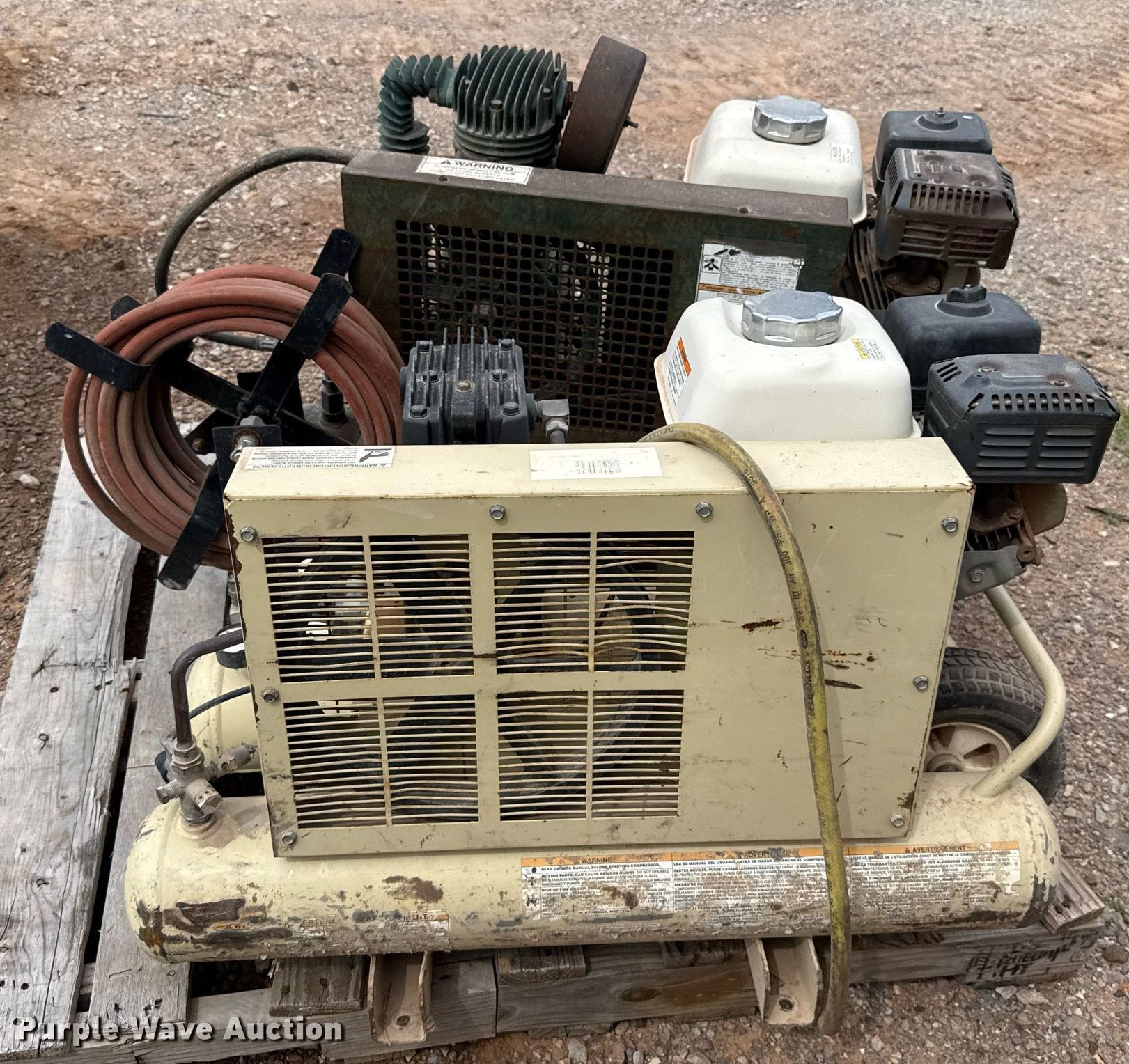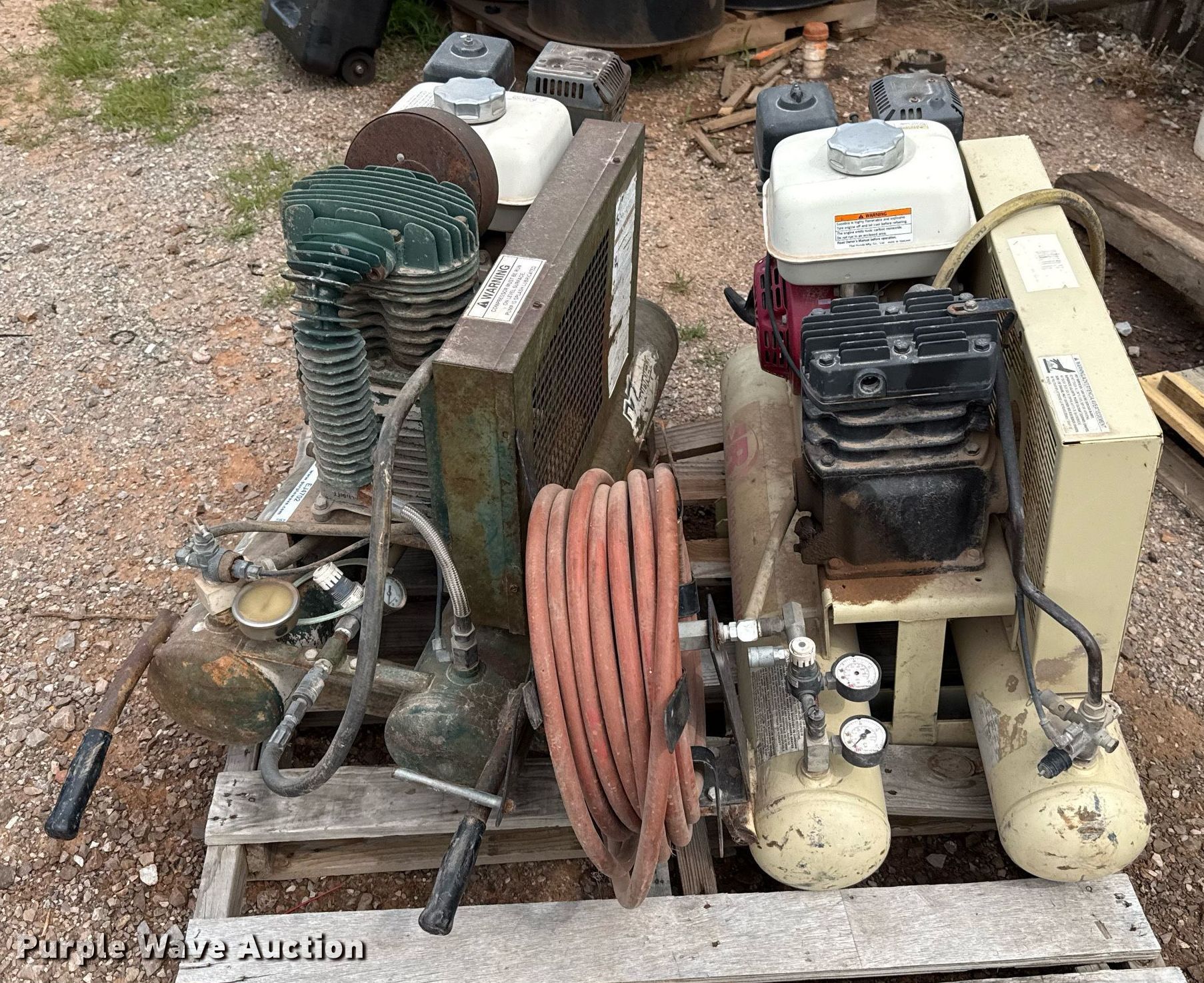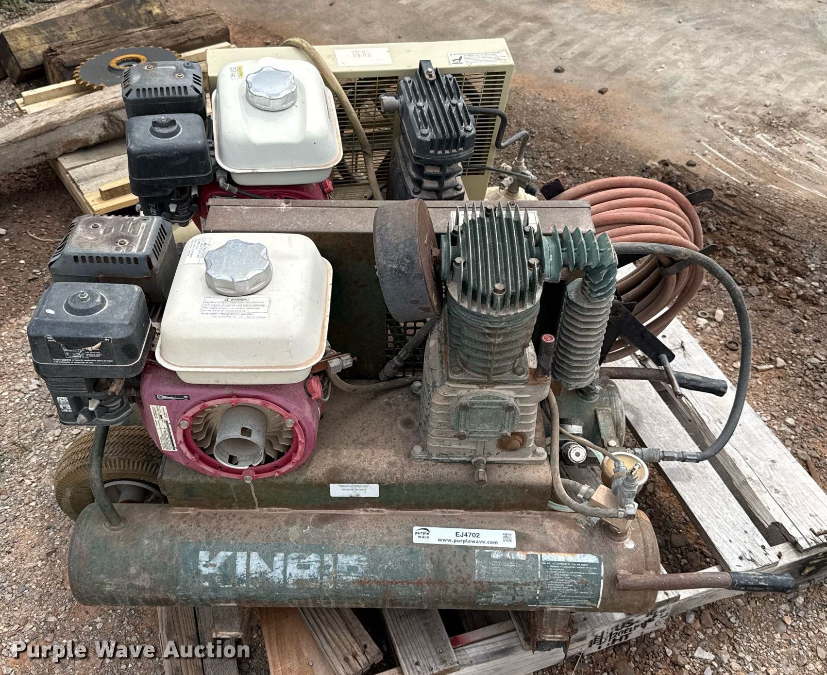 Purple Wave is selling a used Air Compressor in Oklahoma. This item is a (2) air compressors with the following: Kinair 6590HK18-0001, Engine, Honda, Displacement: 196 cc, Cylinders: 1, Fuel type: Gas,