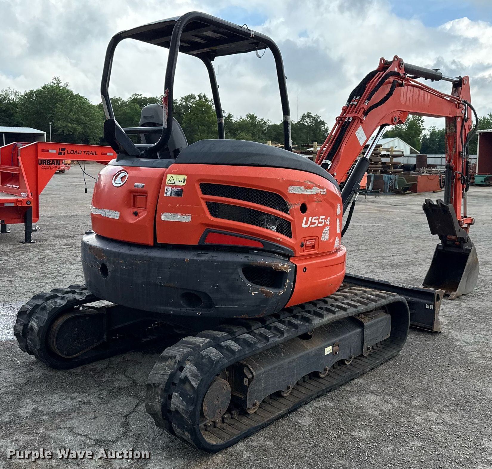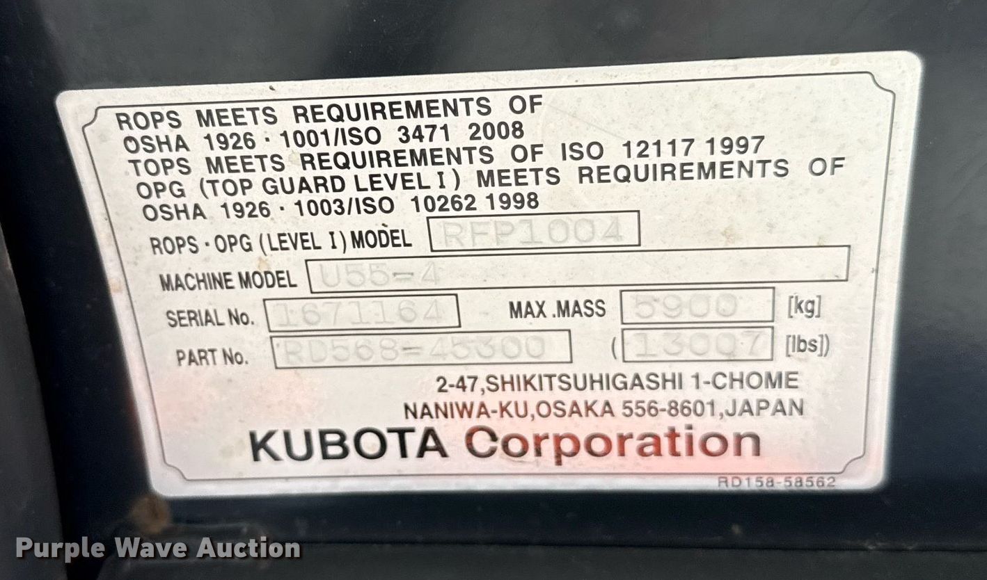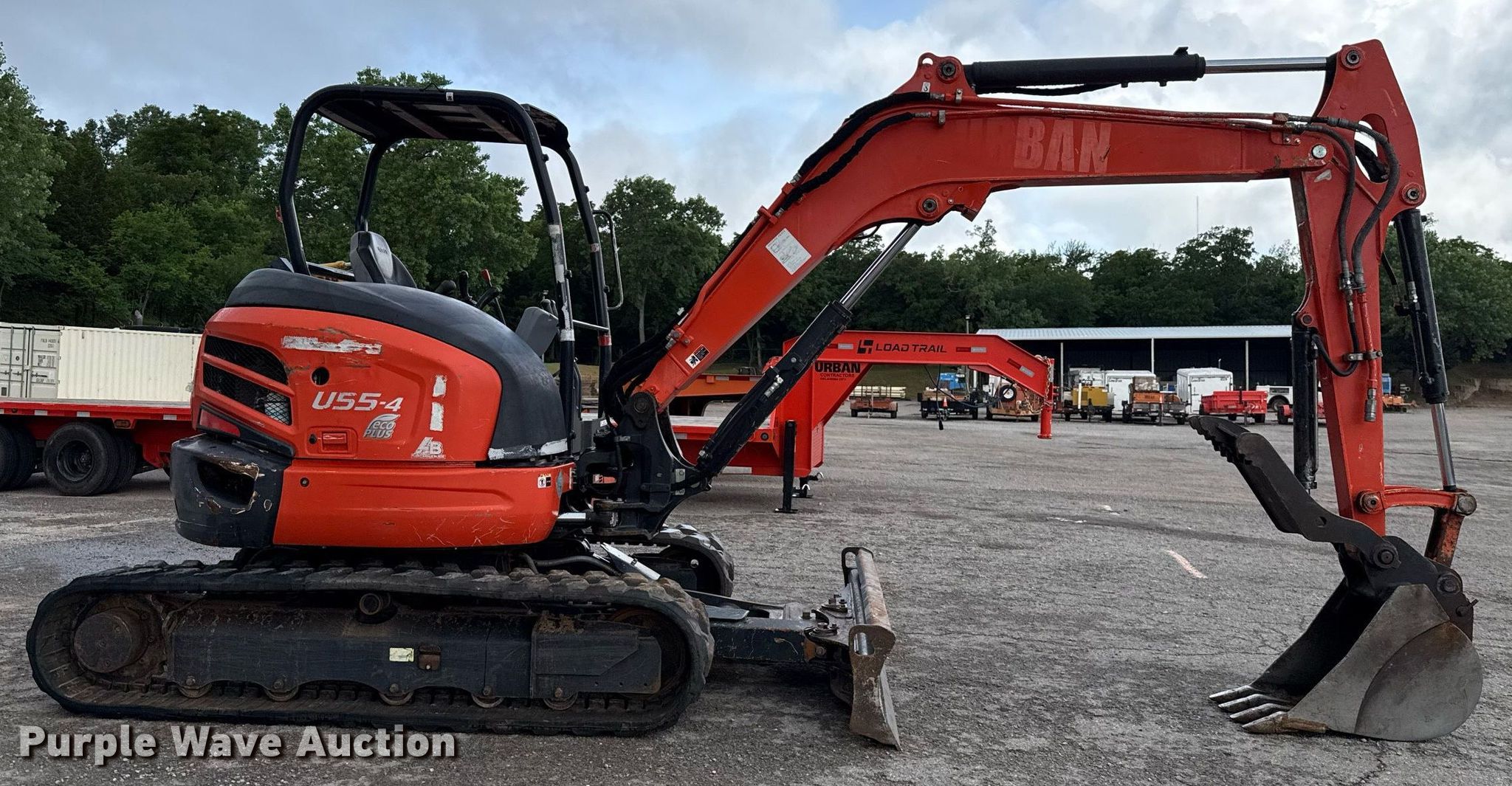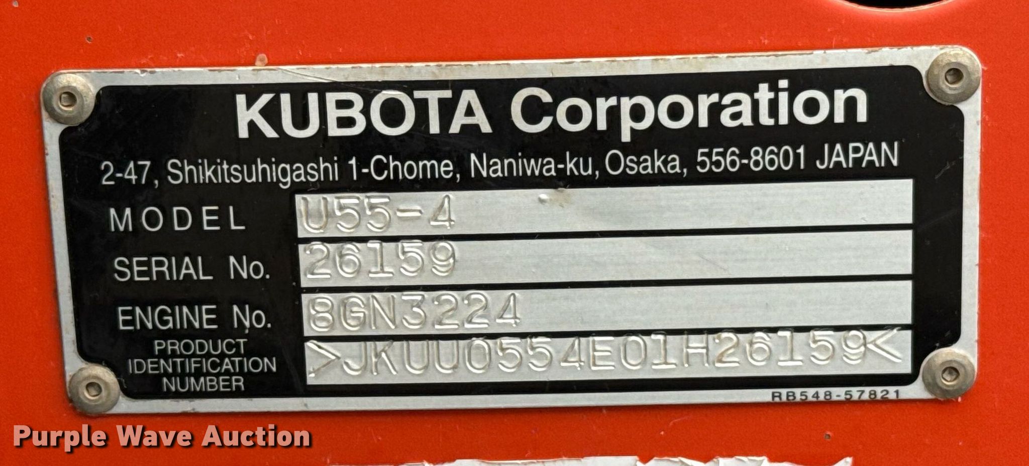 Purple Wave is selling a used Mini Excavator in Oklahoma. This item is a 2016 Kubota U55-4 mini excavator with the following: Hours: 2,295 on meter, Serial: 26159