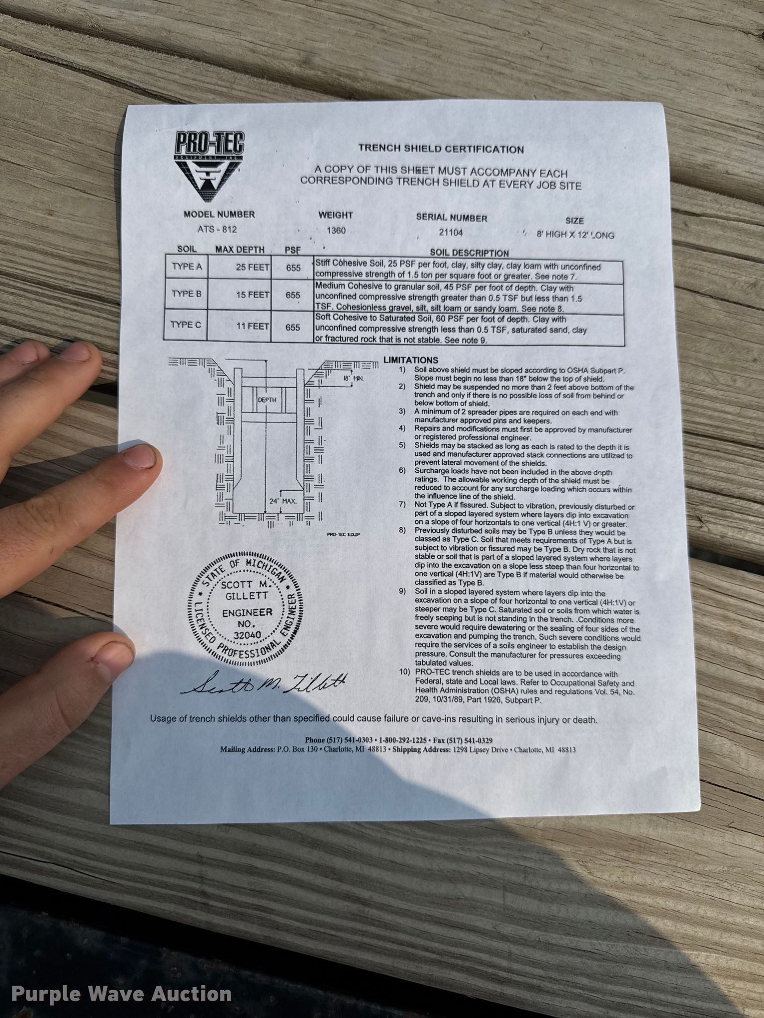 Purple Wave is selling a used Underground Safety or Shoring in Iowa. This item is a Pro-Tec ATS-812 trench box with the following: Serial: 21104, 8' x 12', Adjustable width: 28" - 44"
