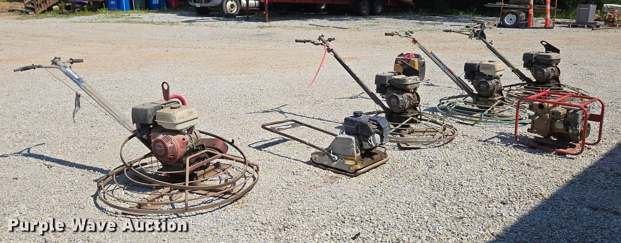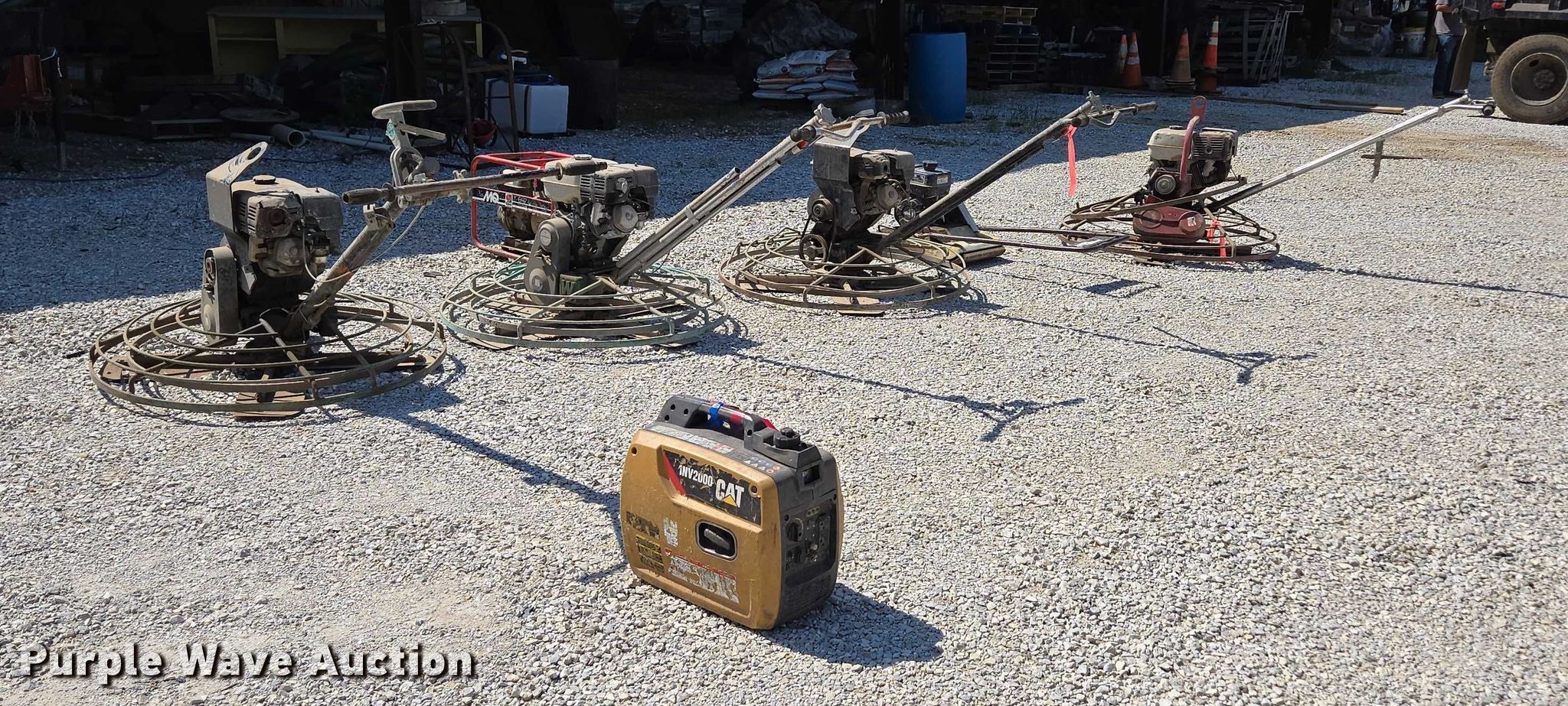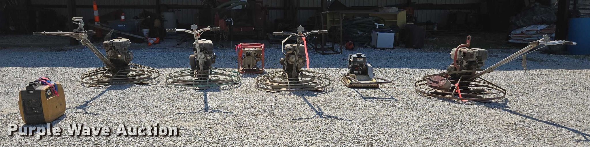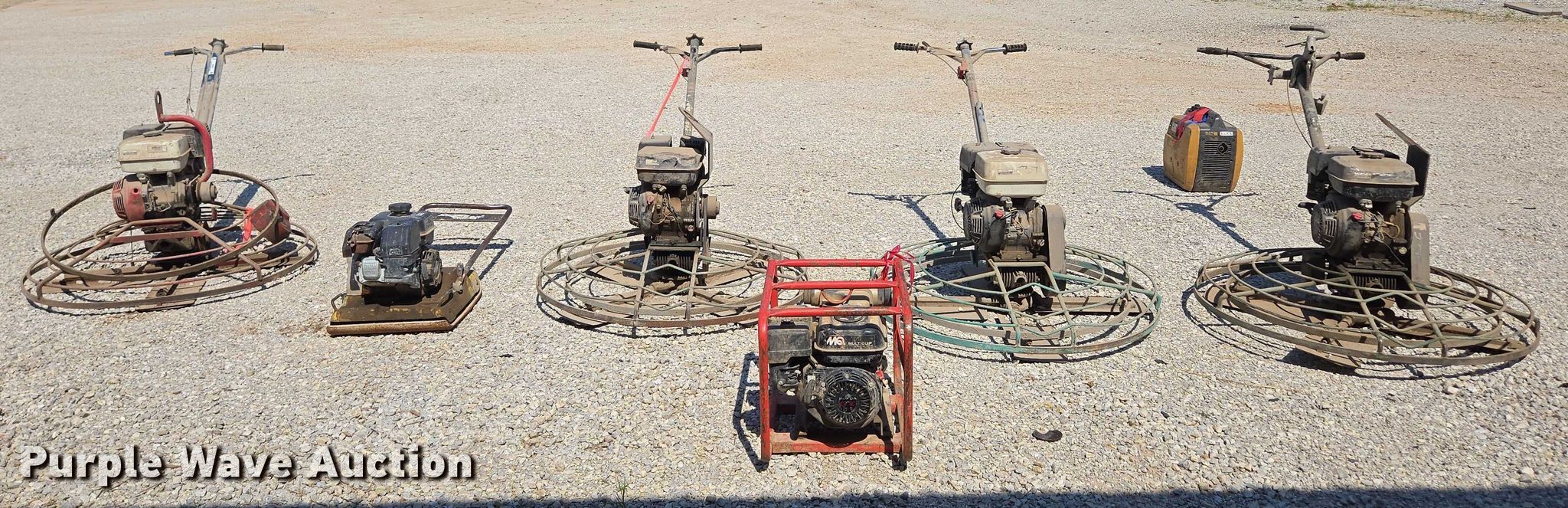 Purple Wave is selling a used Concrete Equip. or Acces. in Missouri. This item is a Concrete equipment with the following: Allen Engineering 45" power trowel, Unit #: 015202, Engine, Honda GX340, Non-operational unit, Whiteman B48H power trowel, Serial: GG0102003, Engine, Honda GX240, Non-operational unit, Whiteman B-4-8H power trowel, Serial: HB63155, Engine, Honda GX240,, Whiteman BA48H power trowel, Serial: DH0120599, Engine, Honda GX240, Fuel Leak, Caterpillar INV2000 generator, Non-operational unit, Multiquip QP-2TH pump, Serial: 2TH-29955, Engine, Honda, Pump issues, cracked, Wacker Plate compactor, Engine, Kohler SH Series, Displacement: 196 cc, HP: 6.5, Plate: 22" x 19", Non-operational unit