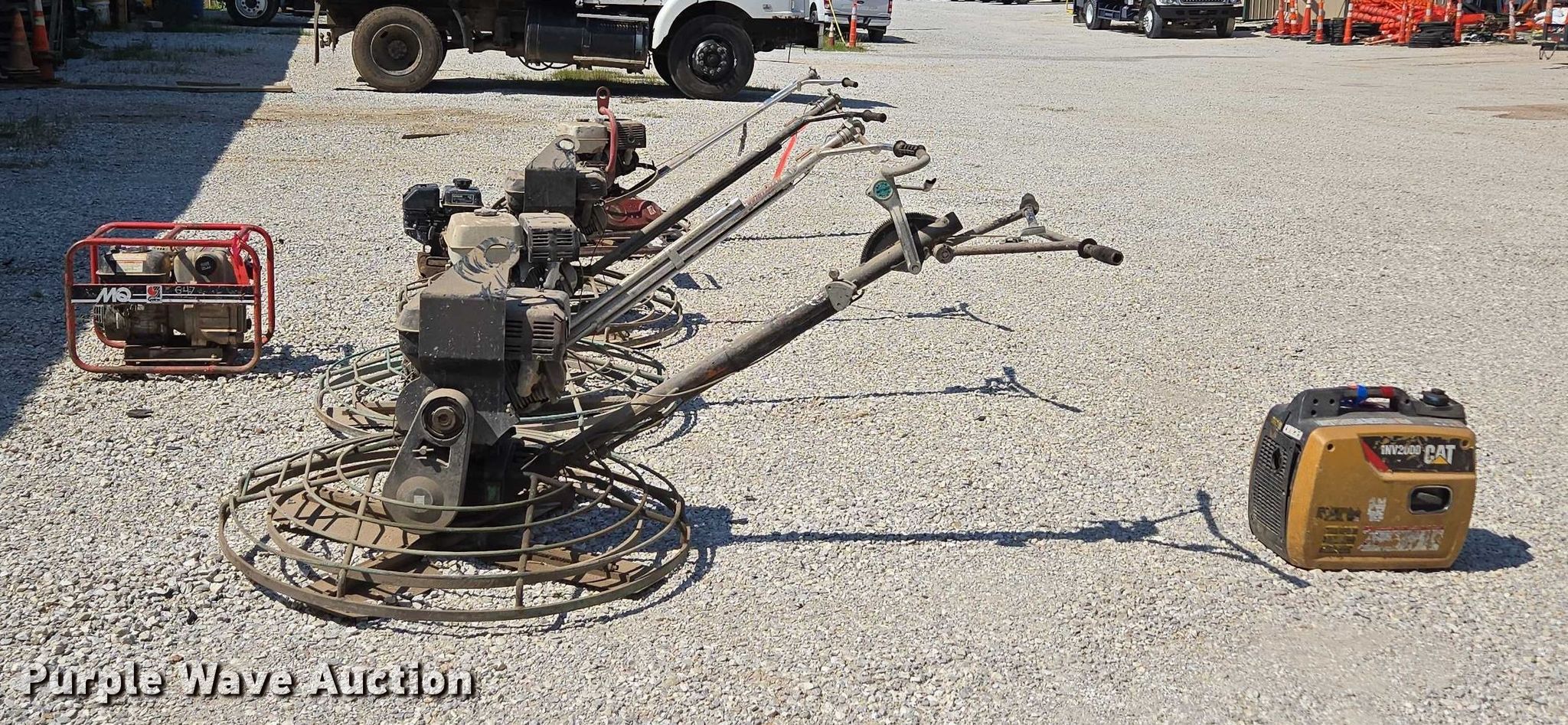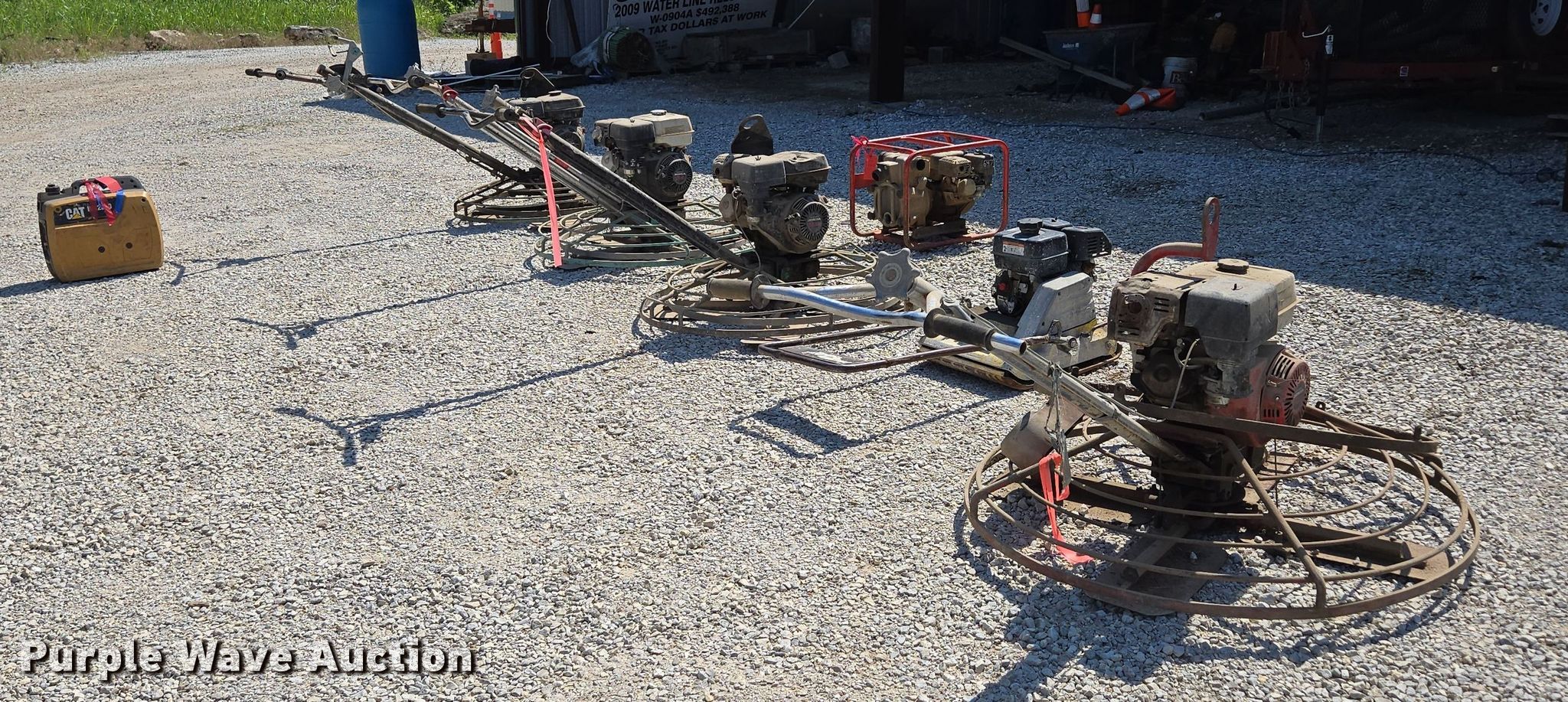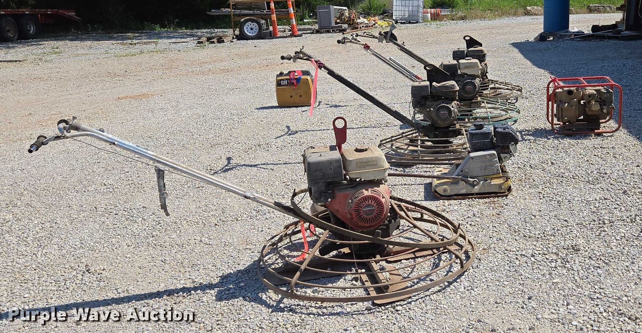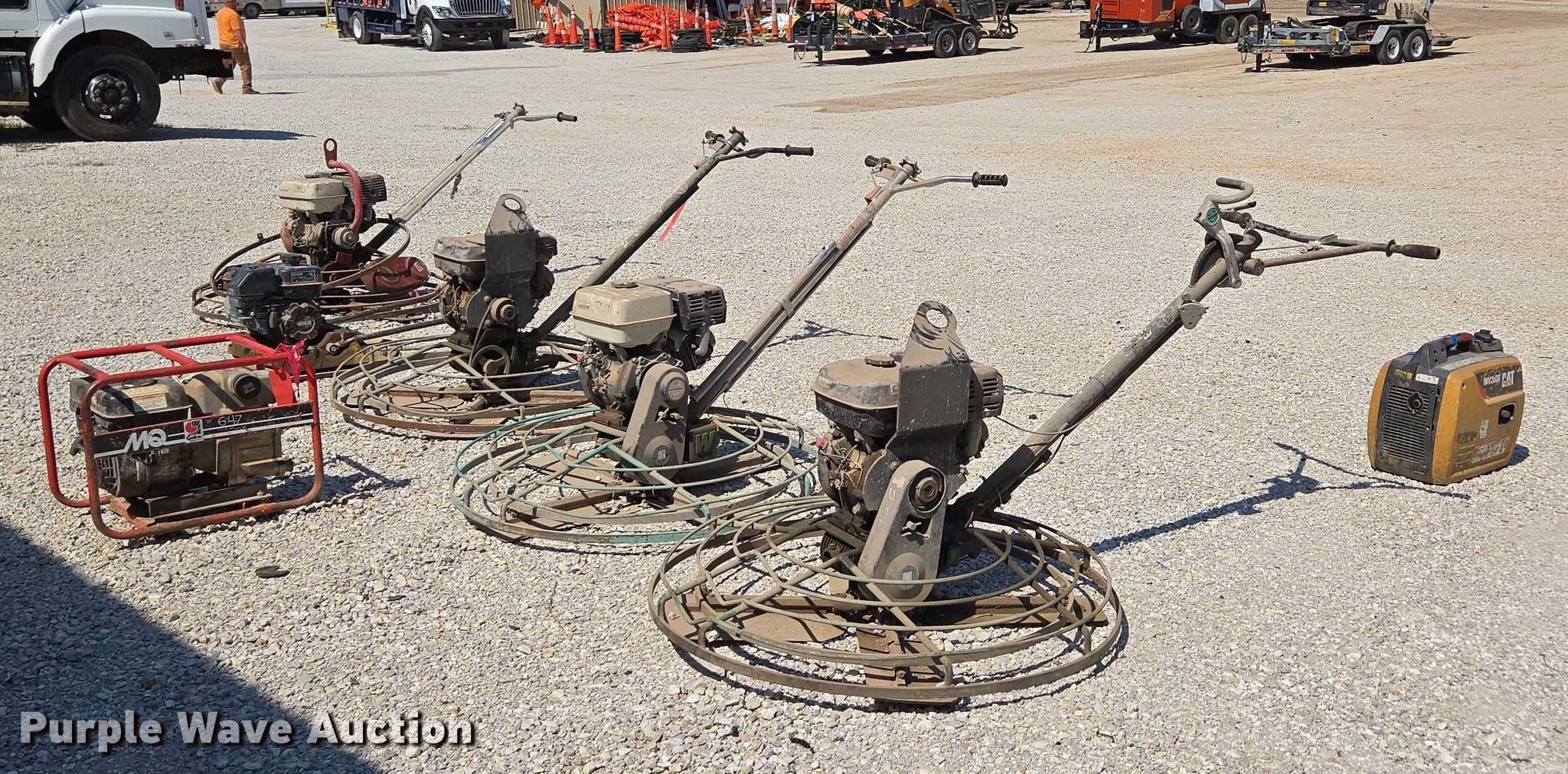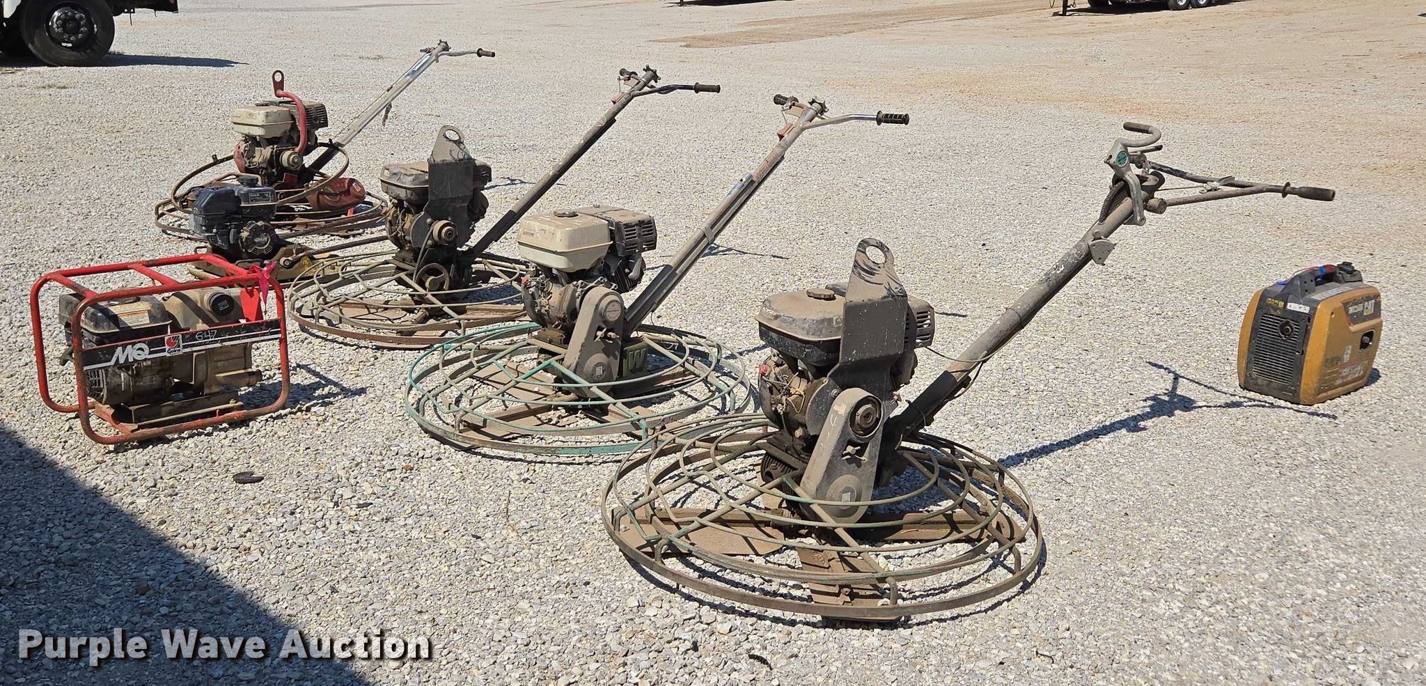 Purple Wave is selling a used Concrete Equip. or Acces. in Missouri. This item is a Concrete equipment with the following: Allen Engineering 45" power trowel, Unit #: 015202, Engine, Honda GX340, Non-operational unit, Whiteman B48H power trowel, Serial: GG0102003, Engine, Honda GX240, Non-operational unit, Whiteman B-4-8H power trowel, Serial: HB63155, Engine, Honda GX240,, Whiteman BA48H power trowel, Serial: DH0120599, Engine, Honda GX240, Fuel Leak, Caterpillar INV2000 generator, Non-operational unit, Multiquip QP-2TH pump, Serial: 2TH-29955, Engine, Honda, Pump issues, cracked, Wacker Plate compactor, Engine, Kohler SH Series, Displacement: 196 cc, HP: 6.5, Plate: 22" x 19", Non-operational unit