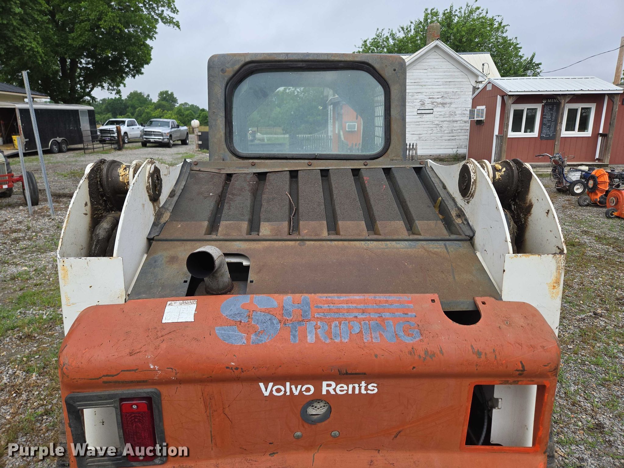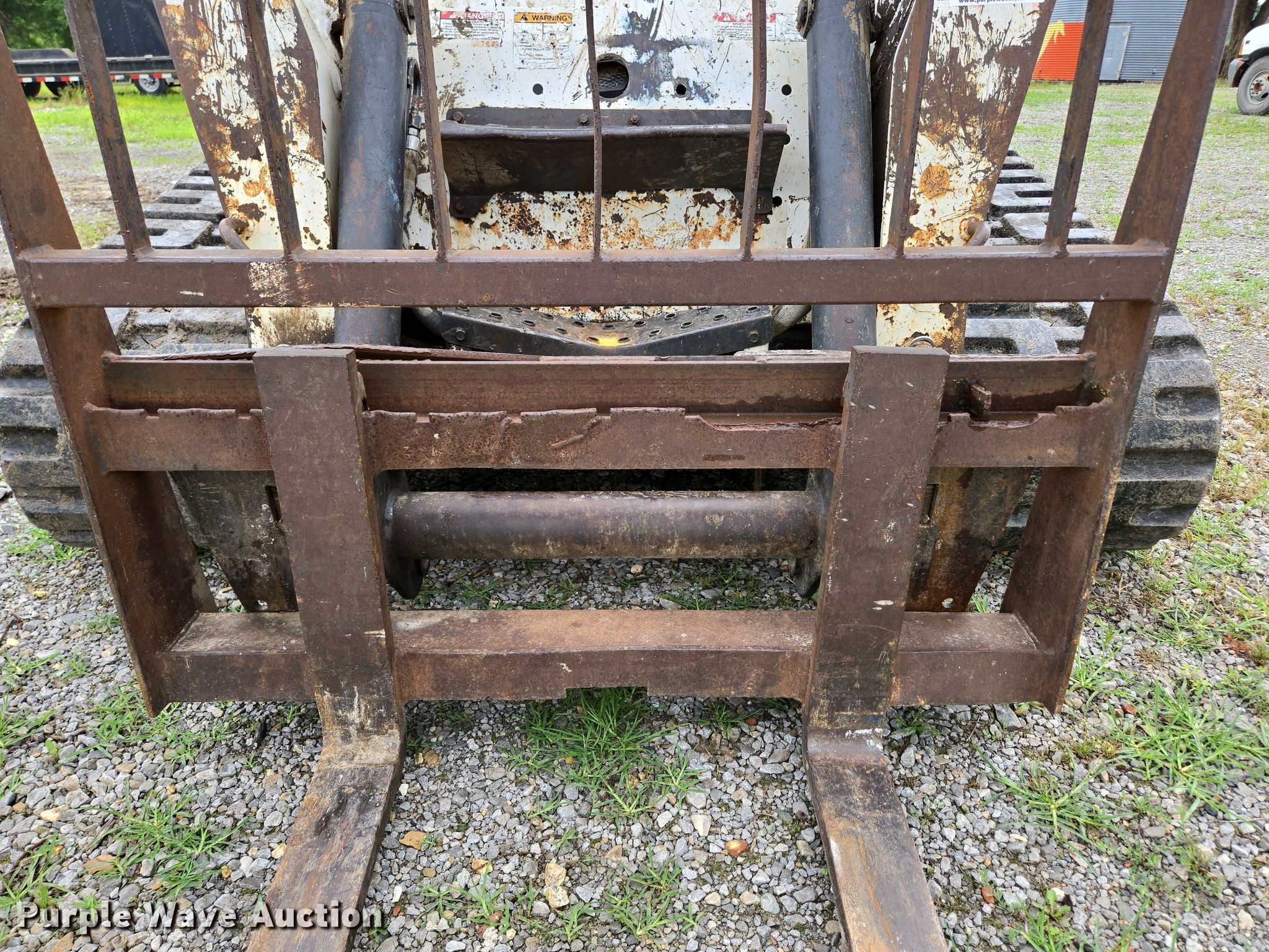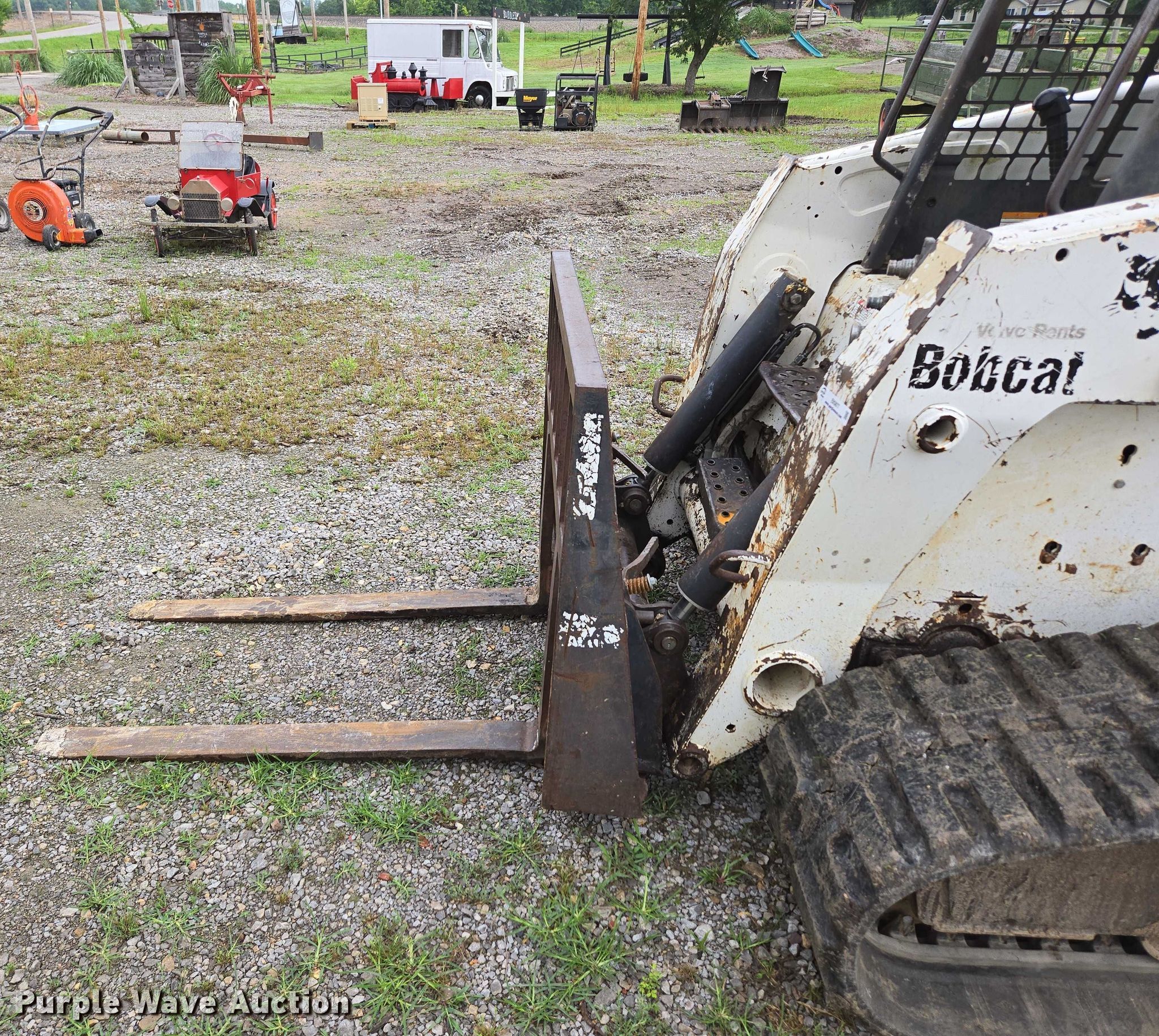 2005 Bobcat T250 tracked skid steer loader. Hours: 3,827 on meter, Serial: 525614298. Engine Kubota V3300-T, Serial: 5N1050, Displacement: 3.3L, Cylinders: 4, Fuel type: Diesel, kW: 66.8. Transmission Hydrostatic. Operators station Bucket control: Foot. Features Auxiliary hydraulics, Quick coupler: Manual, Forks Length: 47.25". Tracks Width: 17.75". Notes Engine door damaged, Forks welded in place, Warning indicator: 250 HR Service. SH Striping LLC. Pittsburg, KS 66762