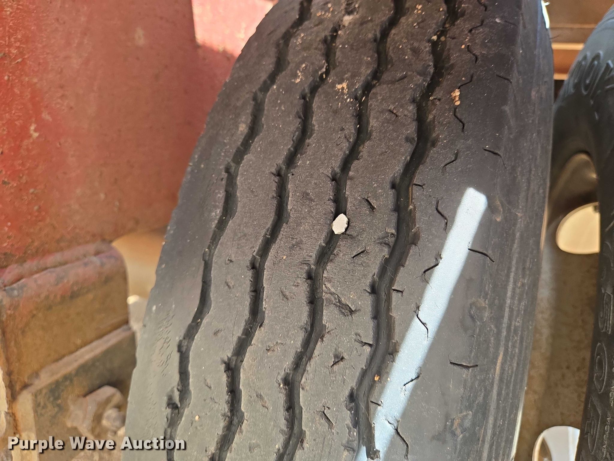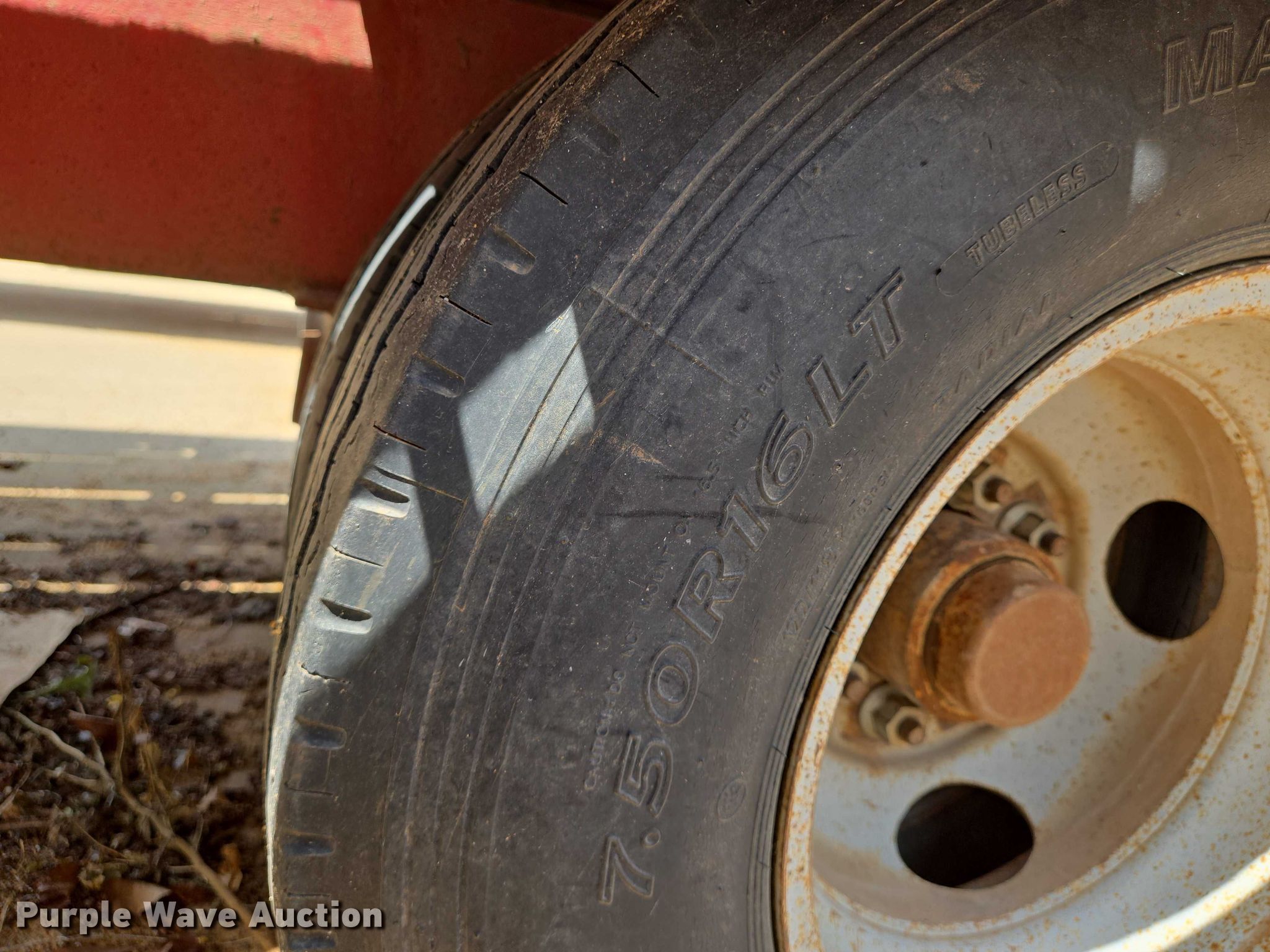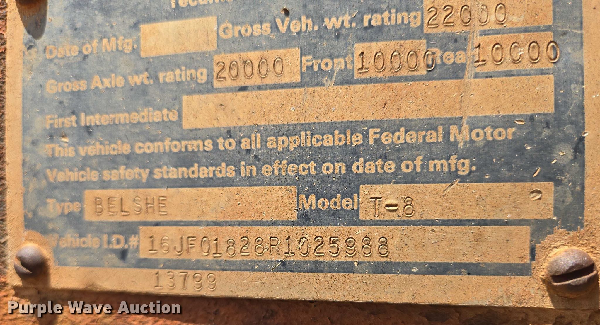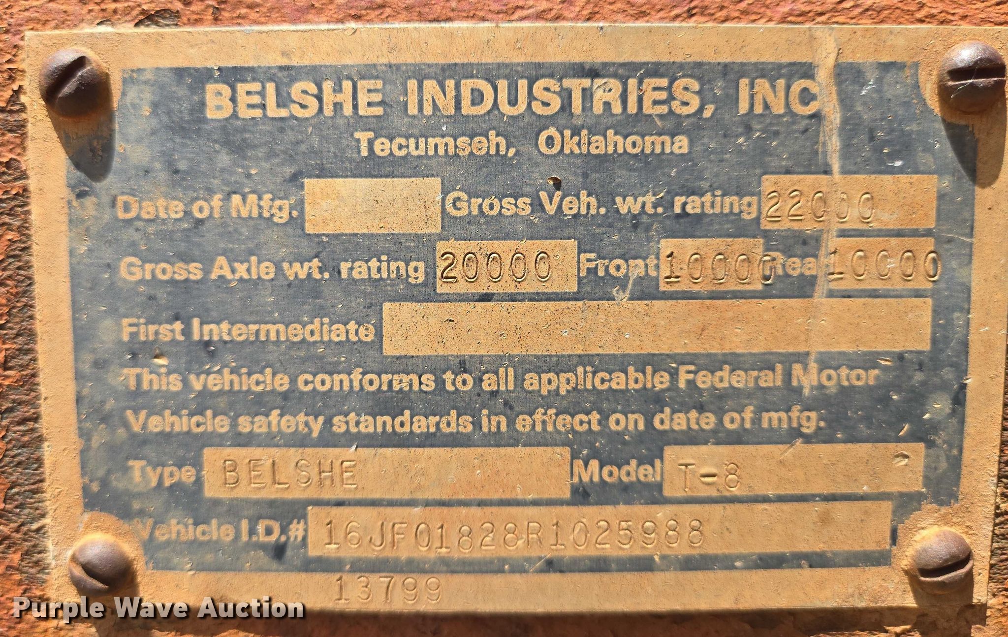 1994 Belshe T-8 equipment trailer. VIN: 16JF01828R1025988. Dimensions Overall: 28' L x 96" W, Deck: 18' L x 96" W, Tail length: 5' 5", Hydraulic tail length: 60", Ramps: Manual. Features Deck type: Wood. Chassis Hitch: Pintle, Landing gear: Dual, Suspension: Spring, Brakes: Electric, Axles: Tandem, GVWR: 22,000 lbs, GAWR: 20,000 lbs. Tires Steel wheels, Size: 7.50R16. Notes Deck boards damaged. Oklahoma title. Title distribution may be delayed up to 14 days from verification of funds. Pioneer Telephone Company. Kingfisher, OK 73750