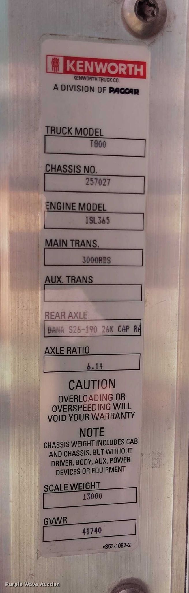 Purple Wave is selling a used Truck Chassis in Colorado. This item is a 2009 Kenworth T800 spreader truck with the following: Miles: 52,899 on odometer, Hours: 4,853 on meter, VIN: 1NKDH58X09J257027