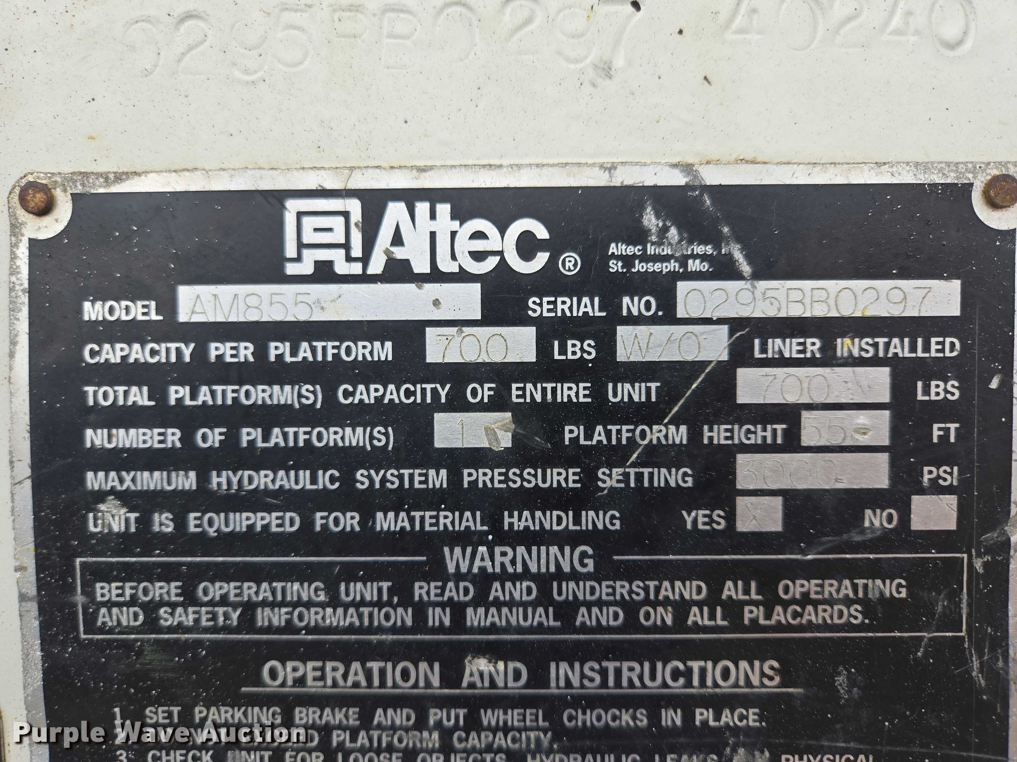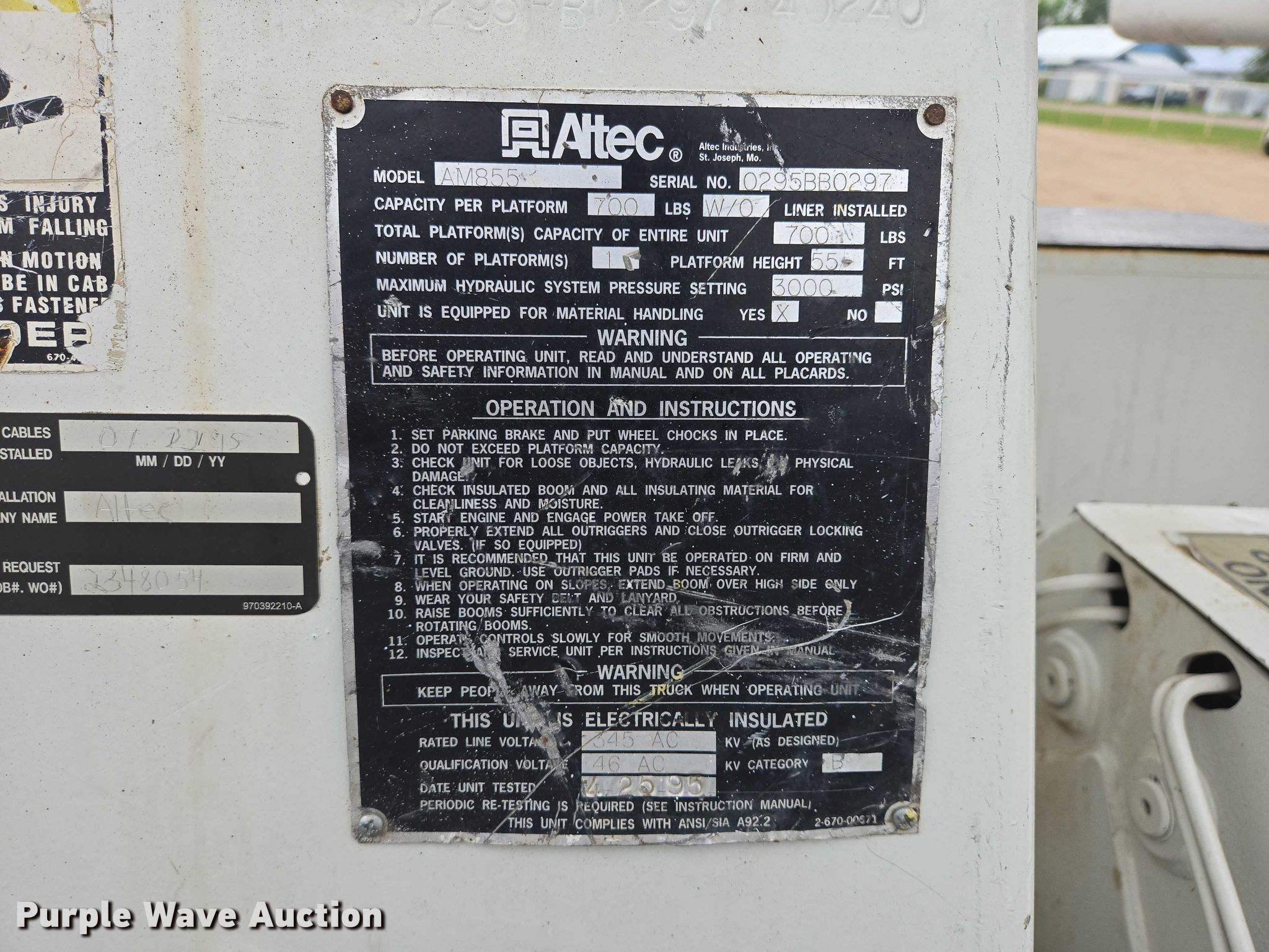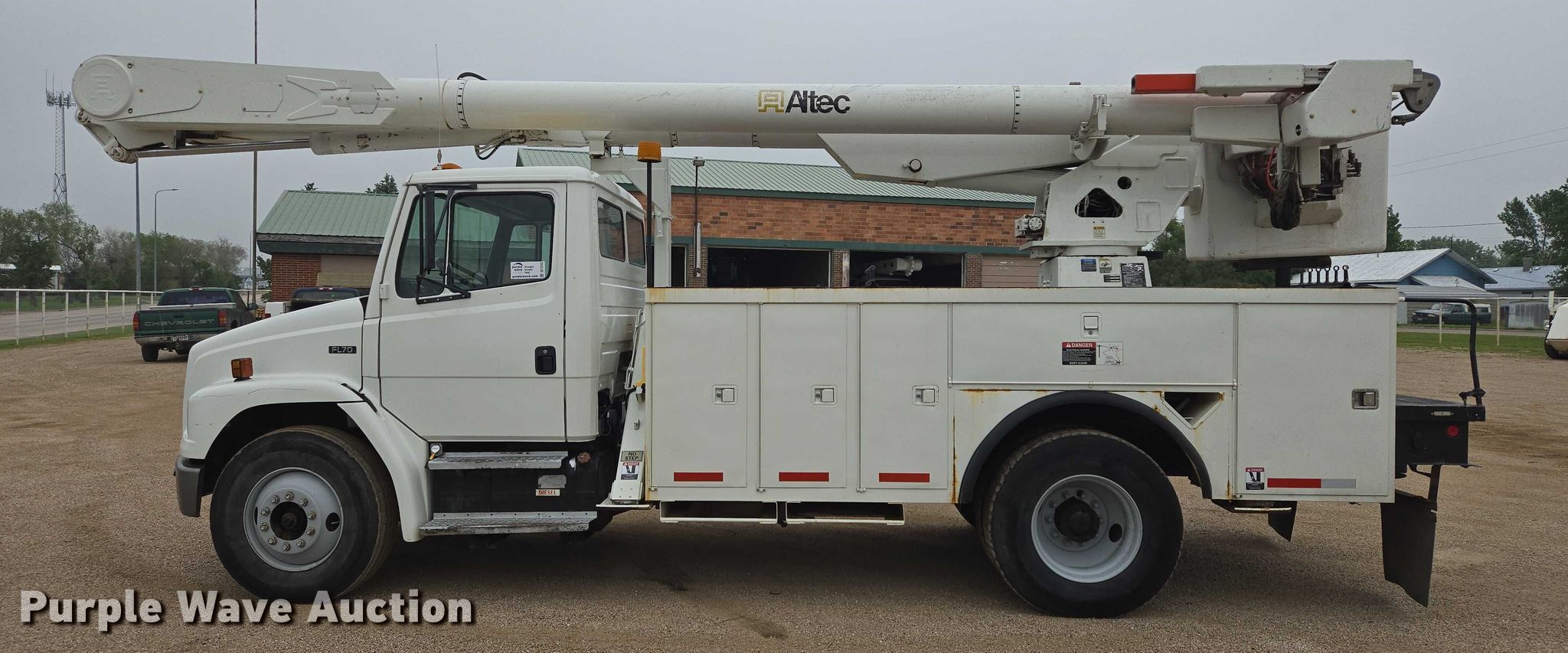 1995 Freightliner FL70 bucket truck. Miles: 72,012 on odometer, Hours: 13,027 on meter, VIN: 1FV6HFBA4SL753659. Engine Cummins, Displacement: 5.9L, Cylinders: 6, Fuel type: Diesel. Transmission Allison, Automatic. Chassis Axles: Single, Suspension: Spring, Brakes: Air, PTO. Interior Heat, Brake controller. Features Bed Altec, 14' 10" L x 93" W, Boom Altec AM855, Serial: 0295BB0297, Maximum lift capacity: 700 lbs, Maximum lift height: 55', Boom type: Articulating, Insulated, Man basket, Boom controls Ground, Platform/ basket, Material handler. Tires Size: 11R22.5. Notes Hydraulic leak. South Dakota title. Title distribution may be delayed up to 14 days from verification of funds. City of Faith, SD. Faith, SD 57626