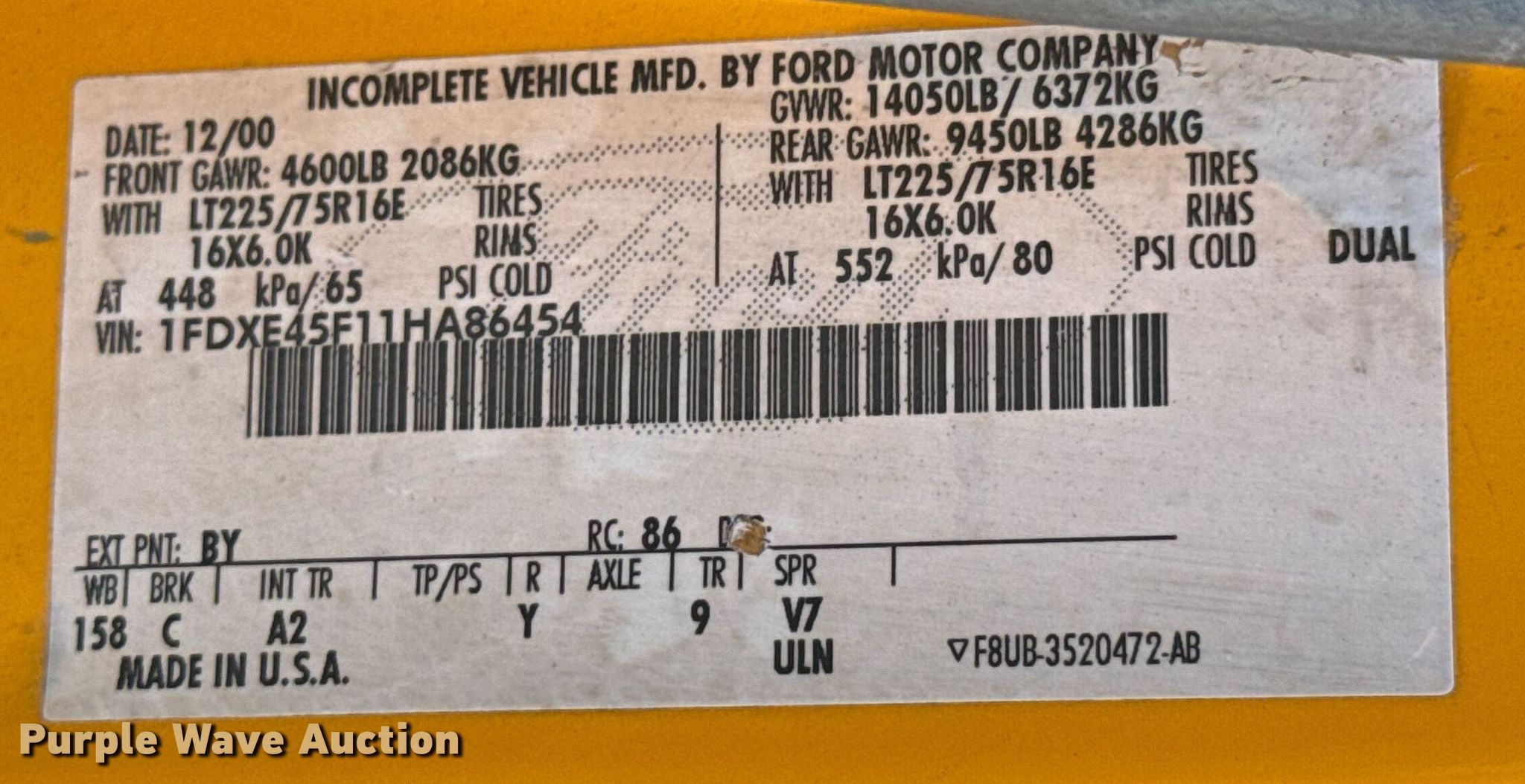 2001 Ford E450 Super Duty school bus. Miles: 183,032 on odometer, VIN: 1FDXE45F11HA86454. Engine Displacement: 7.3L, Cylinders: 8, Fuel type: Diesel. Transmission Automatic. Chassis Axles: Single, Suspension: Spring, Brakes: Hydraulic, GVWR: 14,050 lbs, Wheelbase: 158". Interior AC, Heat, Heated mirrors, Auxiliary controls, Passengers: 12, Wheelchair lift. Tires Size: 225/75R16. Kansas title. Title distribution may be delayed up to 14 days from verification of funds. USD 506 Labette County Schools. Altamont, KS 67330