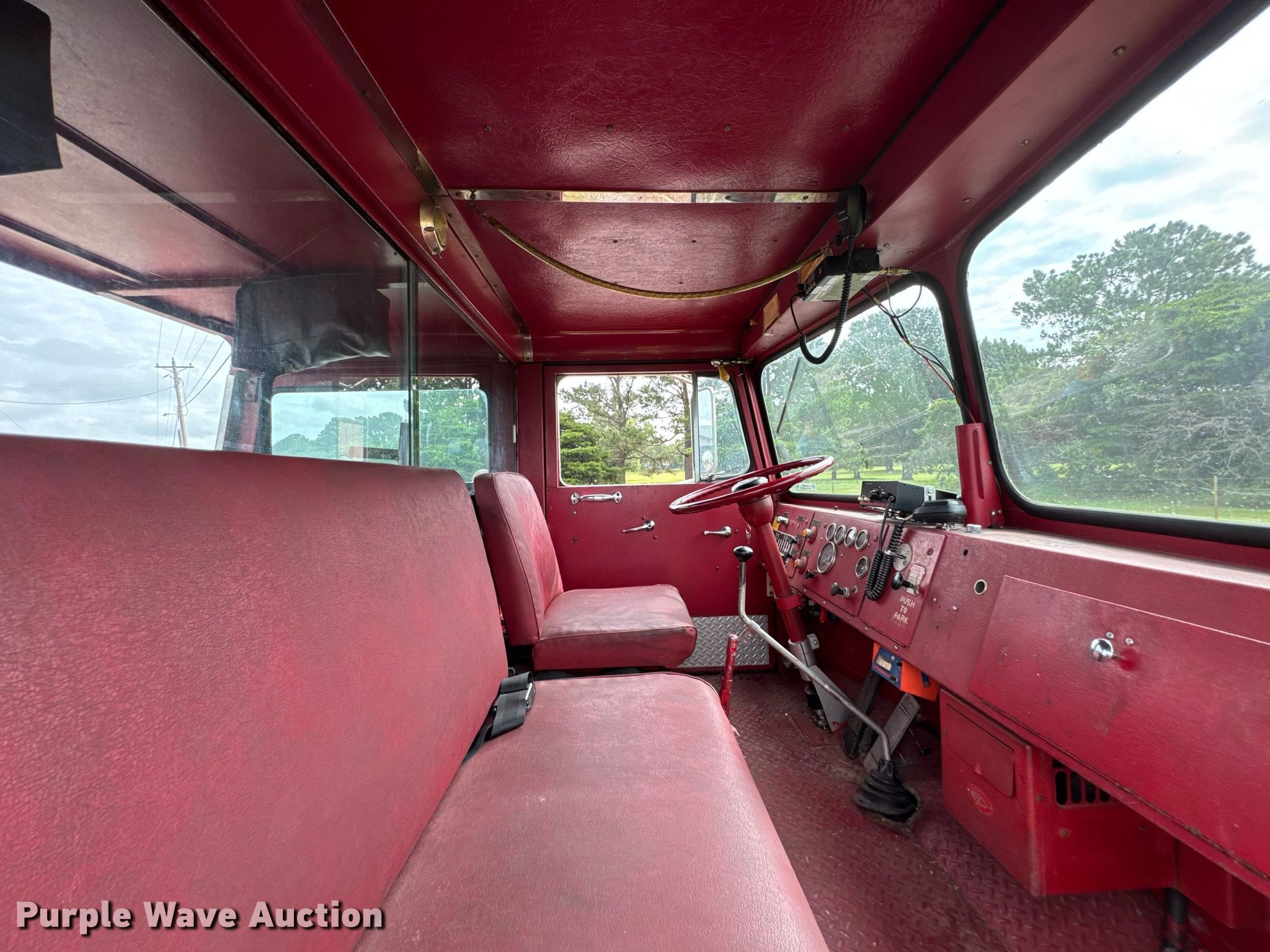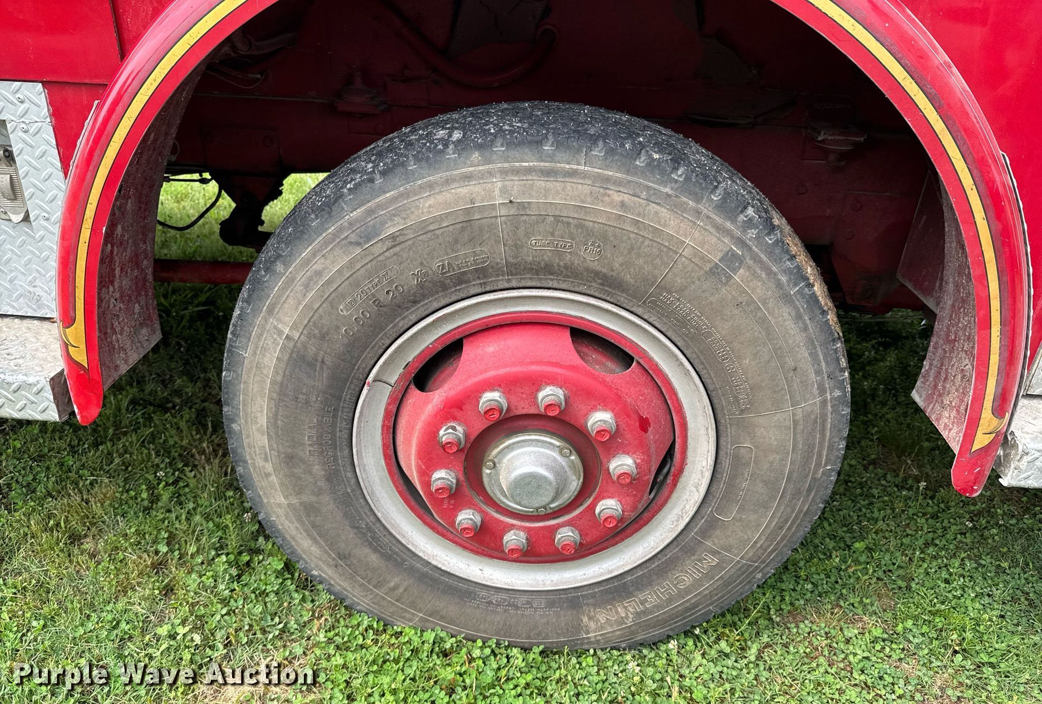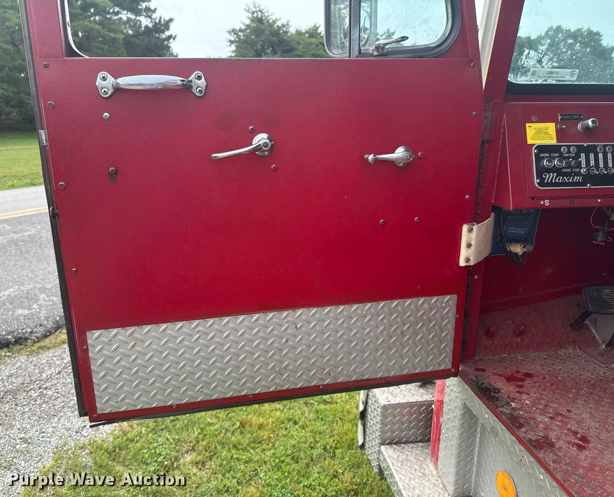 1975 Maxim Motor pumper fire truck. Miles: 24,710 on odometer, VIN: 43249. Engine Cylinders: 6, Fuel type: Gas. Transmission Manual, Speed: 5. Chassis Axles: Single, Suspension: Spring, Brakes: Air, GVWR: 33,280 lbs. Interior Auxiliary controls. Features Fire truck body Maxim Fire, Tank Capacity: 1,500 gallons, Pump 1,000 gpm, PA/ siren controls, Dynamote inverter. Tires Size: 10.00R20. Notes Radio will be removed prior to auction. Oklahoma title. Title distribution may be delayed up to 30 days from verification of funds. Cleora Fire Department. Afton, OK 74331