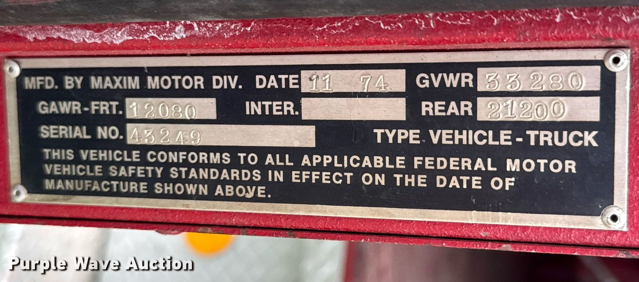 Purple Wave is selling a used Fire Truck or Emergency Vehicle in Oklahoma. This item is a 1975 Maxim Motor pumper fire truck with the following: Miles: 24,710 on odometer, VIN: 43249