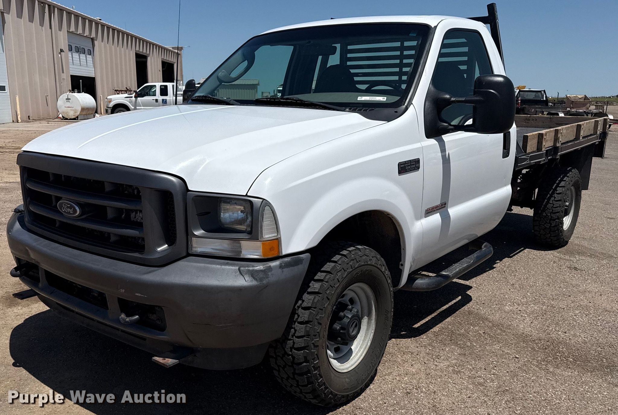 This 2003 Ford F250 Super Duty flatbed pickup truck will sell to the highest bidder regardless of price.