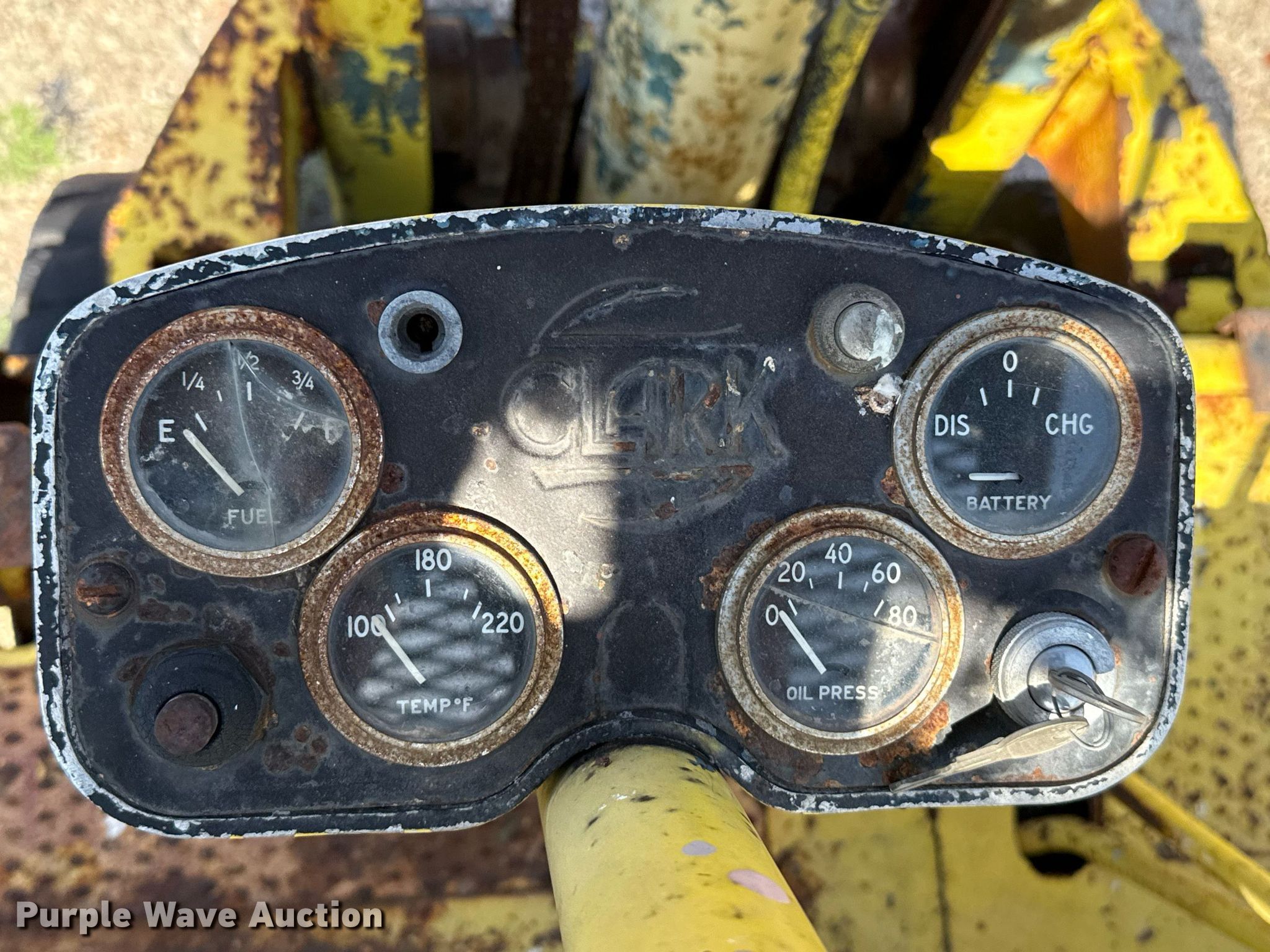 Clark forklift. Hours: Unknown. Engine Cylinders: 4, Fuel type: Gas. Transmission Shuttle shift, 2F - 2R. Operators station Canopy. Features Mast stages: 2, Mast tilt. Tires Front: 21x7x15, Rear: Unknown, Solid. Notes Forks missing, Non-operational unit. Ford County Road & Bridge. Dodge City, KS 67801