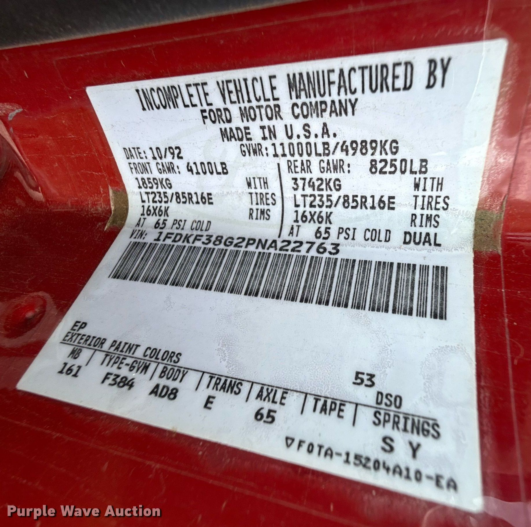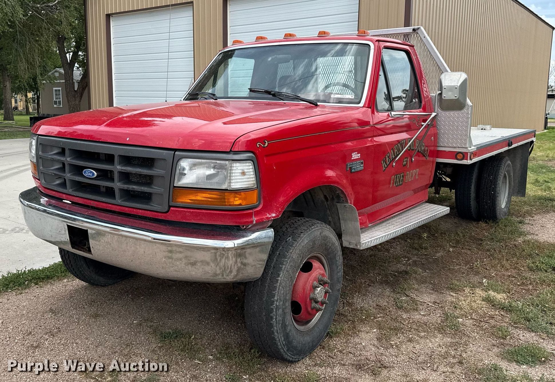 1993 Ford F350 flatbed pickup truck. Miles: 18,625 on odometer, VIN: 1FDKF38G2PNA22763. Engine Displacement: 7.5L V8 OHV, Cylinders: 8, Fuel type: Gas. Transmission Automatic, Four wheel drive. Interior Heat. Features Flatbed 10' L x 96" W. Tires Size: 235/85R16. Notes Dash warning indicator: ABS, Brake. Kansas title. Title distribution may be delayed up to 14 days from verification of funds. Kearny County EMS. Deerfield, KS 67838