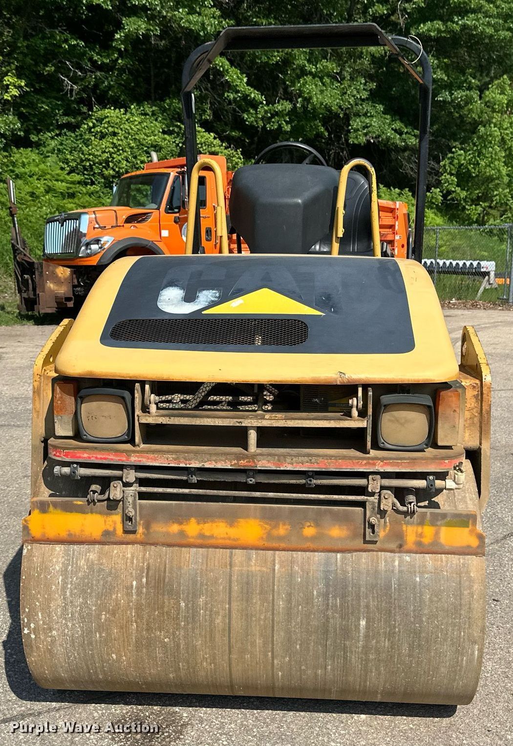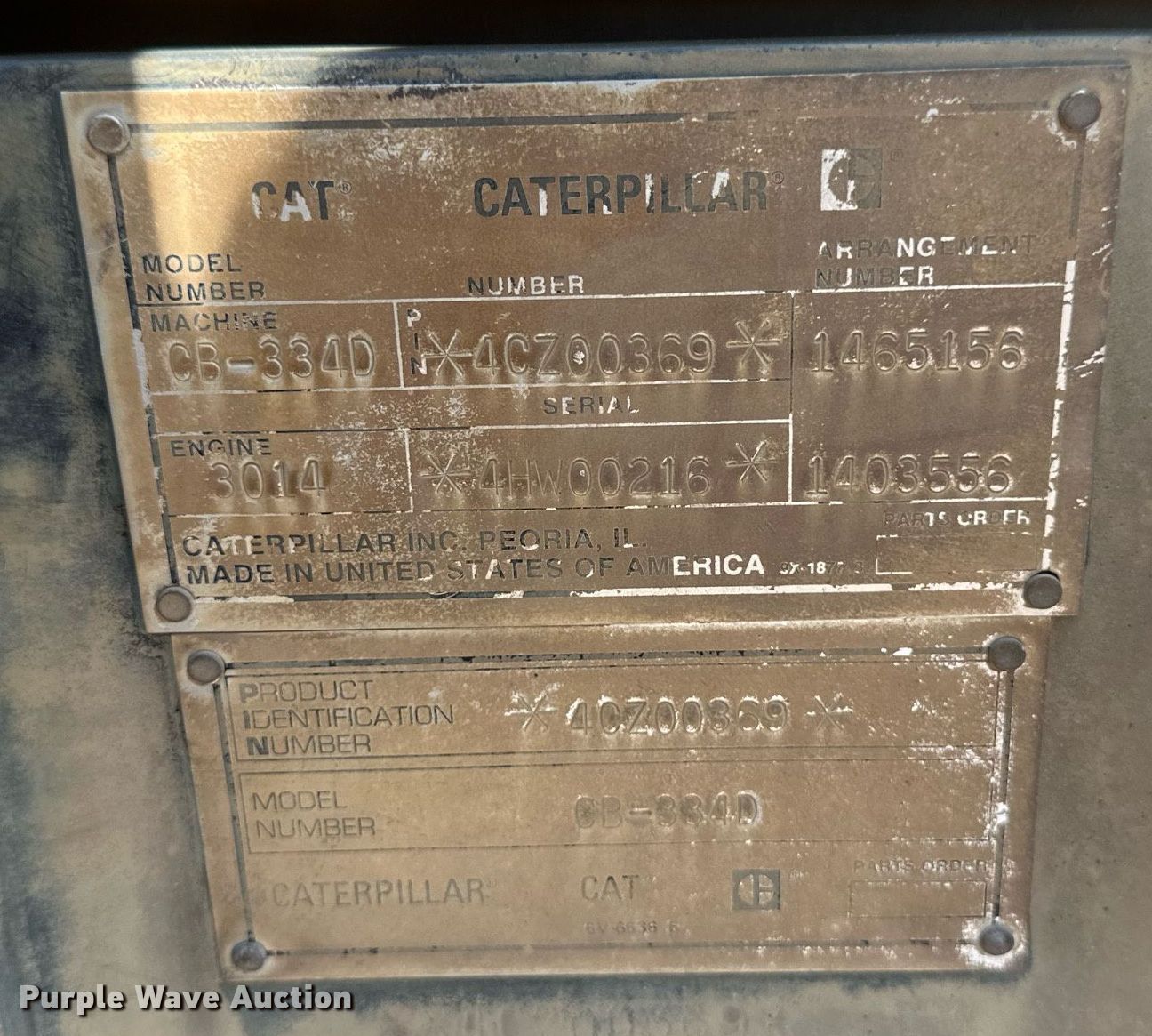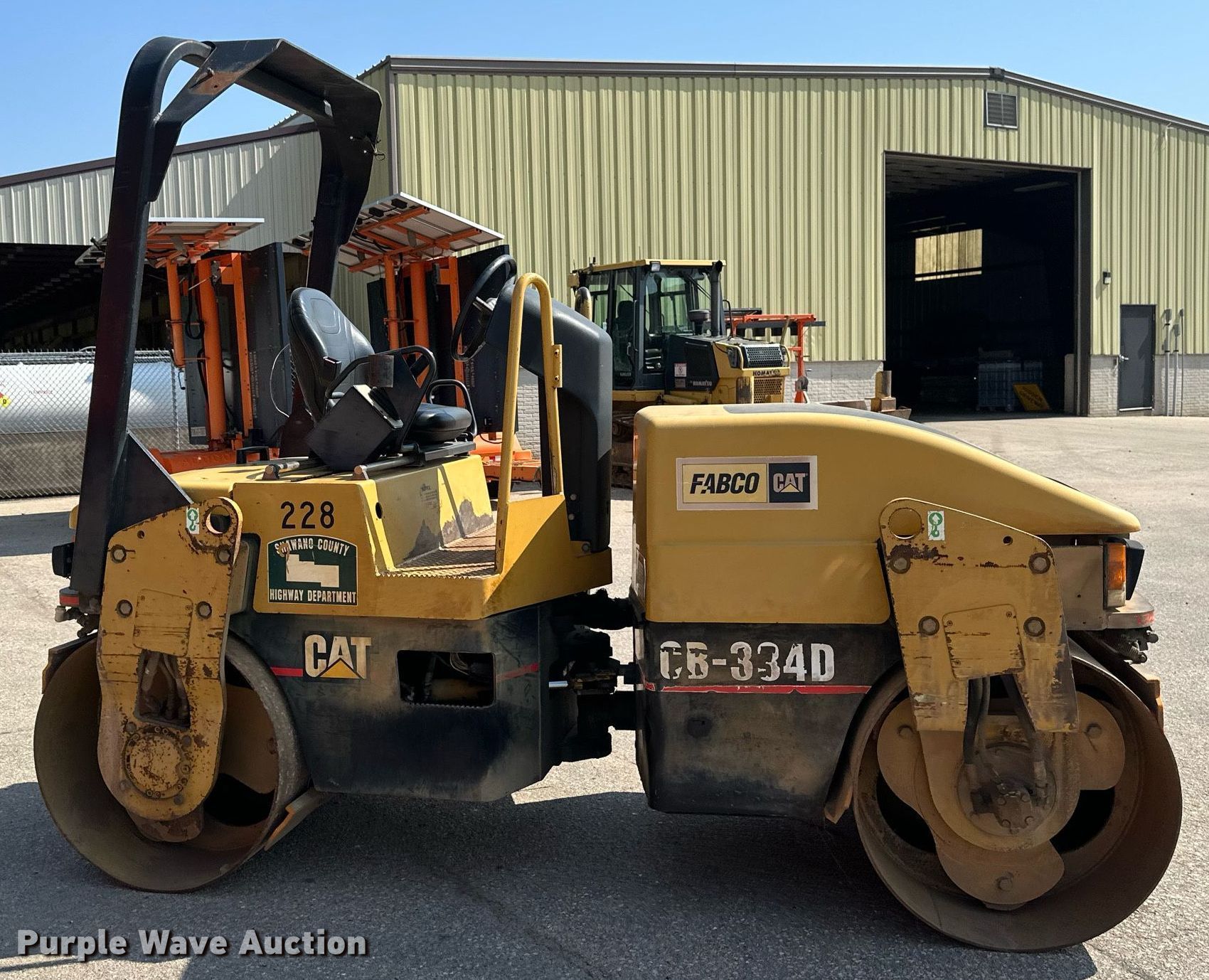 2000 Caterpillar CB334D double drum roller. Hours: 5,778 on meter, Serial: 4HW00216. Engine Caterpillar Perkins, Cylinders: 4, Fuel type: Diesel. Transmission Hydrostatic. Operators station Vandal cover. Features Drum: Smooth, Vibratory system: Double, Independent drum controls, Front drum Width: 51", Diameter: 31", Rear drum Width: 51", Diameter: 31", Drum scrapers: Front, Rear, Water spray applicator: Front, Rear. Shawano County Highway Department, WI. Shawano, WI 54166