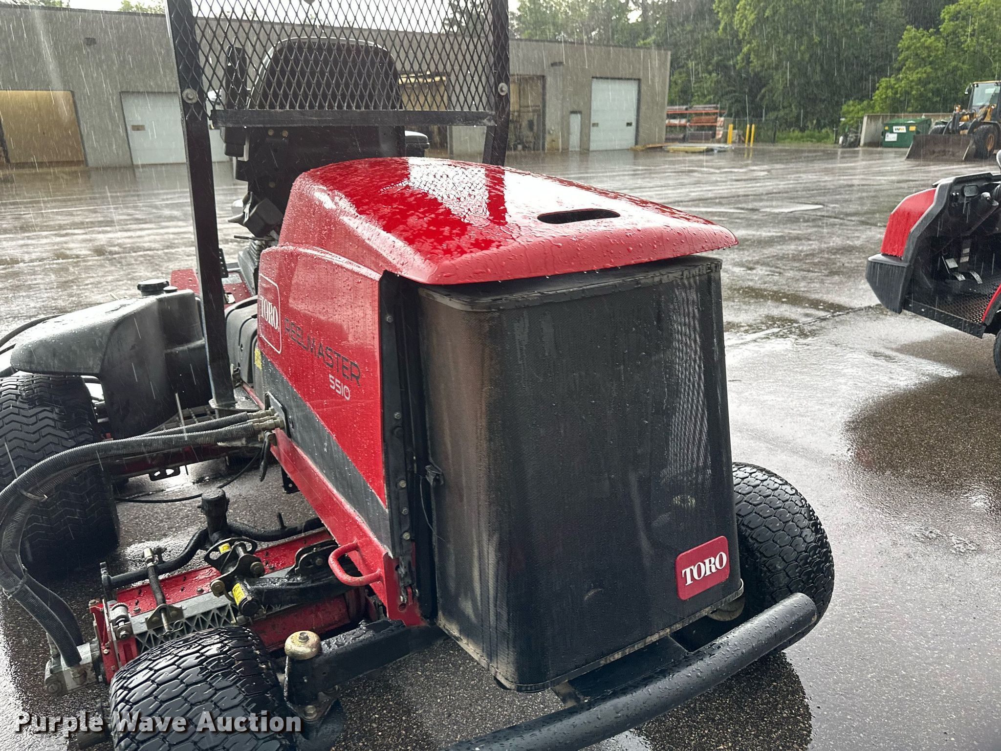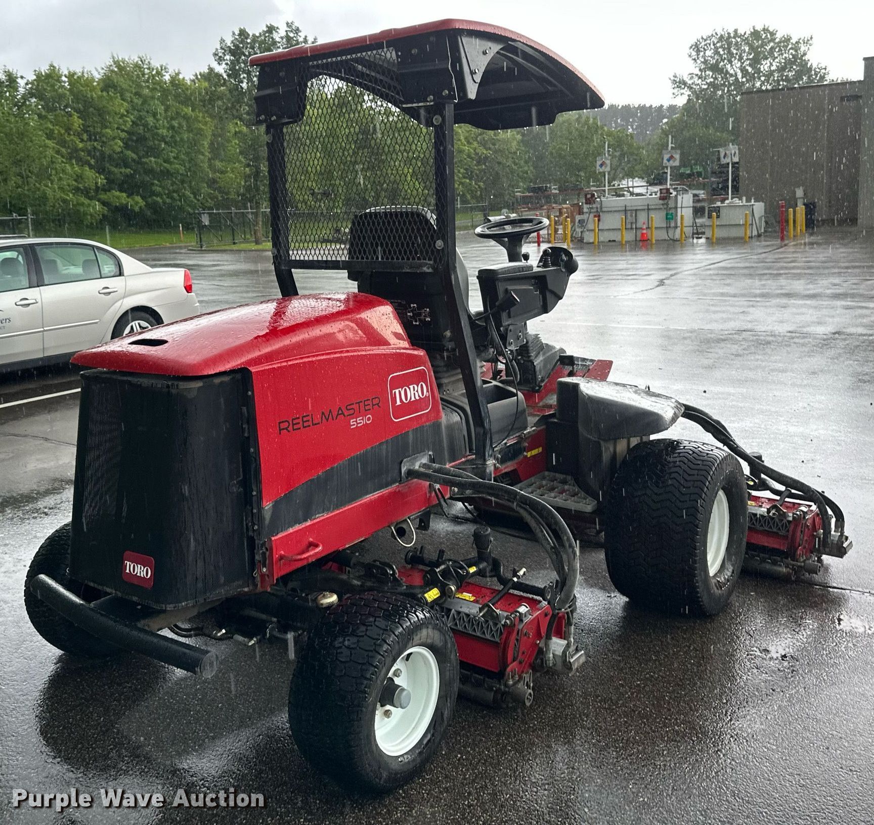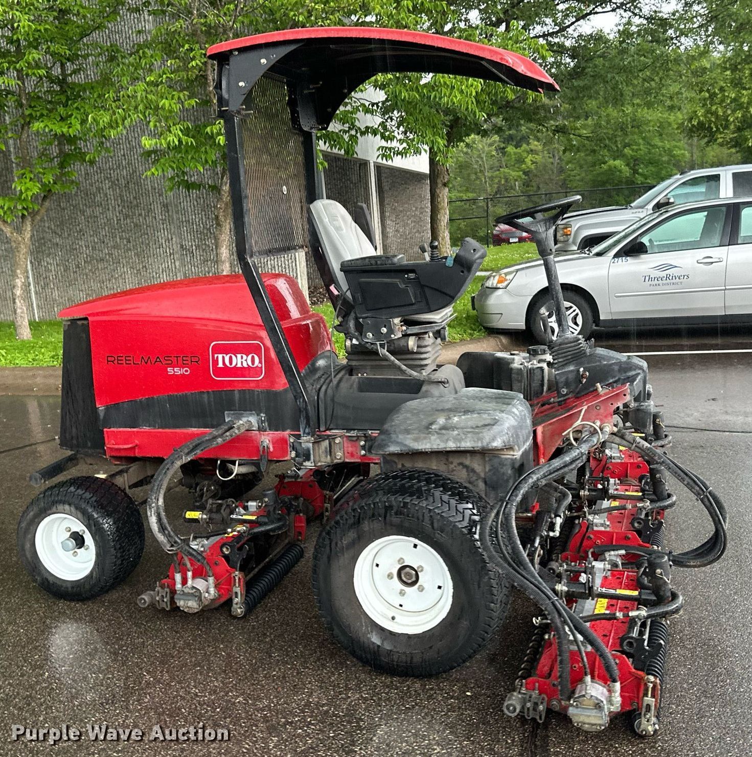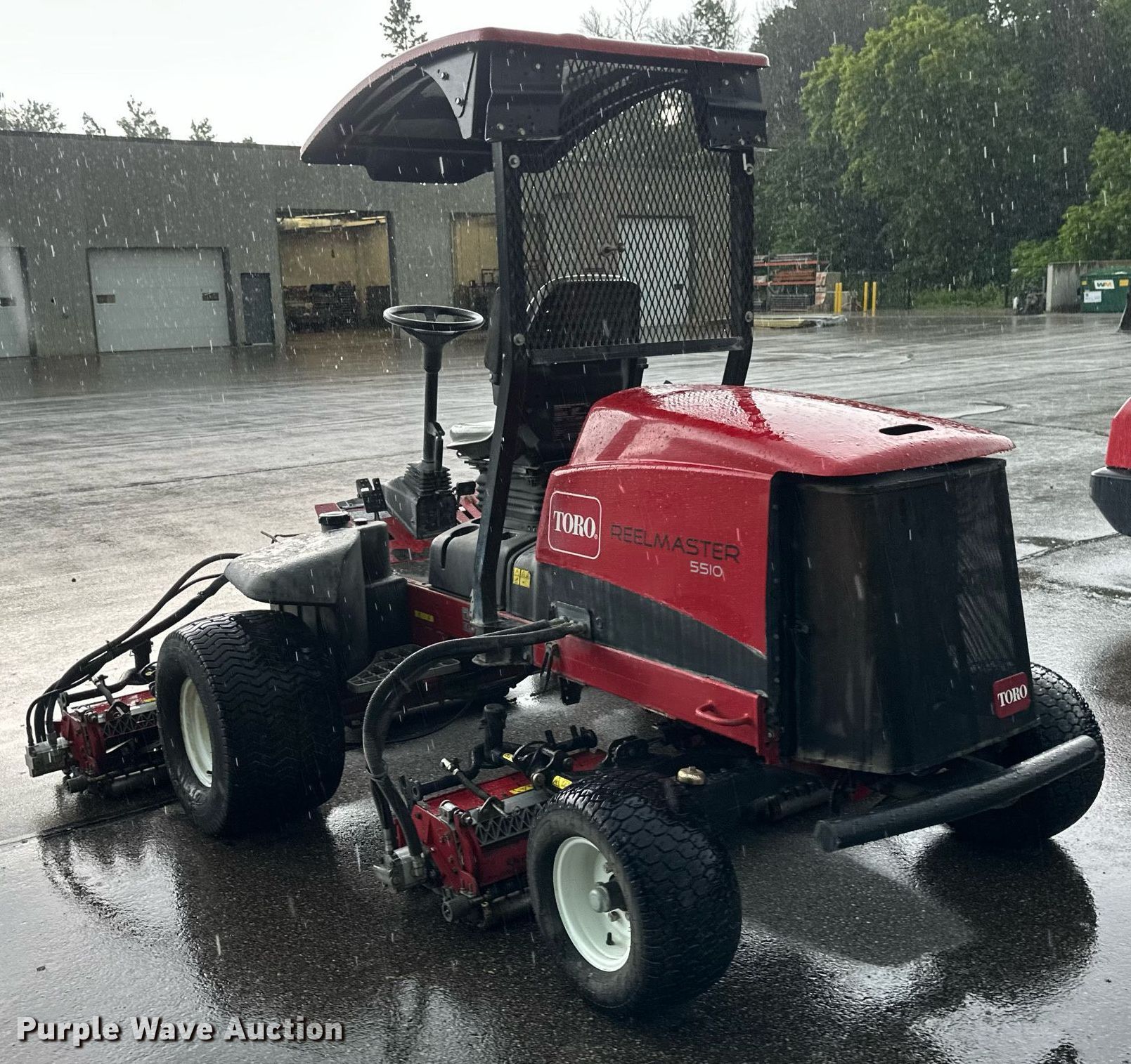 Toro 5510 Reelmaster reel mower. Hours: 2,634 on meter, Cutting width: 102", Serial: 270000208. Engine Kubota V1505, Displacement: 1.5L, Cylinders: 3, Fuel type: Diesel. Transmission Hydrostatic. Chassis PTO. Features Hydraulic front deck lift. Tires Front: 26x14.00-12, Rear: 20x12.00-10. Three Rivers Parks. Maple Plain, MN 55359