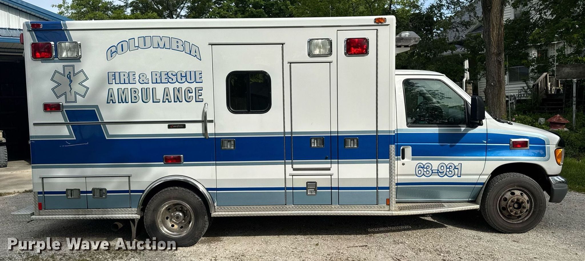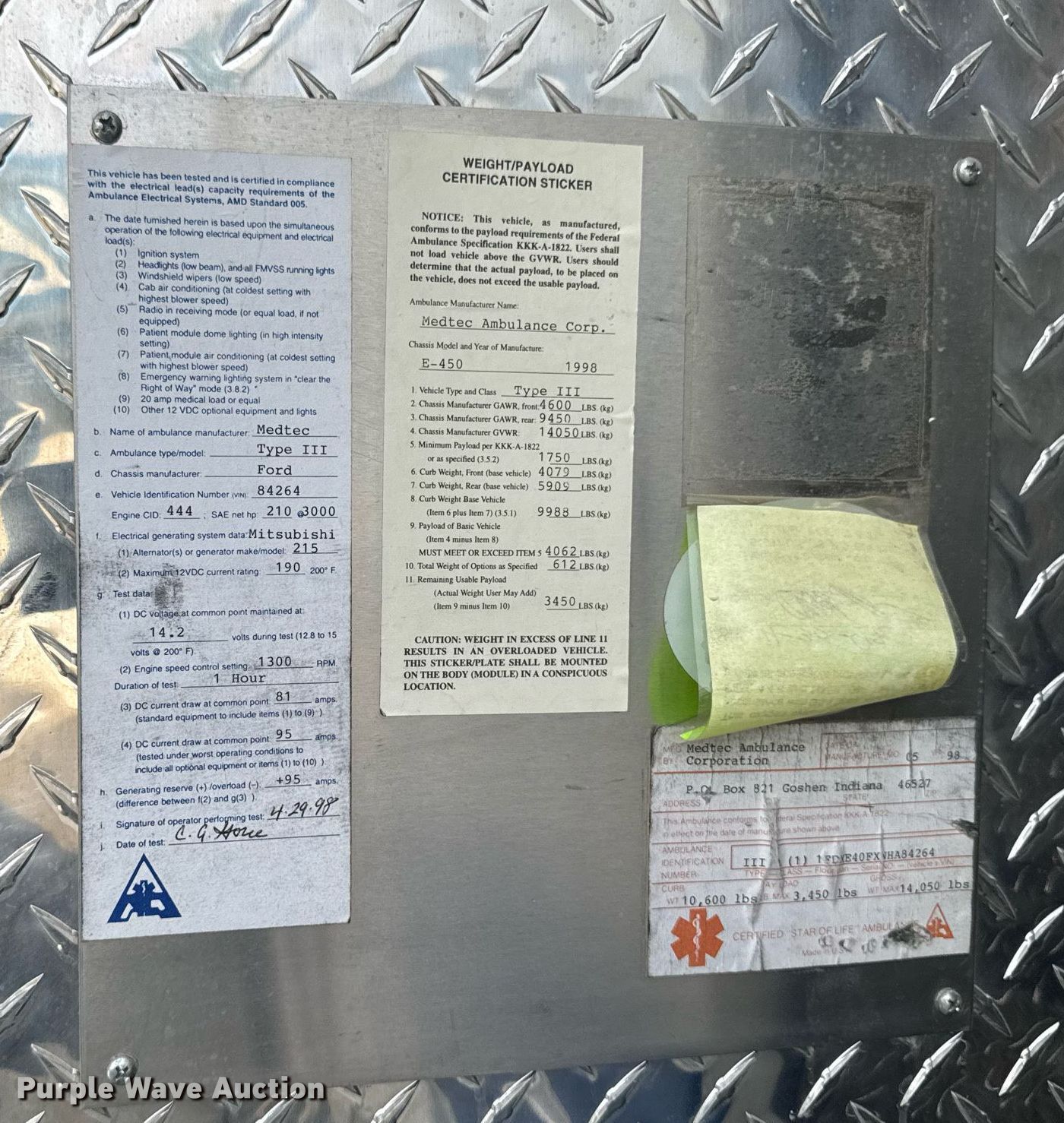 1998 Medtec Ford E450 Super Duty ambulance. Miles: 184,529 on odometer, Hours: 5,908 on meter, VIN: 1FDXE40FXWHA84264. Engine Displacement: 7.3L V8 OHV, Cylinders: 8, Fuel type: Diesel, HP: 205. Transmission Automatic. Chassis Axles: Single, Suspension: Spring, Brakes: Hydraulic, GVWR: 14,050 lbs. Interior AC, Heat, Power windows, Power locks, Cruise control, Auxiliary controls. Features Ambulance body Medtec, PA/ siren controls, Oxygen hookups. Tires Size: 225/75R16. Notes Dash warning indicator: Brake. Iowa title. Seller is a government entity who will be assigning and distributing the title. Please contact the seller for distribution questions. Columbia, IA 50057