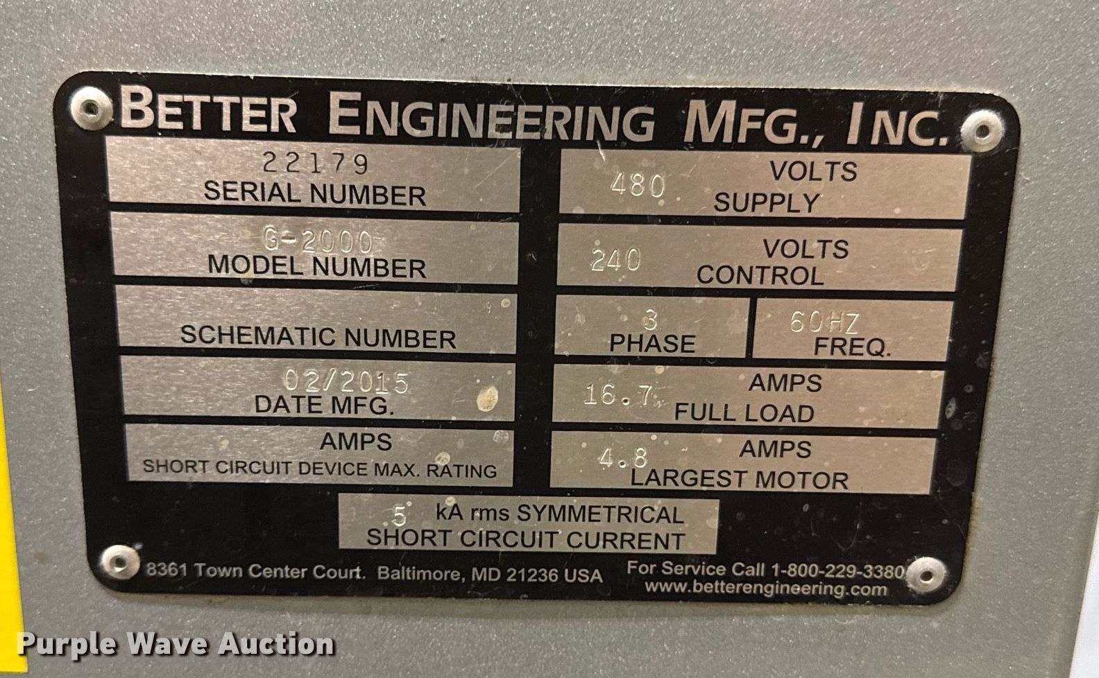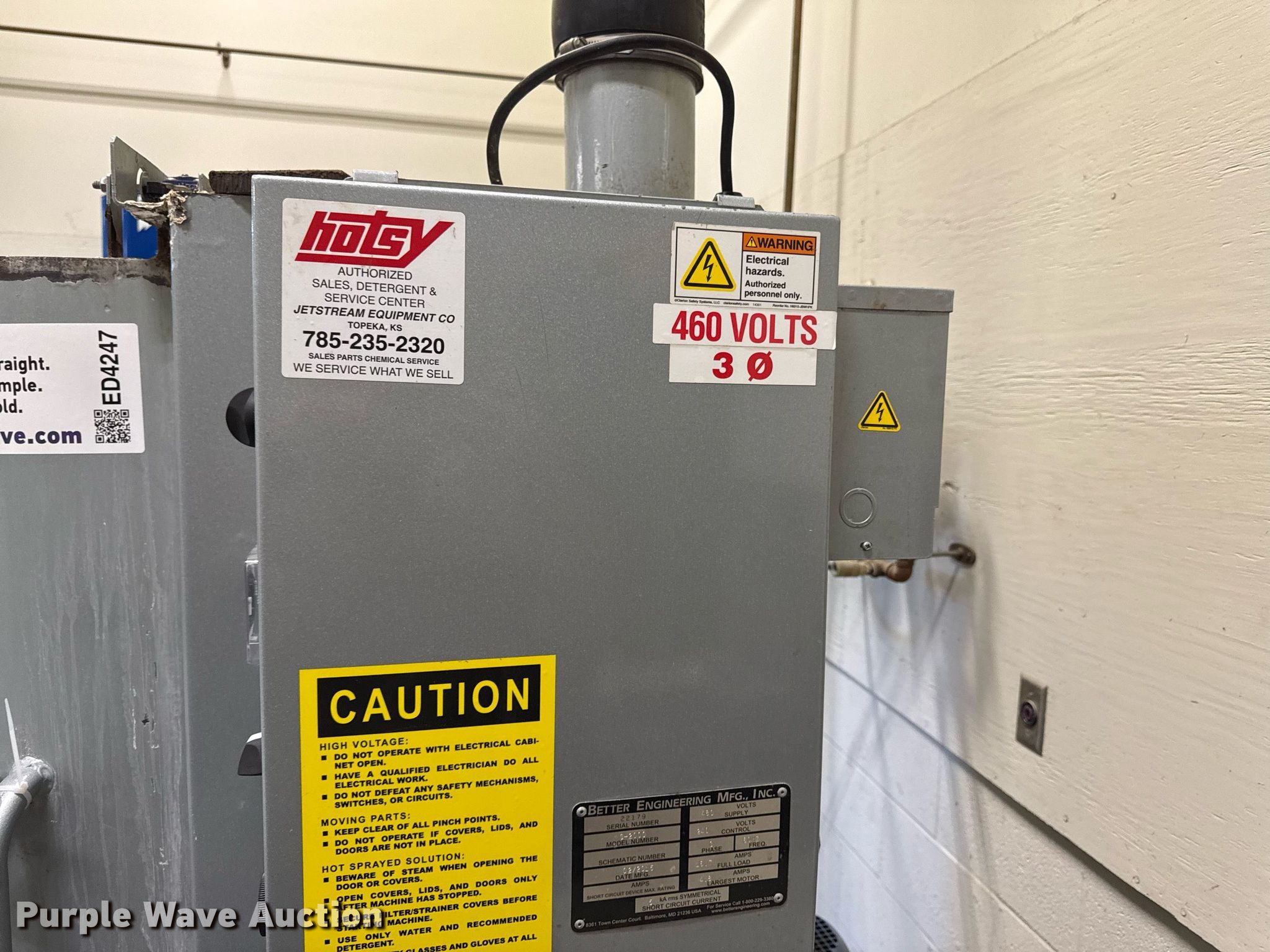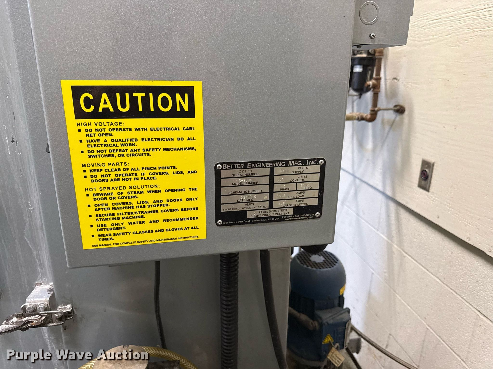 2015 Better Engineering G-2000 parts washer. Serial: 22179. Electric motor Volts: 240/480, Phase: Three, Hertz: 60. Notes Possible heat control clock issues. Douglas County. Lawrence, KS 66046