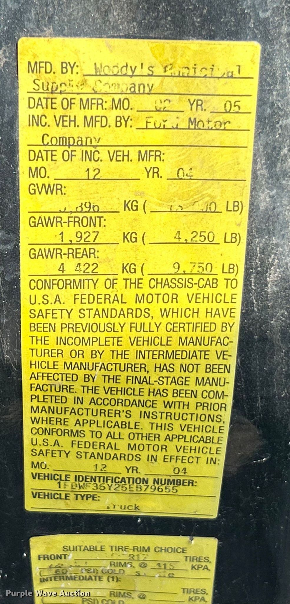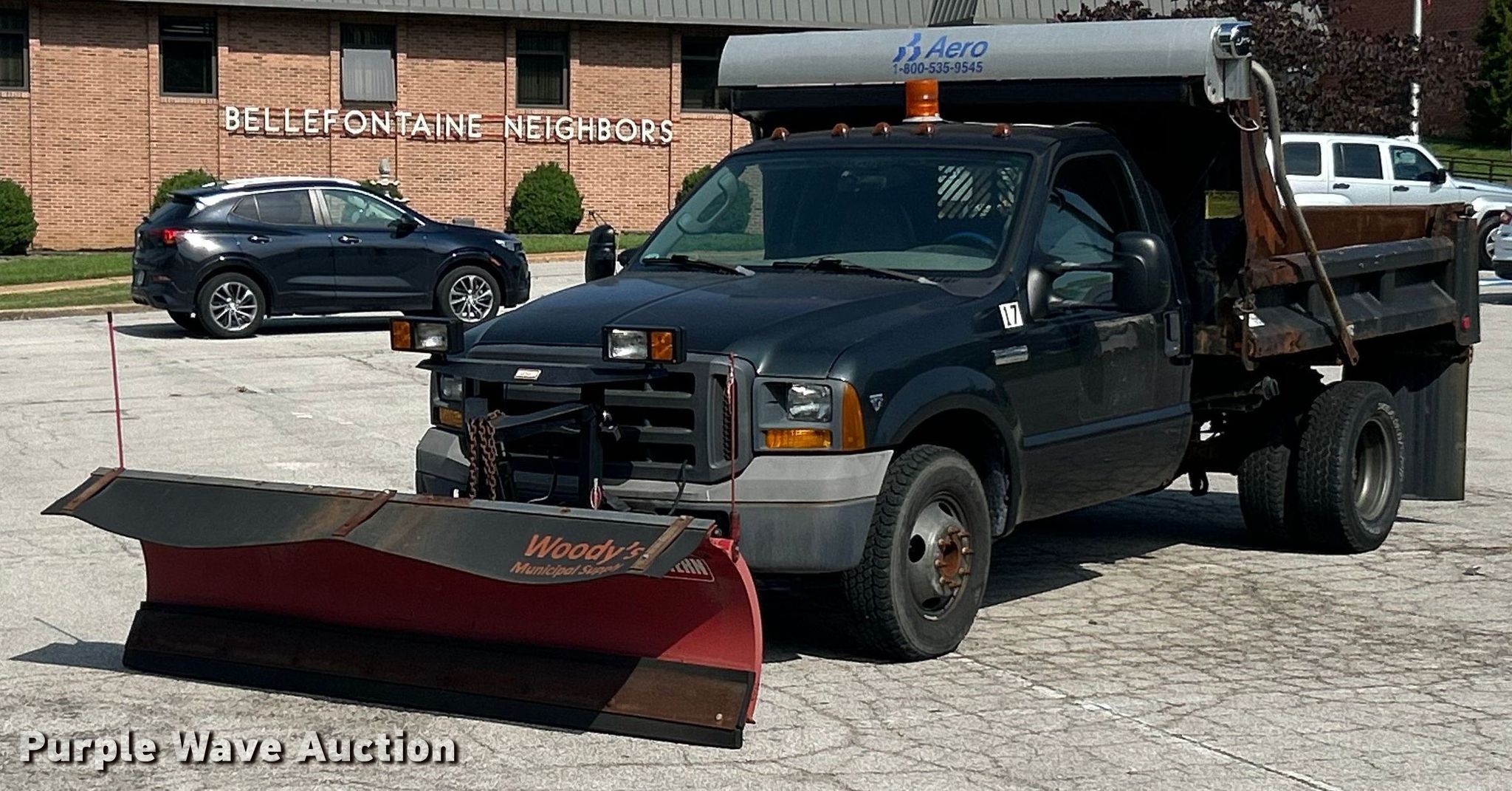 2005 Ford F350 Super Duty XL dump bed pickup truck. Miles: 50,820 on odometer, VIN: 1FDWF36Y25EB79655. Engine Displacement: 6.8L V10 SOHC, Cylinders: 10, Fuel type: Gas. Transmission Automatic. Interior AC, Heat. Features Dump bed Rugby, 8' L x 96" W, Snow plow Width: 102". Tires Size: 245/75R17. Notes Dash warning indicator: Check engine, Possible AC issues, may need charged. Missouri title. Seller is a government entity who will be assigning and distributing the title. Please contact the seller for distribution questions. City Of Bellefontaine Neighbors, MO. Bellefontaine Neighbors, MO 63137
