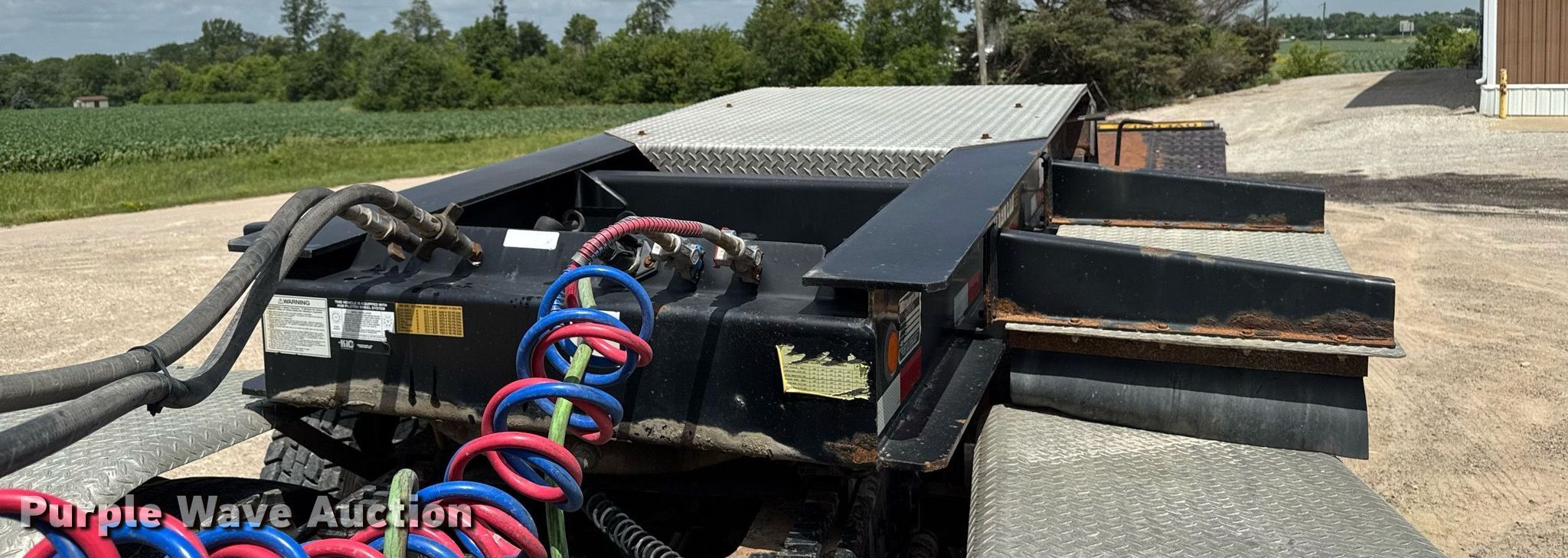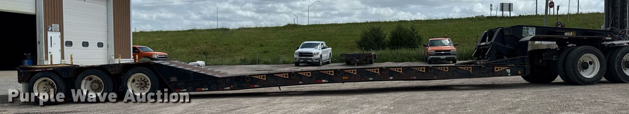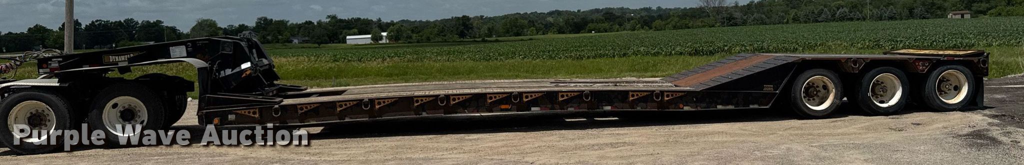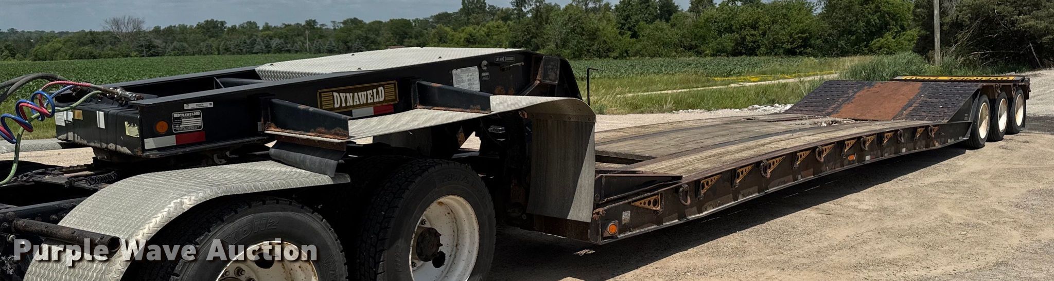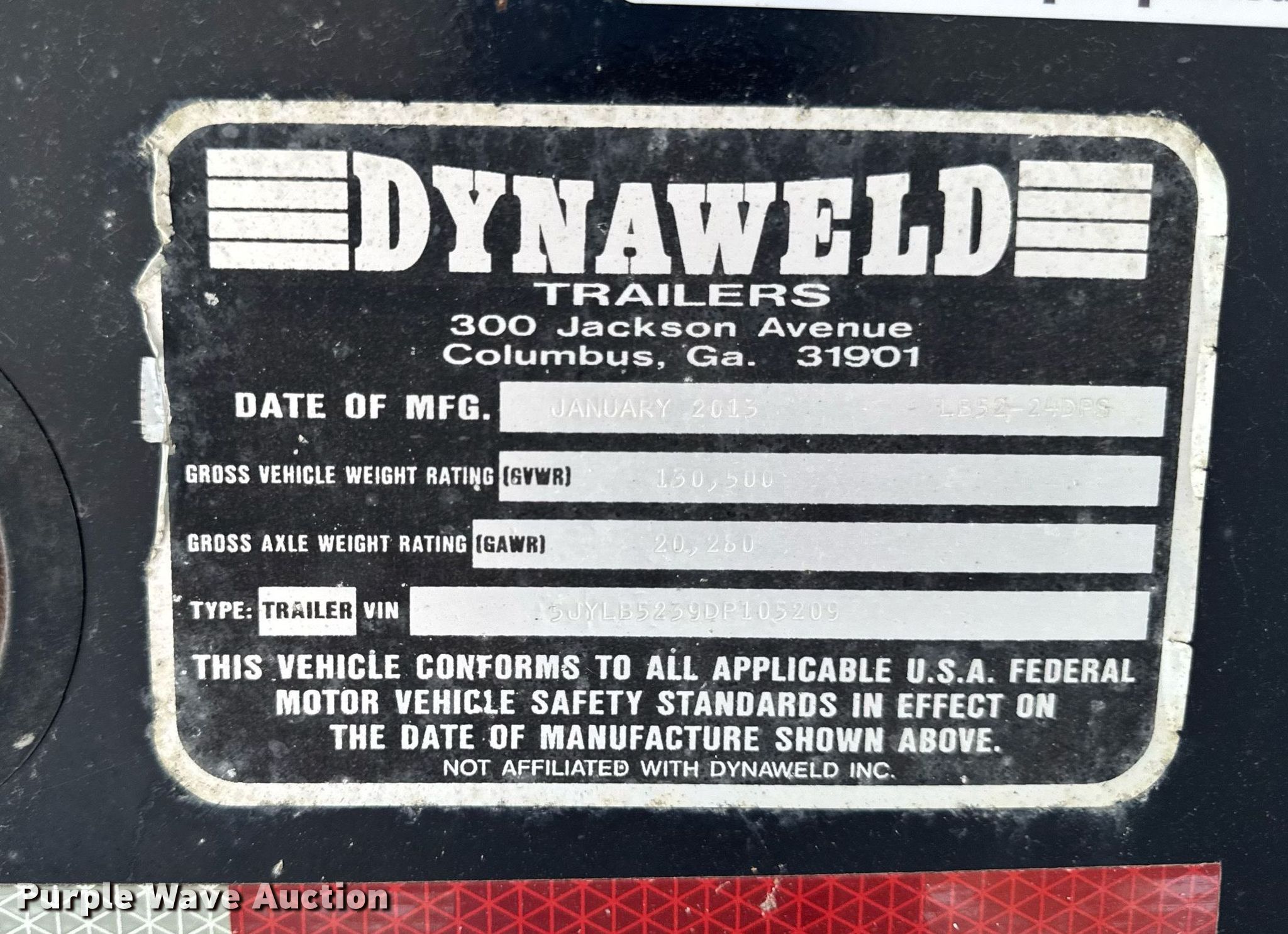 2013 Dynaweld LB52-24DPS lowboy equipment trailer. VIN: 5JYLB5239DP105209. Dimensions Overall: 52' L x 102" W, Deck: 27' L x 102" W, Rear deck length: 17', Ramps: Manual Length: 4'. Features Deck type: Steel, Wood, Outriggers: Swing-out Board size: 14", Neck type: Detachable, Hydraulic controls: Manual. Chassis Suspension: Air, Brakes: Air, Axles: Triple, GVWR: 130,500 lbs, GAWR: 20,280 lbs. Tires Steel wheels, Size: 255/70R22.5. Notes Semi not included. Iowa title. Marion, IA 52302