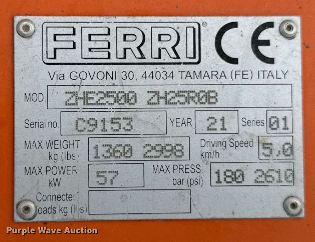 Purple Wave is selling a used Mower, Cutter, Shredder in Iowa. This item is a 2021 Ferri ZHE 2500 flail mower with the following: Serial: C9153