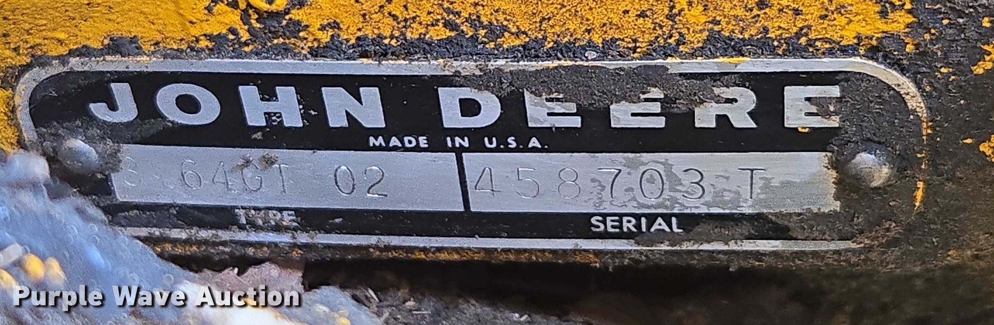 John Deere JD 302 tractor. Hours: 2,305 on meter, Serial: 299567T. Engine John Deere 3164GT 02, Serial: 458703 T, Cylinders: 3, Fuel type: Gas. Transmission Manual. Features PTO: 540, Three point Top link, Loader John Deere, Controls: Two-lever, Bucket Width: 72.75".. Tires Front: LT225/75R16, Rear: 14.9-24. Notes Non-operational brakes, Tires flat, Dead battery, Non-operational unit. City of Mount Vernon. Mount Vernon, MO 65712