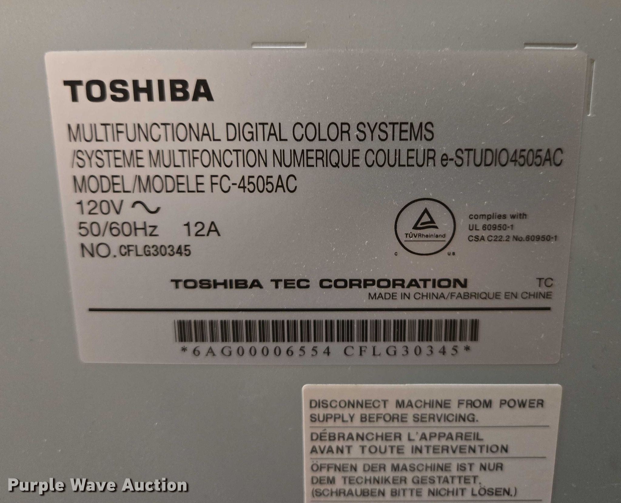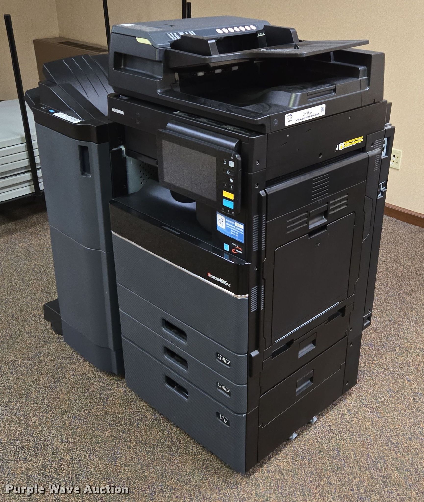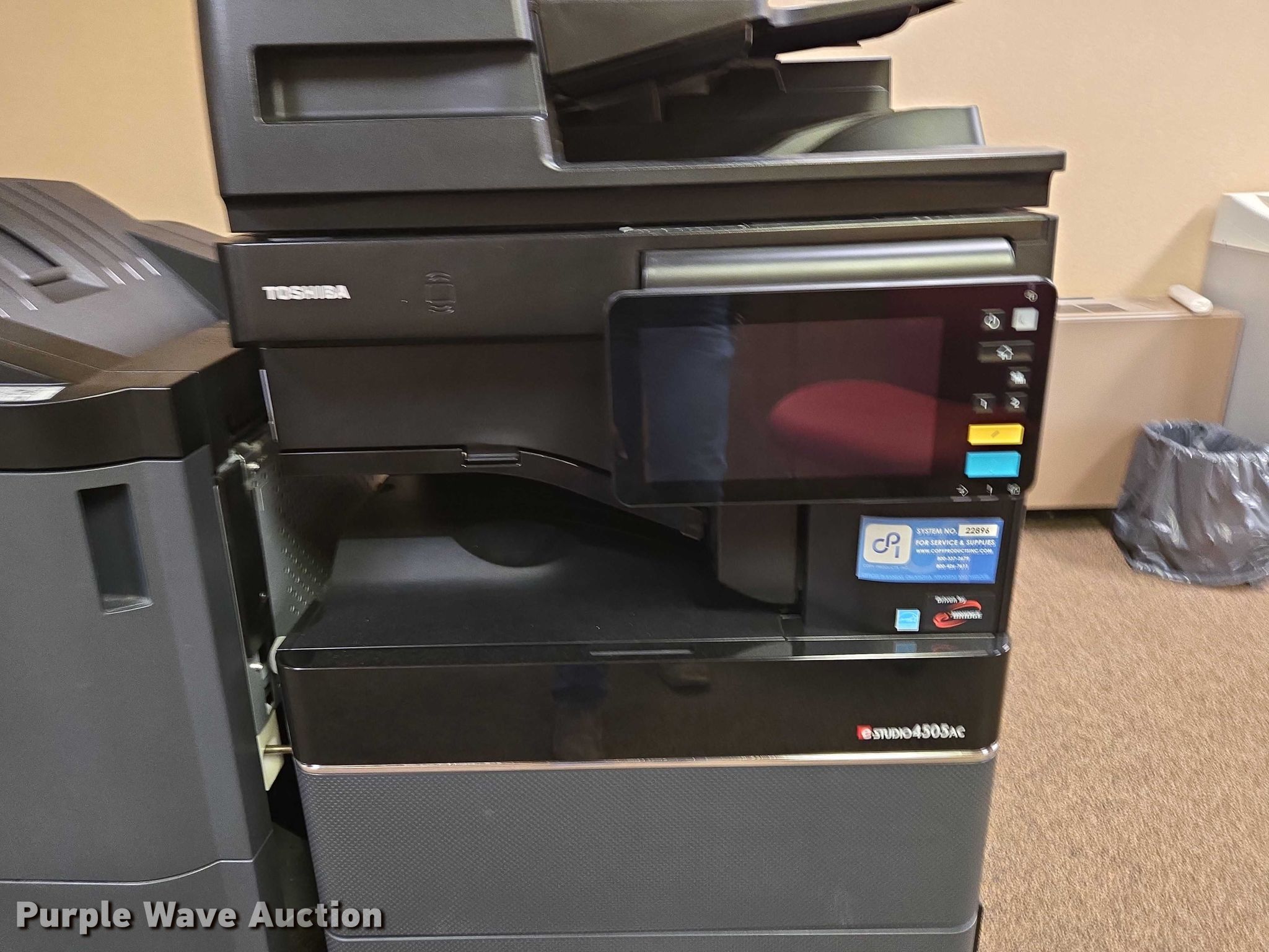 Purple Wave is selling a used Office Supplies and Equip. in Missouri. This item is a Toshiba e-studio4505AC printer with the following: Serial: CFLG30345, Toshiba Finisher Machine, Serial: MIK729760