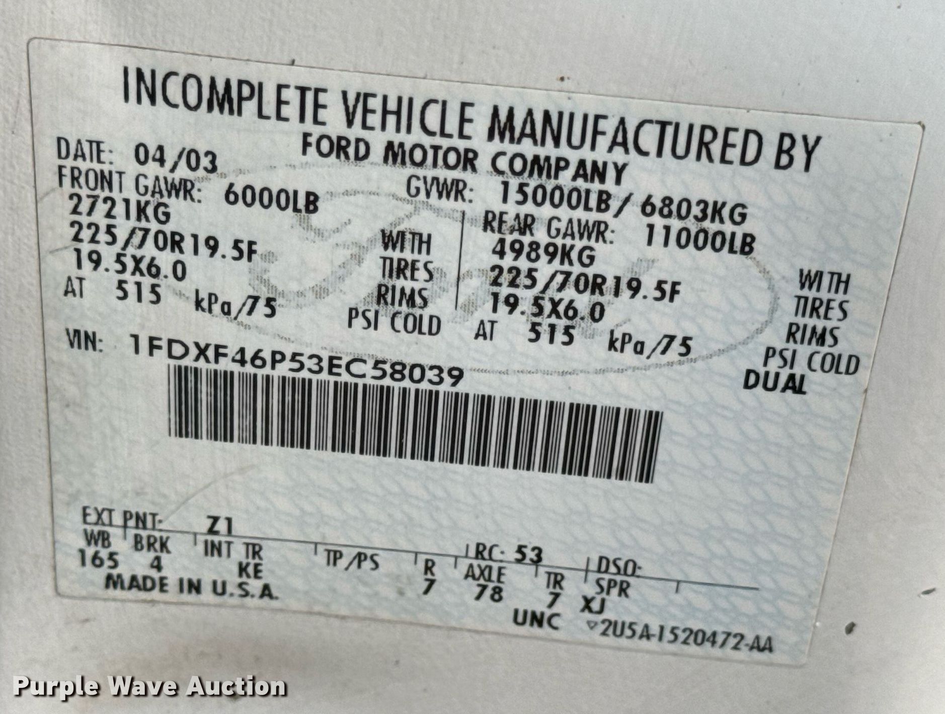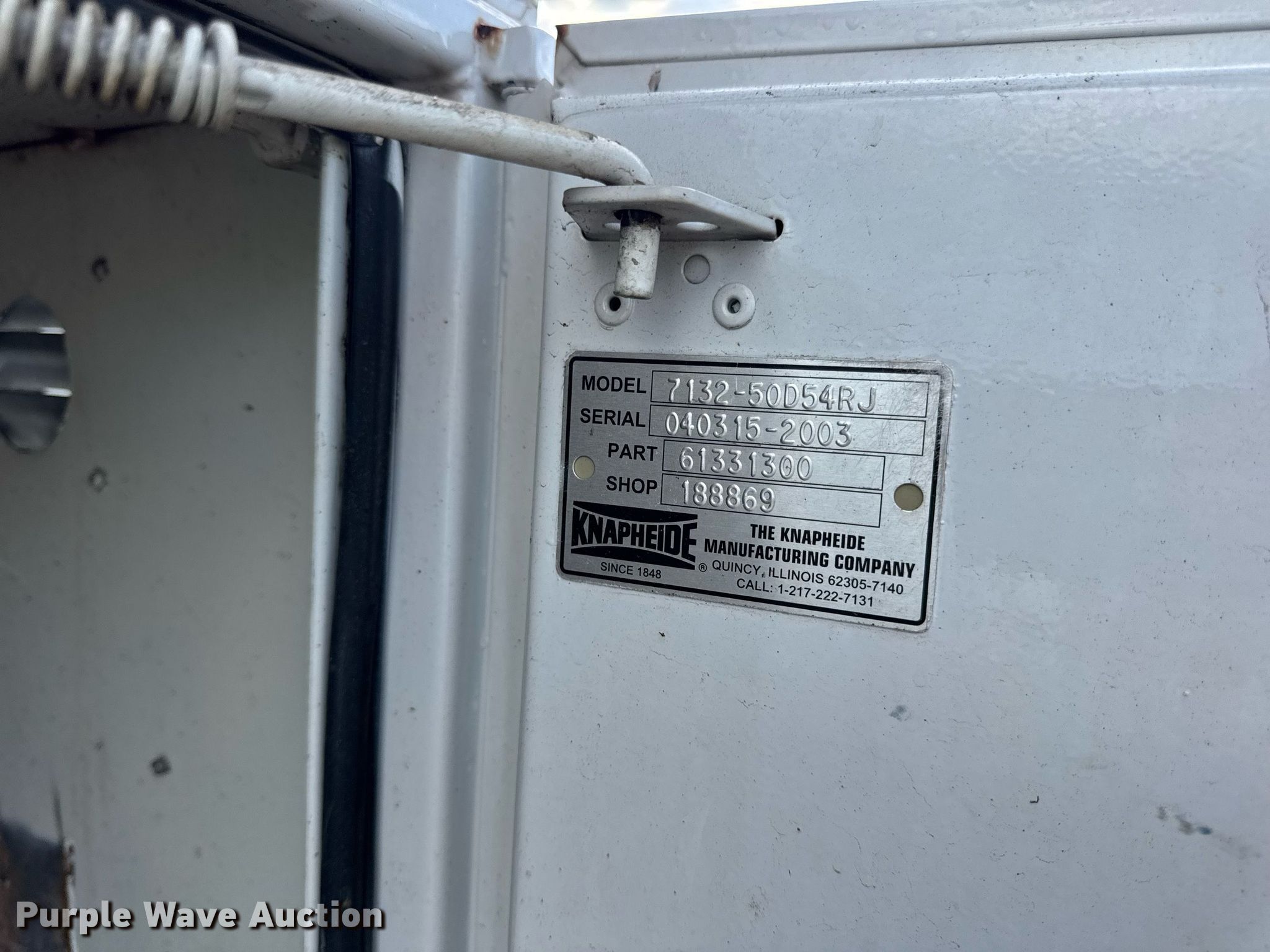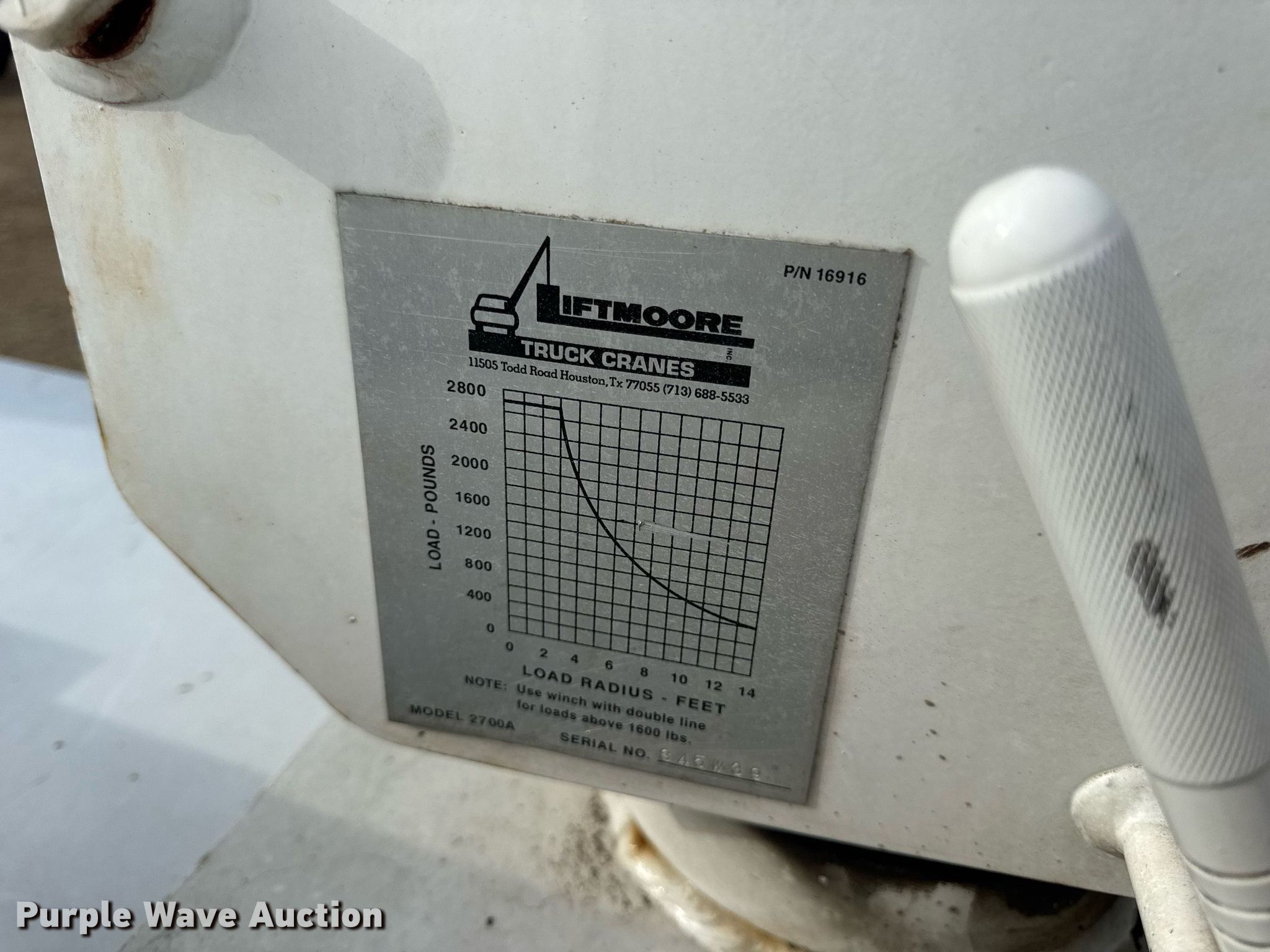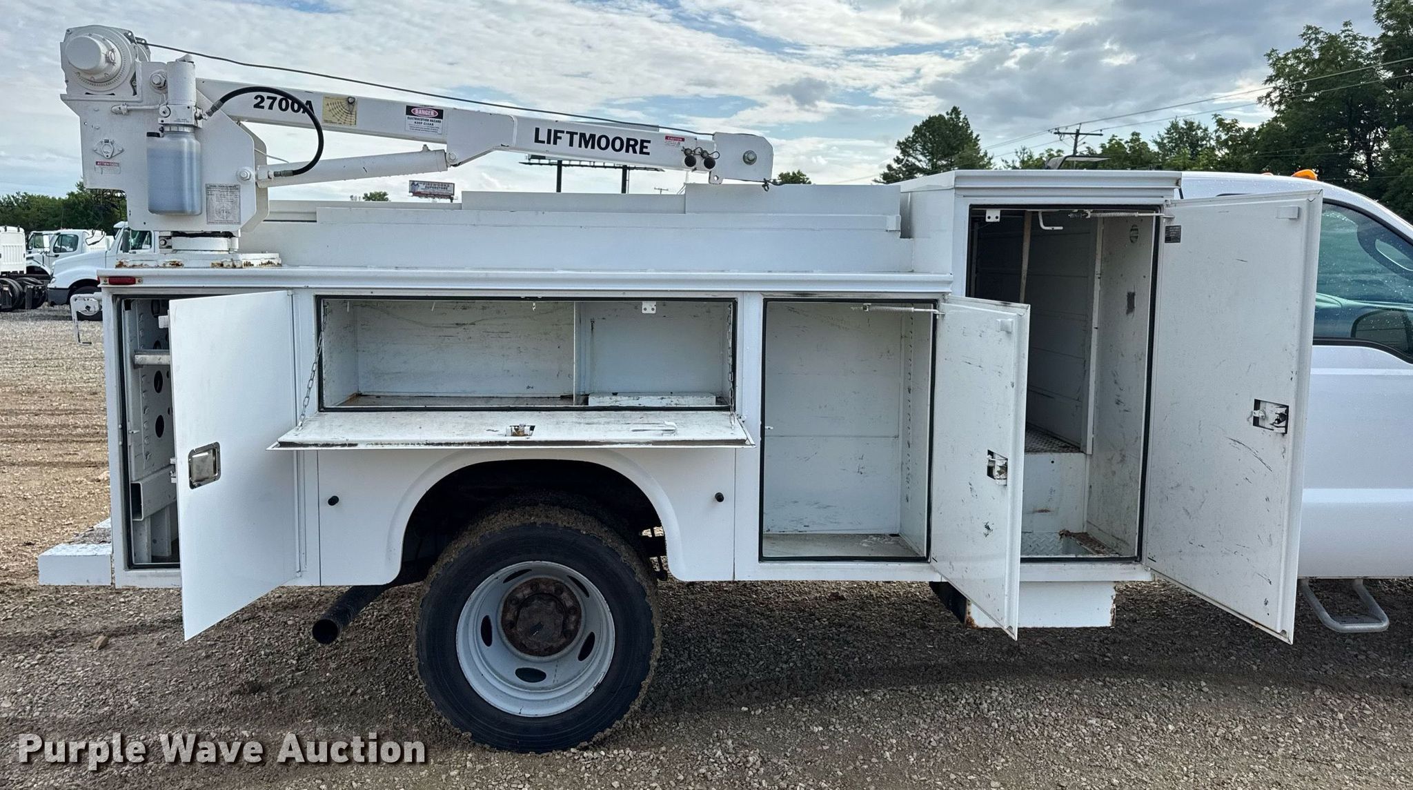 2003 Ford F450 Super Duty XL utility / service truck. Miles: 137,100 on odometer, VIN: 1FDXF46P53EC58039, Unit #: 7099. Engine Displacement: 6.0L, Cylinders: 8, Fuel type: Diesel. Transmission Manual. Chassis Axles: Single, Suspension: Spring, Brakes: Hydraulic, GVWR: 15,000 lbs. Interior AC, Heat. Features Bed Knapheide 7132-50D54RJ, 11' 29" L x 94" W, Crane LiftMoore 2700A, Maximum boom length: 14' Maximum lift capacity: 2,700 lbs.. Tires Size: 225/70R19.5. Notes Engine issues, dead cylinder , Possible AC issues, may need charged, Unknown operating condition of Crane, Crane controller missing. Missouri title. Title distribution may be delayed up to 14 days from verification of funds. Missouri Department of Transportation. New Bloomfield, MO 65063