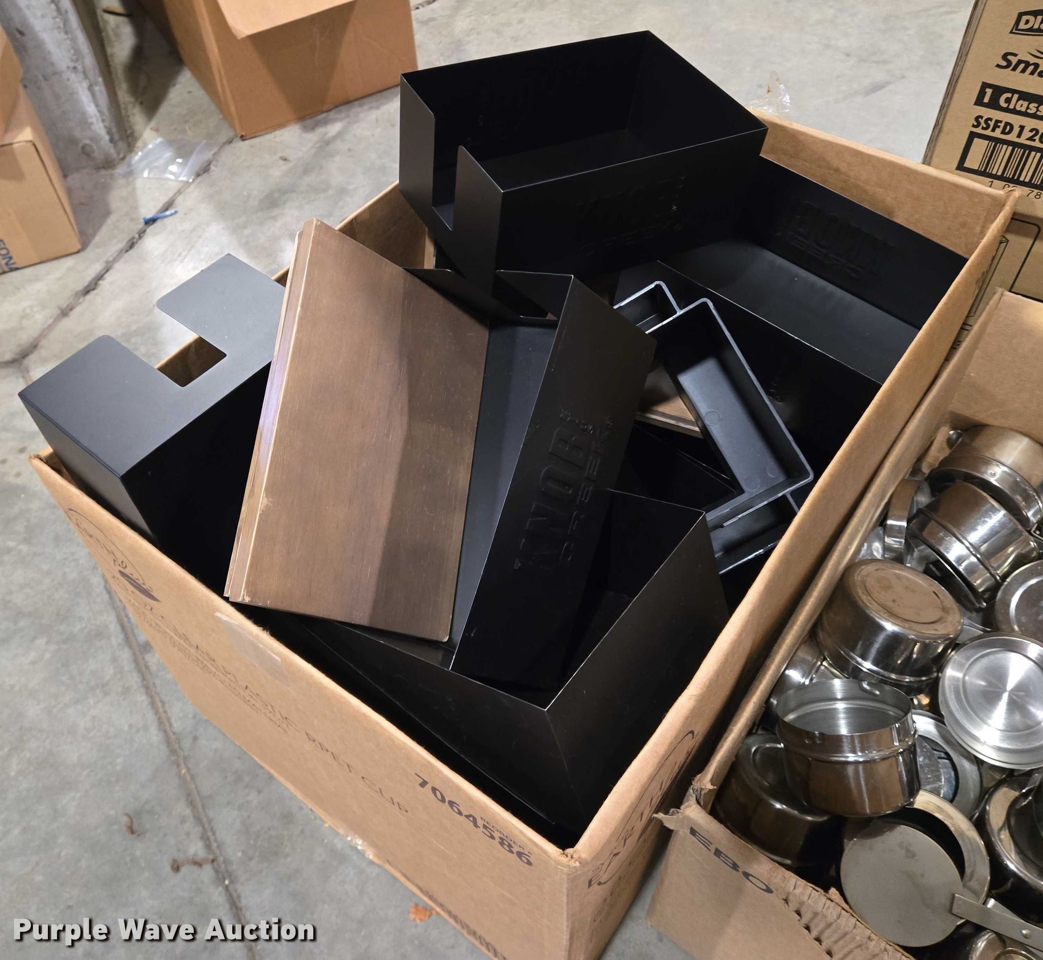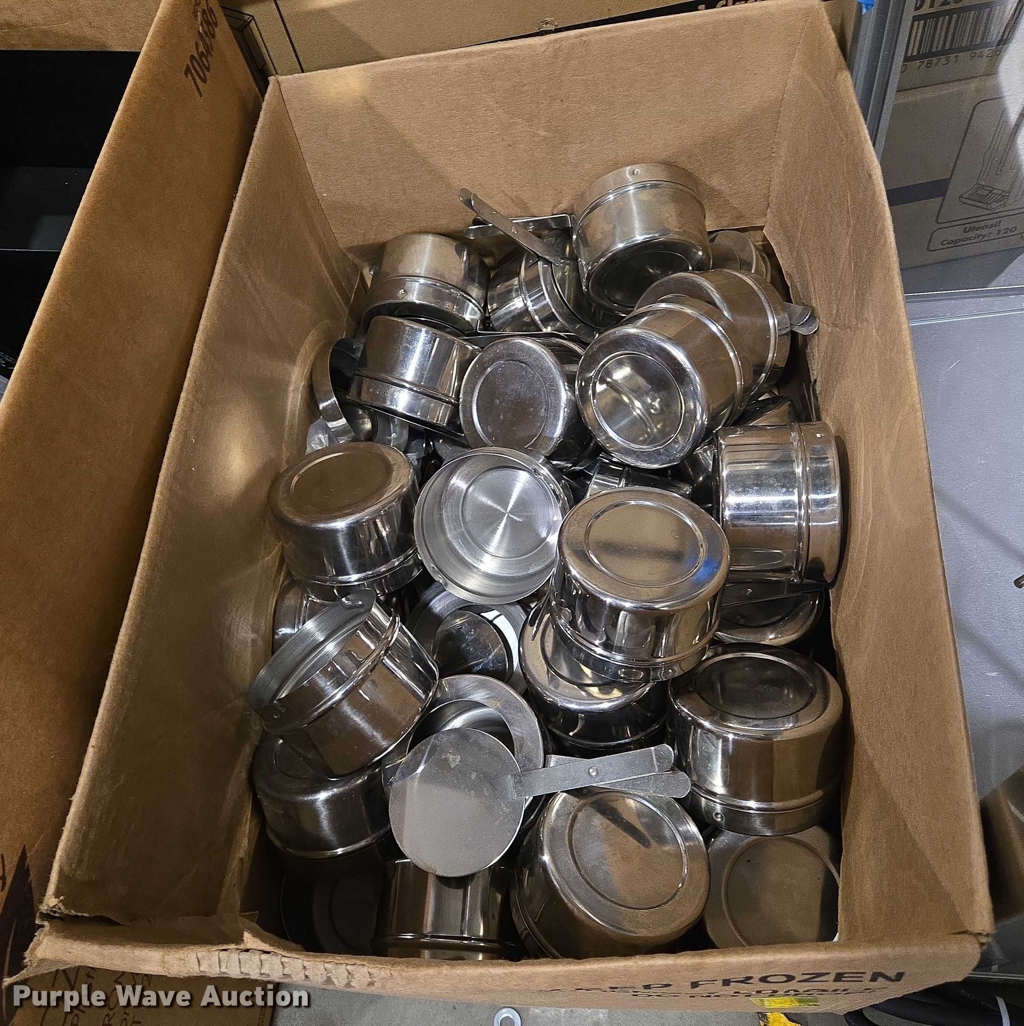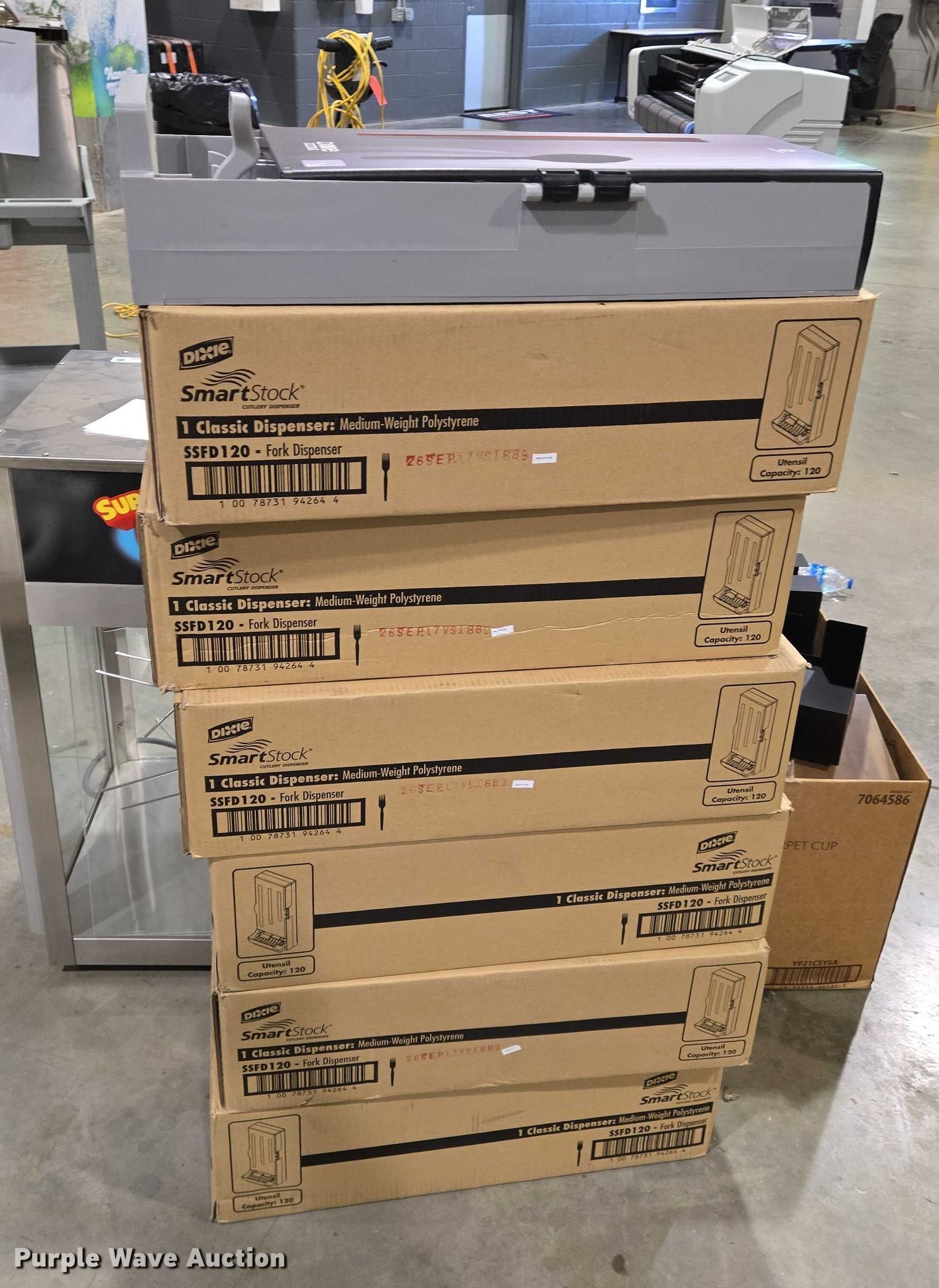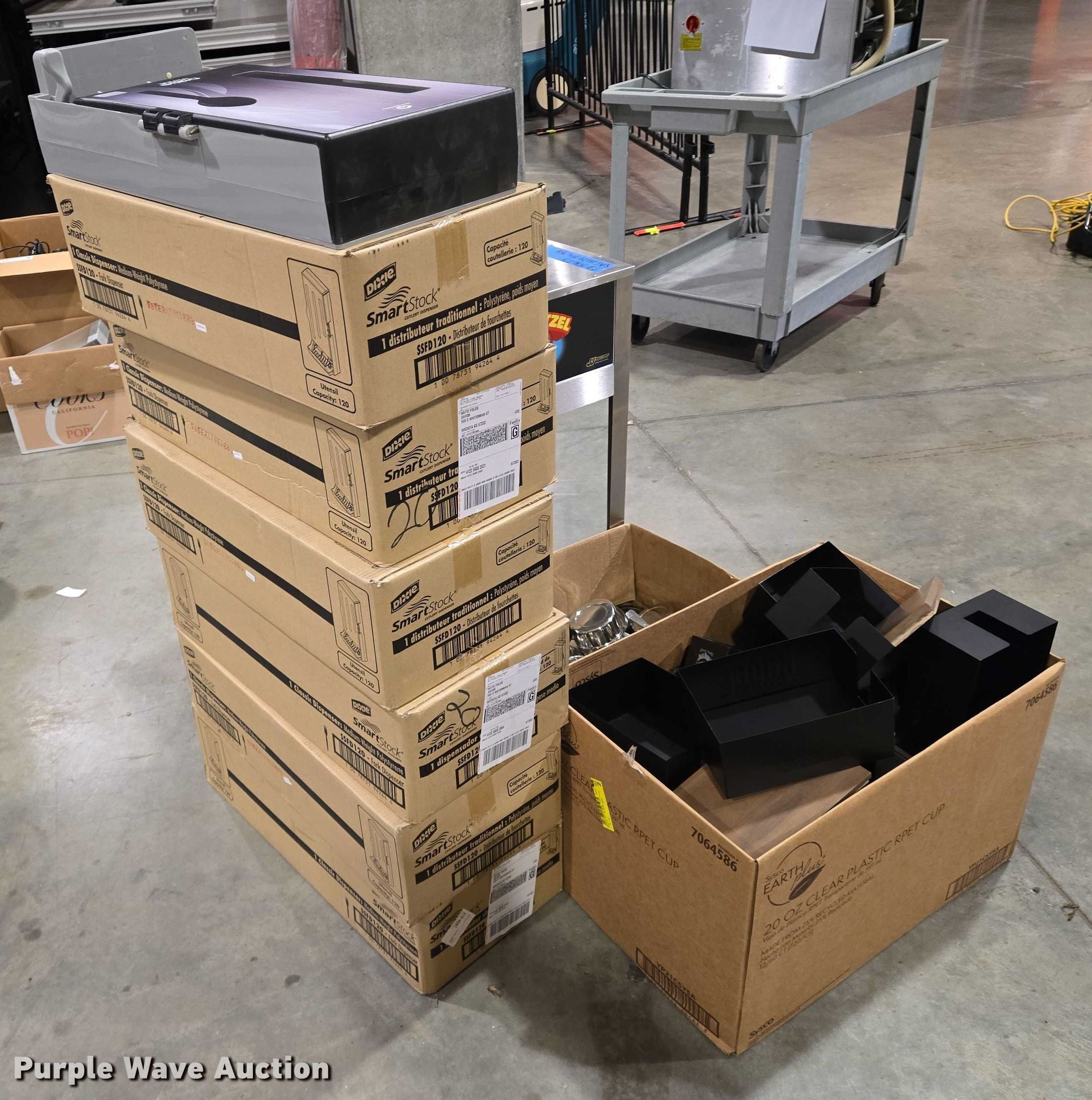 Kitchen supplies. Super Pretzel warmer Serial: 1102-206384, Unknown operating condition, (7) Dixie smart stock utensil dispensers, Stainless steel cups, Napkin holders. Intrust Bank Arena. Wichita, KS 67202