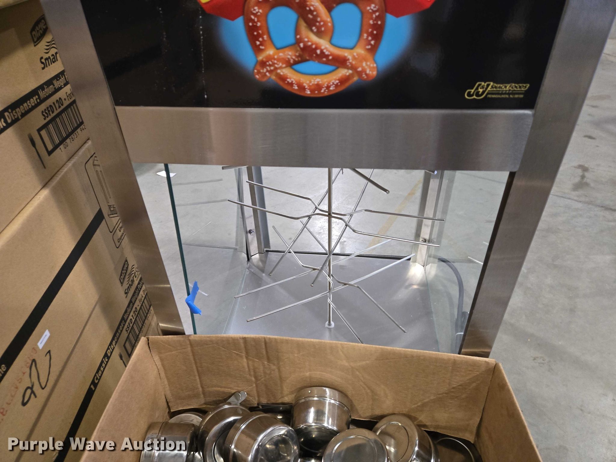 Purple Wave is selling a used Restaurant Equip. in Kansas. This item is a Kitchen supplies with the following: Super Pretzel warmer, Serial: 1102-206384, Unknown operating condition, (7) Dixie smart stock utensil dispensers, Stainless steel cups, Napkin holders
