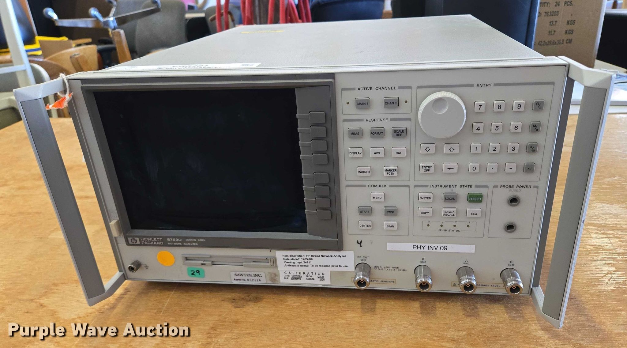 Purple Wave is selling a used Electronics in South Dakota. This item is a Hewlett Packard 8753D network analyzer with the following: Serial: 3410A08005, Unknown operating condition