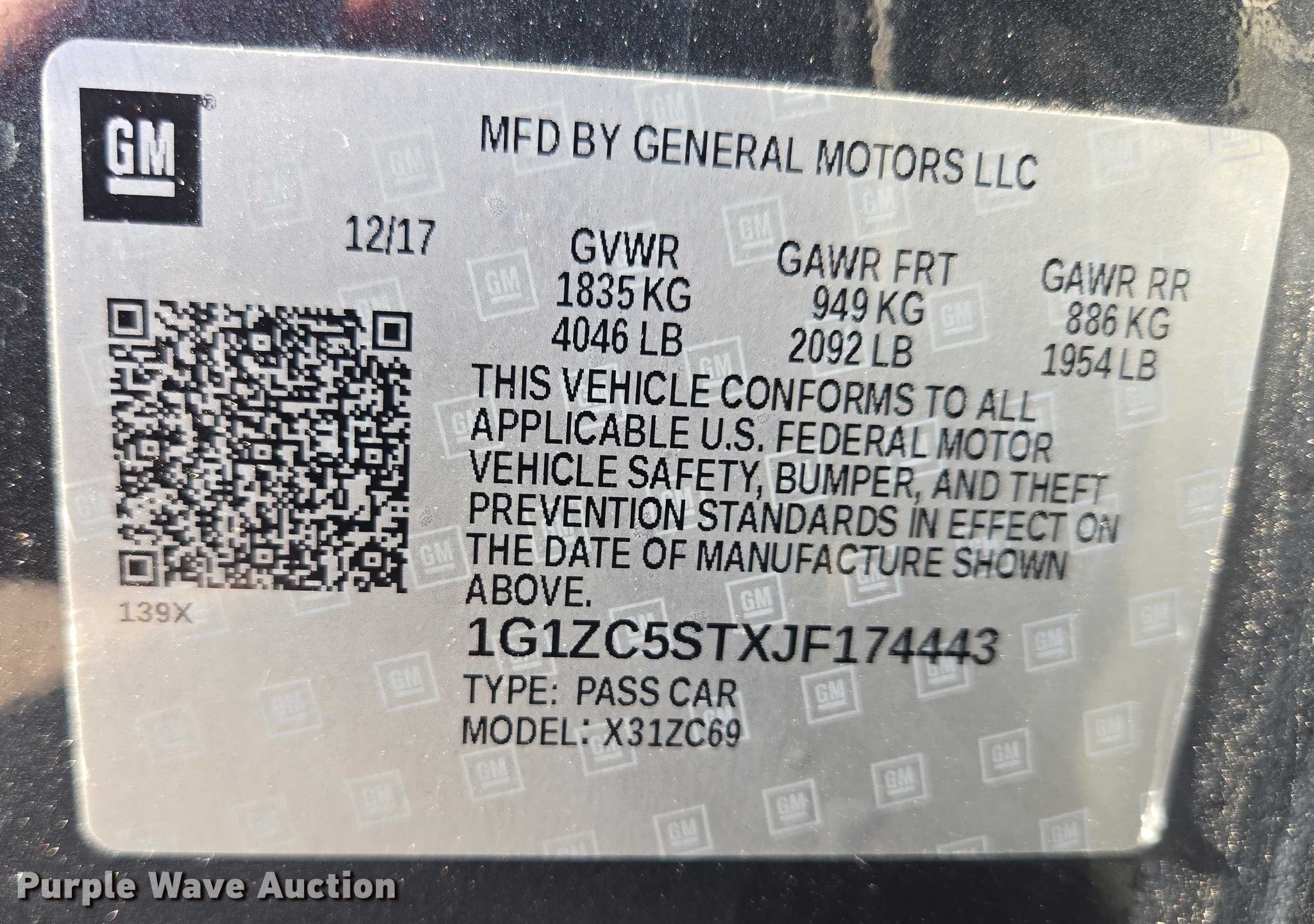 2018 Chevrolet Malibu. Miles: 129,725 on odometer, VIN: 1G1ZC5STXJF174443, Unit #: AS164. Engine Displacement: 1.5L L4 DOHC, Cylinders: 4, Fuel type: Gas. Transmission Automatic. Interior AC, Heat, Seat: Power driver, Power windows, Power locks, Cruise control, Backup camera. Tires Size: 205/65R16, Rear driver side: T125/80R16 Spare tire. Notes Dash warning indicator: TPMS, Front end damage. South Dakota title. Title distribution may be delayed up to 14 days from verification of funds. State of South Dakota. Rapid City, SD 57701