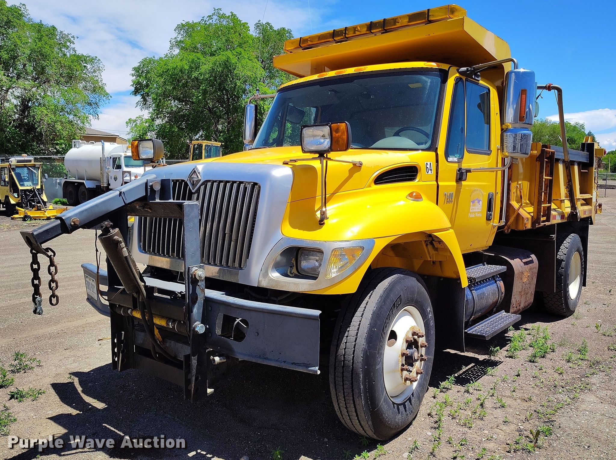 2005 International 7400 dump truck. Miles: 34,725 on odometer, Hours: 748,471 on meter, VIN: 1HTWDAZRX5J054562. Engine International D285, Displacement: 9.3L, Cylinders: 6, Fuel type: Diesel. Transmission Automatic. Chassis Axles: Single, Suspension: Spring, Brakes: Air, PTO, Front mount PTO, Wheelbase: 161. Interior AC, Heat, Heated mirrors, Cruise control. Features Dump bed 10' L x 96" W, Side height: 32", Bed type: Steel, Roll tarp, Ram: Single, End gate: Manual, Plow Width: 132". Tires Size: 11R22.5. Notes Non-operational roll tarp, Unknown operating condition , Possible fuel pump issues, cranks but will not start Unit must be towed or hauled. Colorado title. Title distribution may be delayed up to 14 days from verification of funds. City of Monte Vista. Monte Vista, CO 81144