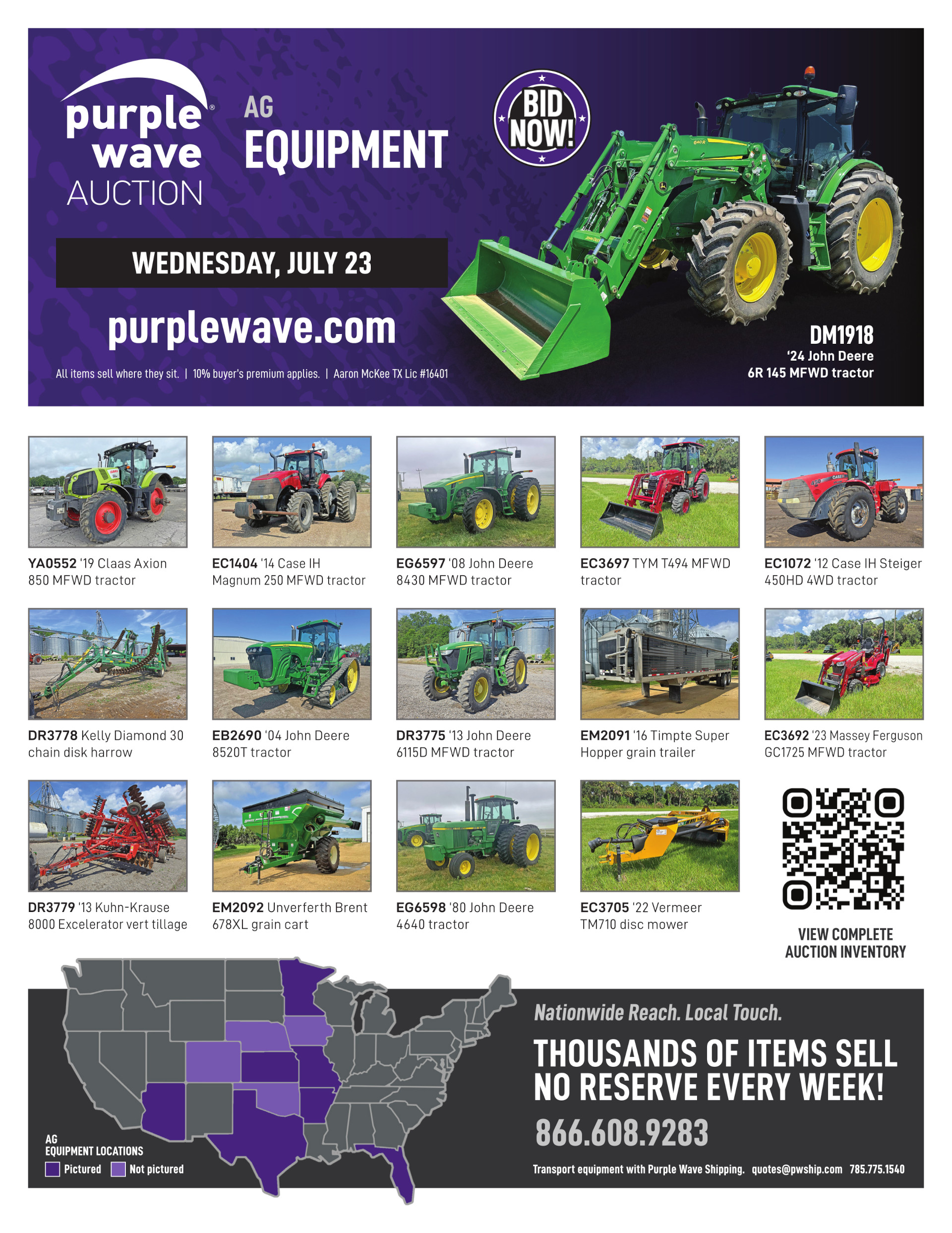 Purple Wave Shipping, LLC provides shipping and transportation services to winning bidders on ag, construction and fleet type assets. Purple Wave Shipping, LLC does not provide shipping on items weighing less than 1,000 pounds.