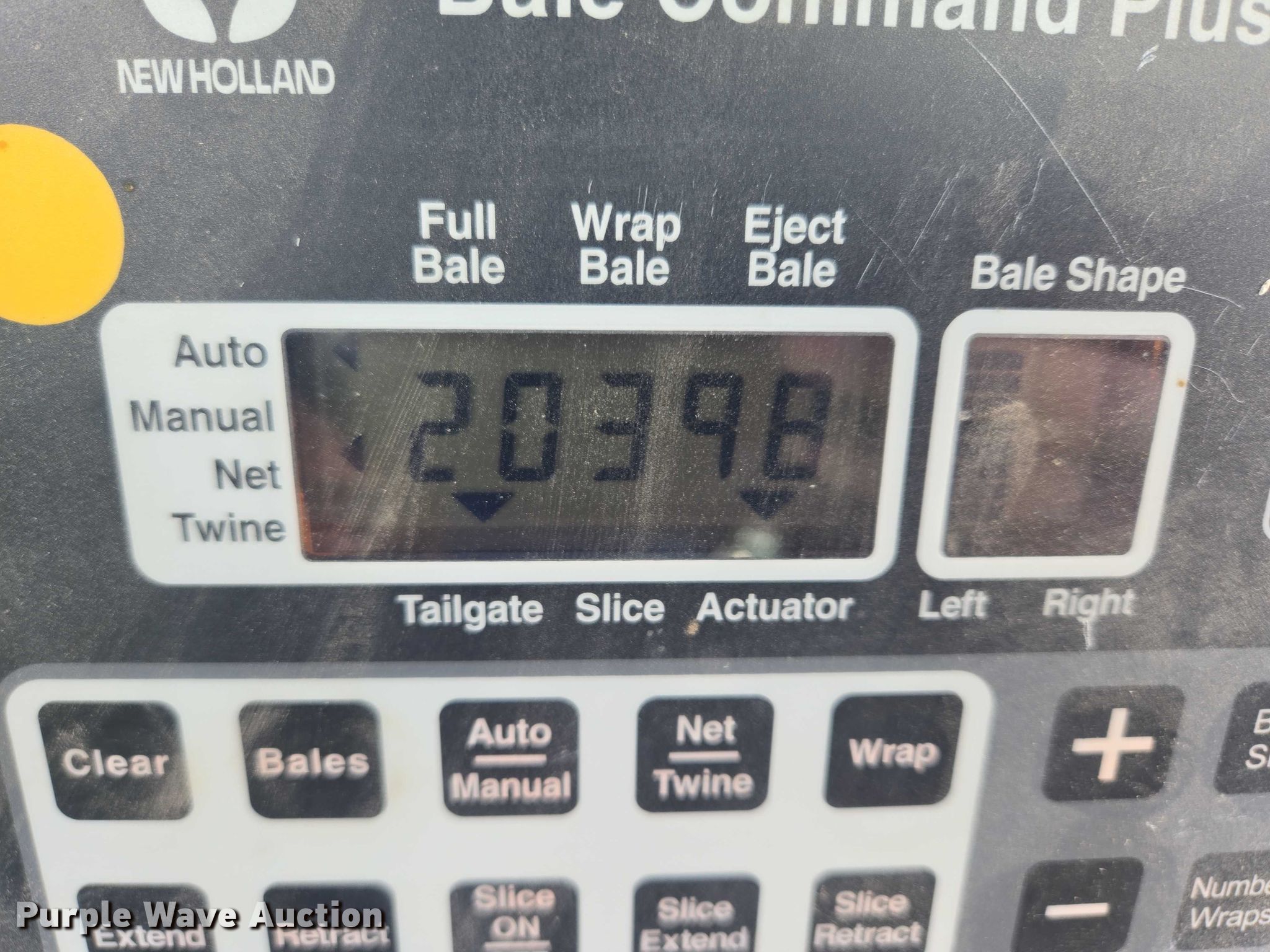 2013 New Holland BR7090 round baler. Bale count: 20,398, Serial: YCN175190. Features PTO: 1000, Monitor New Holland Bale Command Plus, Transport lights, Gauge wheels Size: 4.80-8, Pickup width: 90", Hydraulic pickup lift, Bale size: 5' x 6', Twine tie, Net-wrap, Bale ramp. Tires Size: 21.5L-16.1SL. Notes Tractor not included. Crawford, NE 69339