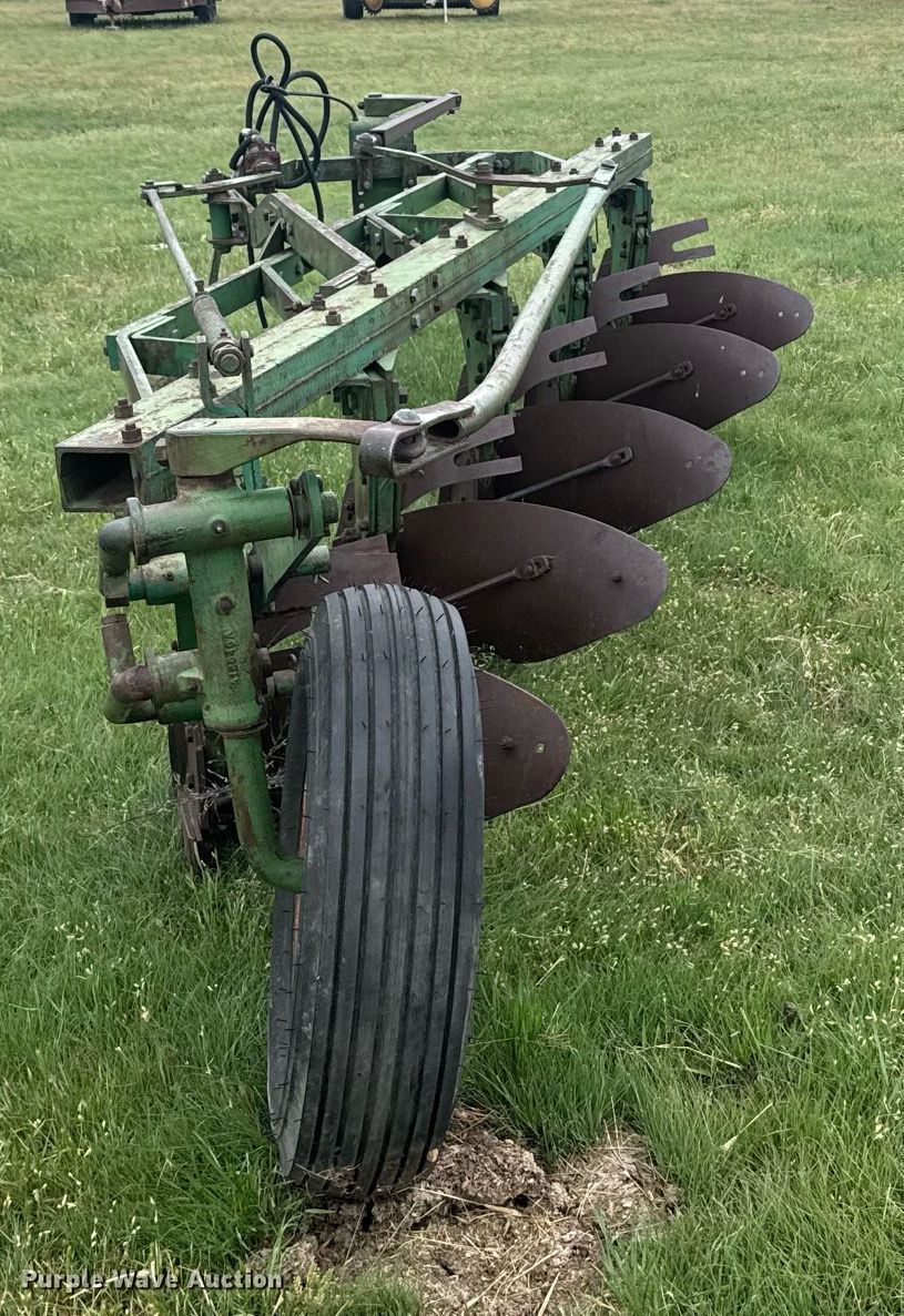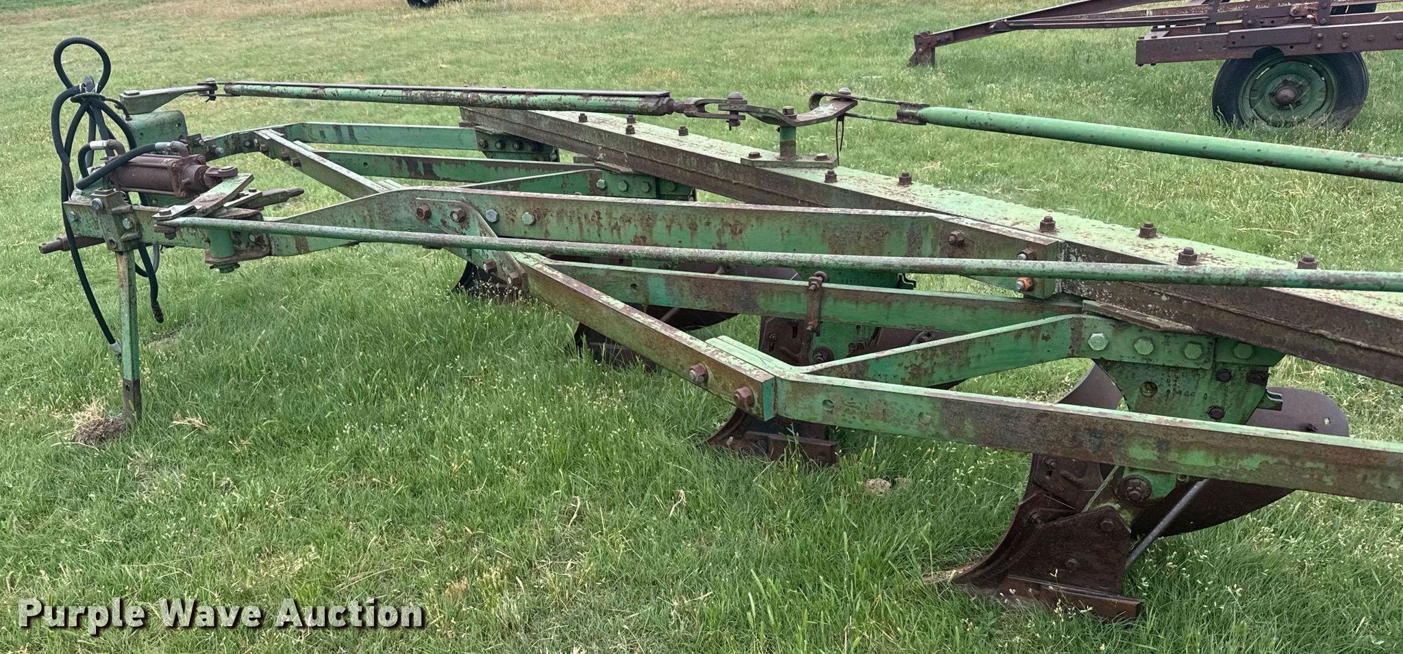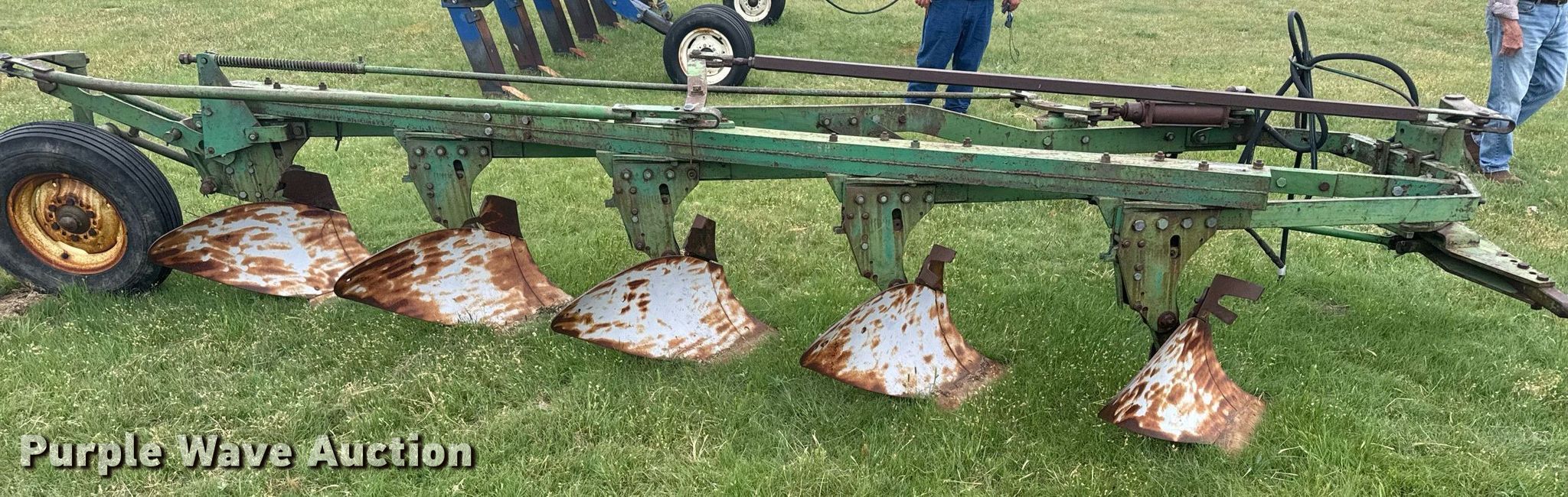 Purple Wave is selling a used Plow in Kansas. This item is a John Deere five bottom plow with the following: Overall width: 77", Hydraulic lift, Hitch: Two point, Tire size: 7.60-15