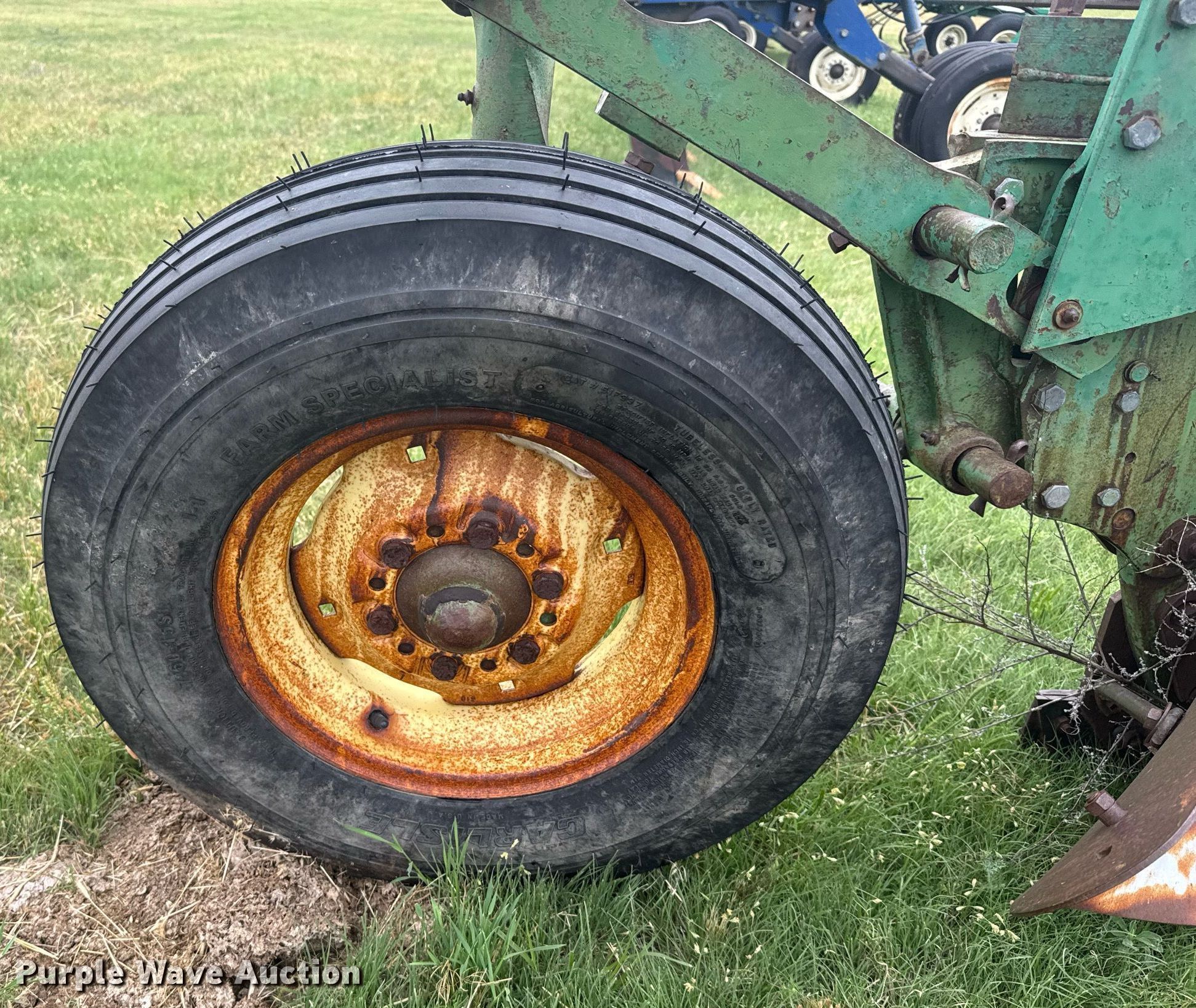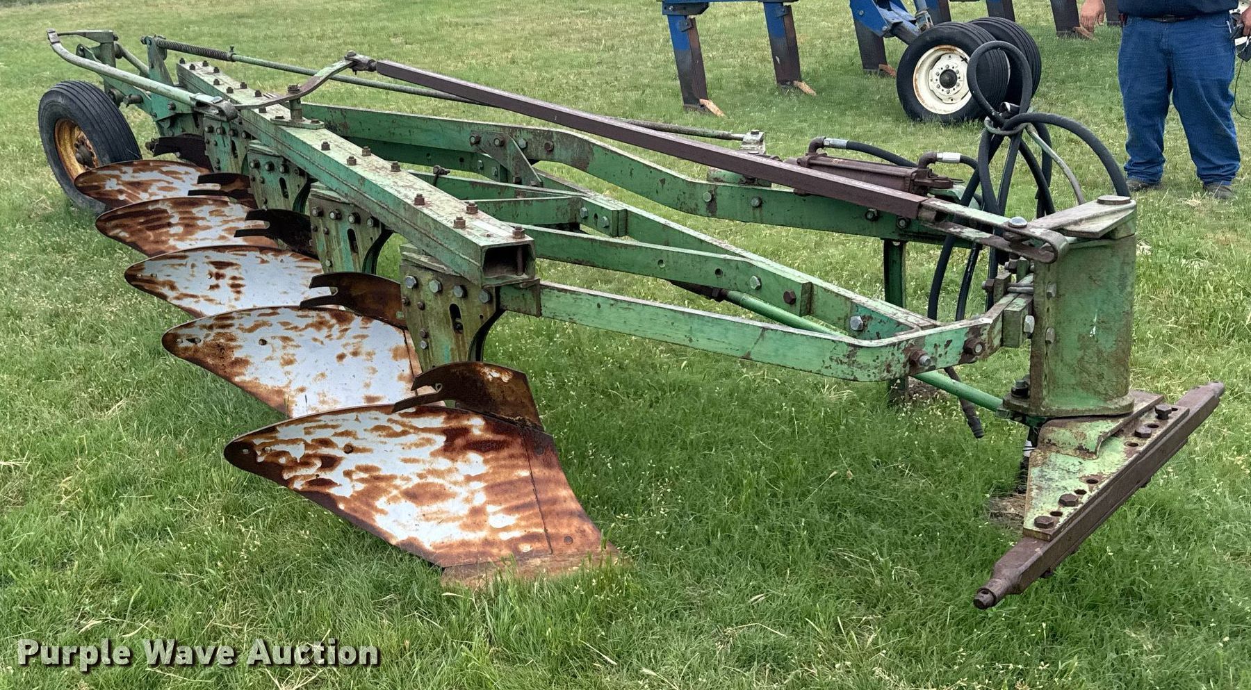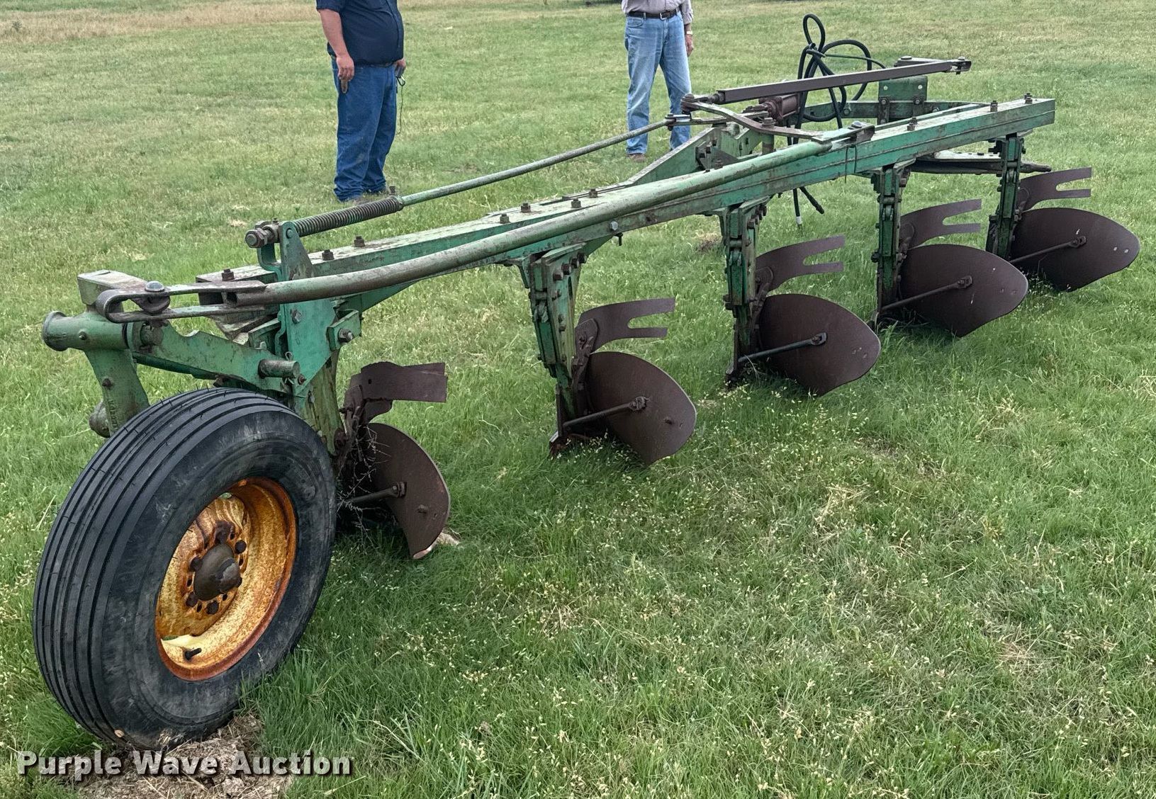 Purple Wave is selling a used Plow in Kansas. This item is a John Deere five bottom plow with the following: Overall width: 77", Hydraulic lift, Hitch: Two point, Tire size: 7.60-15
