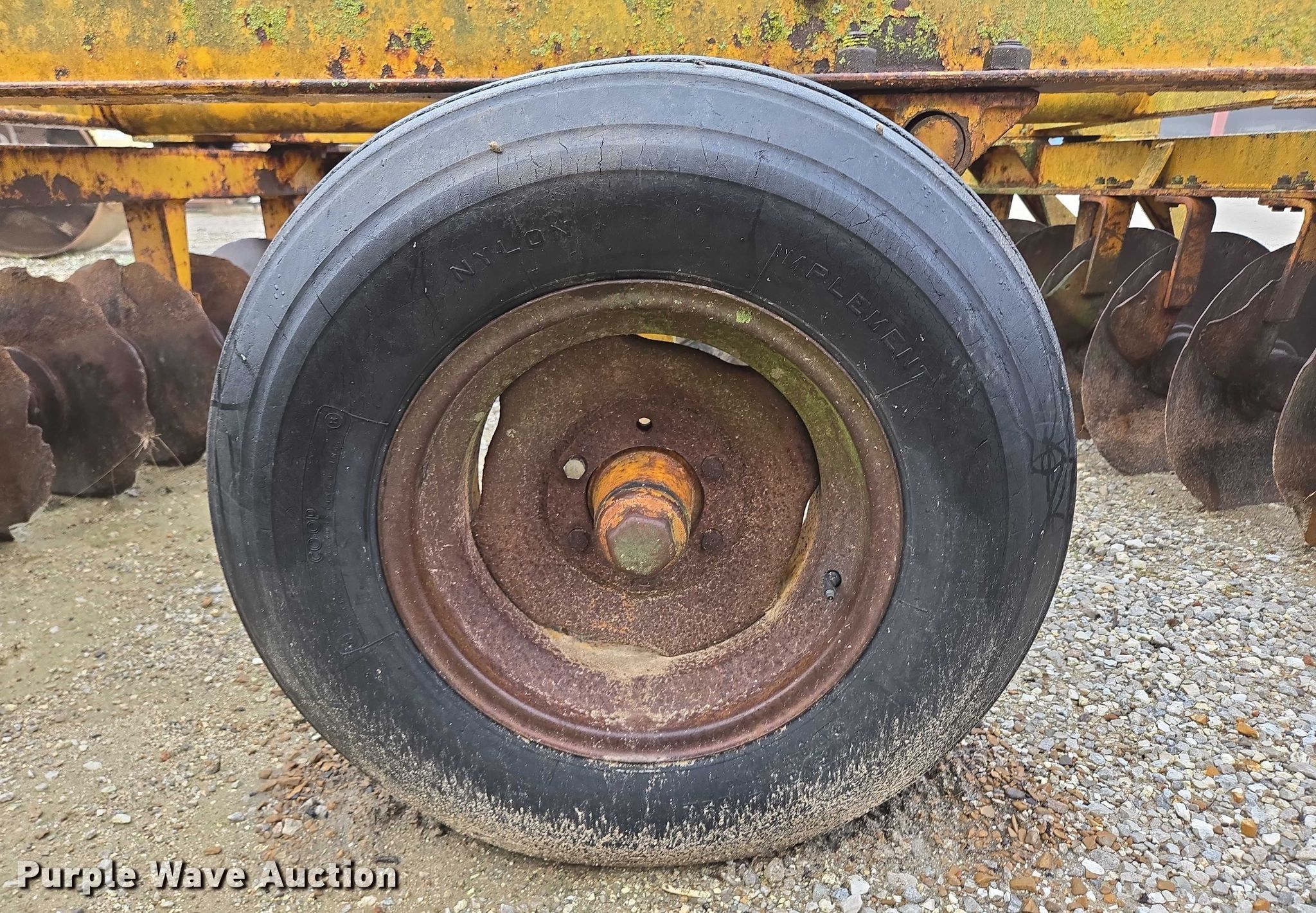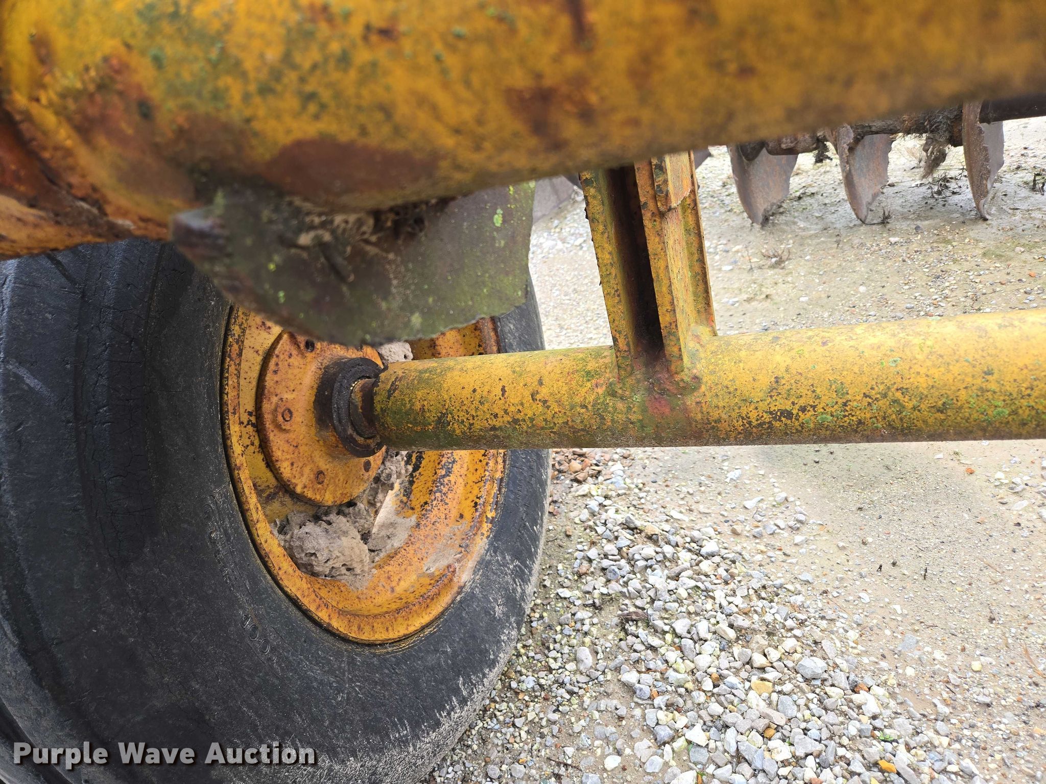 Rome TCW 36-24 offset disk. Overall width: 13' 6", Serial: 18TCW-317. Features Front blades Diameter: 22.5", Spacing: 9.5", Rear blades Diameter: 21", Spacing: 9.5", Disk scrapers, Operation Hydraulic lift, Leveler: Manual. Tires Tire size: 9.00-16. Notes Hydraulic lift cylinder removed but included, Disk blades damaged, Disk scrapers damaged, Disk scrapers missing. Asbell Companies LLC. Carl Junction, MO 64834