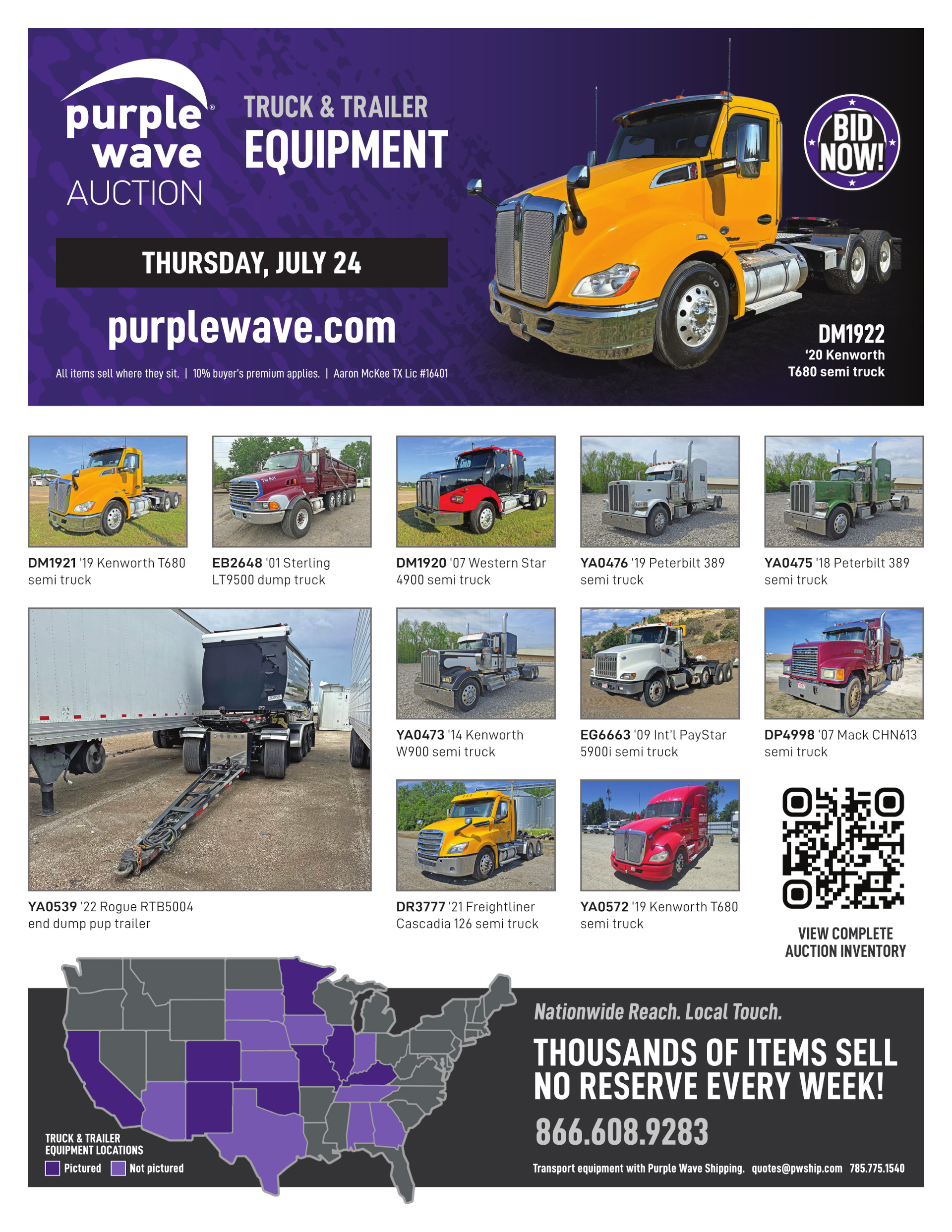 Purple Wave Shipping, LLC provides shipping and transportation services to winning bidders on ag, construction and fleet type assets. Purple Wave Shipping, LLC does not provide shipping on items weighing less than 1,000 pounds.