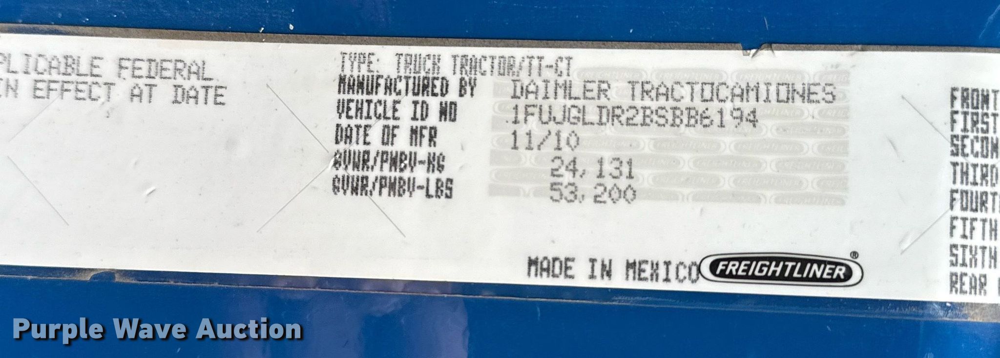 Purple Wave is selling a used Truck Tractor in Oklahoma. This item is a 2011 Freightliner Cascadia semi truck with the following: Miles: 1,219,738 on odometer, VIN: 1FUJGLDR2BSBB6194