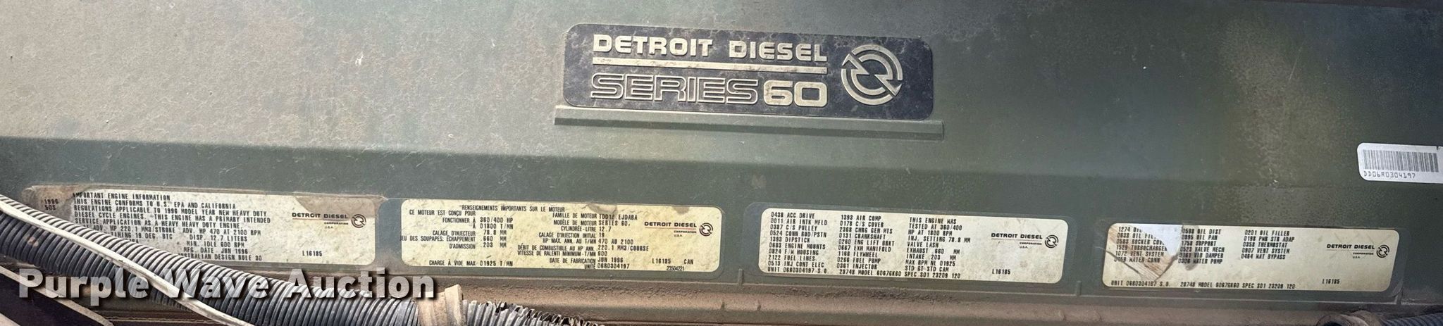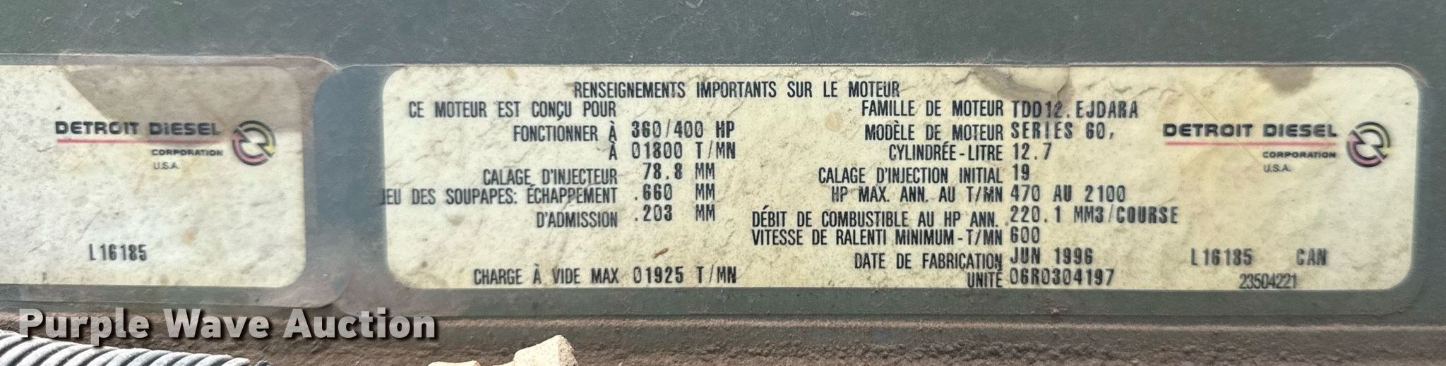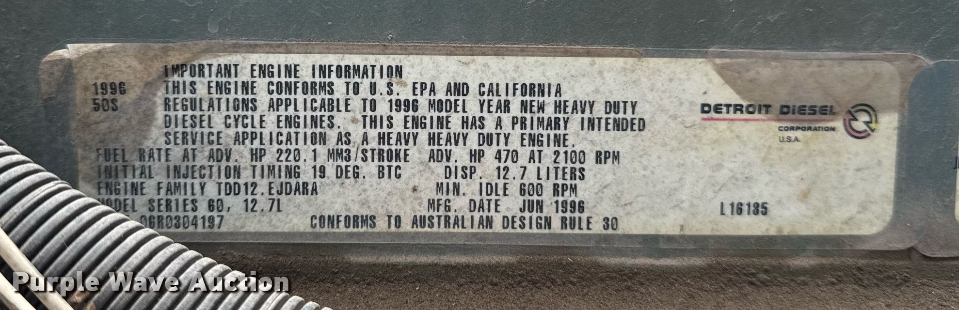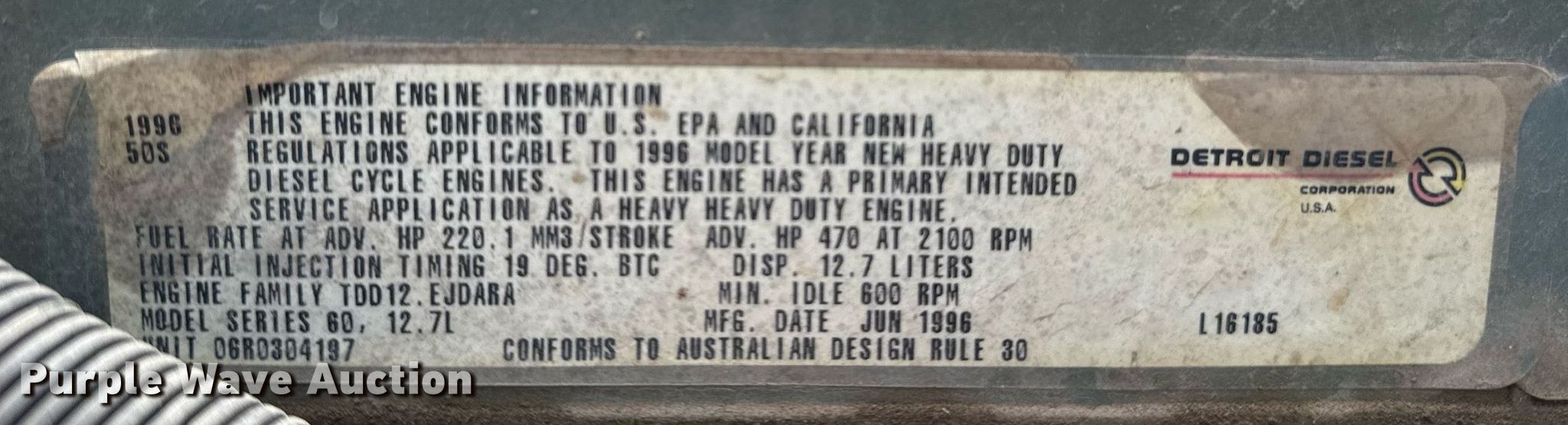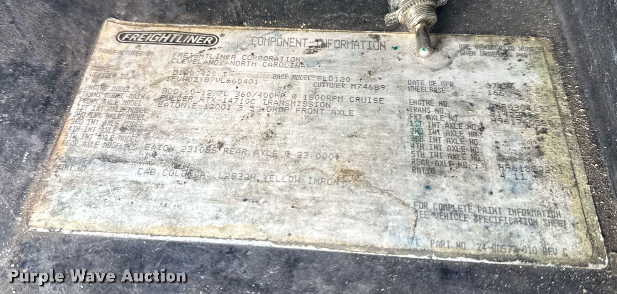 1997 Freightliner FLD120 semi truck. Miles: 510,630 on odometer, VIN: 1FUWDZYB7VL660401. Engine Detroit Diesel Series 60, Serial: 06R0304197, Displacement: 12.7L, Cylinders: 6, Fuel type: Diesel, HP: 470. Transmission Eaton Fuller, Manual, Speed: 10. Chassis Axles: Single, Suspension: Air Dump valves, Brakes: Air, GVWR: 34,700 lbs FAWR: 12,000 lbs, RAWR: 22,700 lbs. Interior AC, Heat, Heated mirrors, Cruise control, Air ride cab. Features Deck plate: Aluminum, Fifth wheel type: Air operated, Sliding, Fuel tank: Dual. Tires Front: 295/75R22.5, Rear: 11R22.5. Notes Windshield chipped or cracked, Dead battery, Flat tire, Unknown operating condition. Arkansas title. Title distribution may be delayed up to 14 days from verification of funds. Bank owned. Tulsa, OK 74115