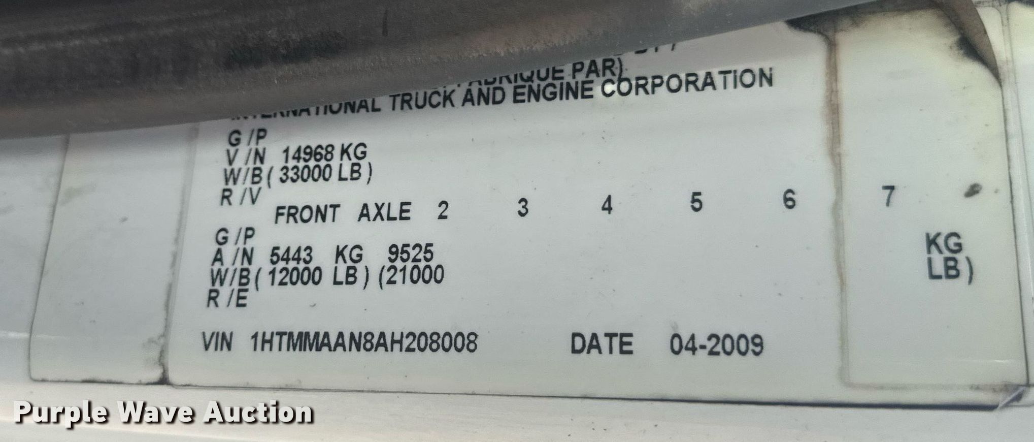 2010 International DuraStar 4300 truck cab and chassis. Miles: 309,878 on odometer, Hours: 11,651 on meter, VIN: 1HTMMAAN8AH208008, Unit #: 108008. Engine International MaxxForce DT, Displacement: 7.6L, Cylinders: 6, Fuel type: Diesel. Transmission Allison, Automatic. Chassis Axles: Single, Suspension: Spring, Brakes: Air, Truck chassis: 19' 2", GVWR: 33,000 lbs FAWR: 12,000 lbs, RAWR: 21,000 lbs. Interior AC, Heat, Heated mirrors, Cruise control, Air ride cab. Features Fuel tank: Single. Tires Size: 275/80R22.5. Notes Air leak. Oklahoma title. Title distribution may be delayed up to 14 days from verification of funds. Hiland Dairy. New Bloomfield, MO 65063