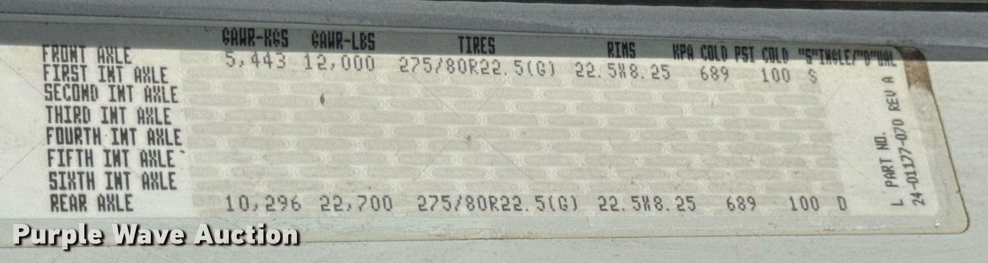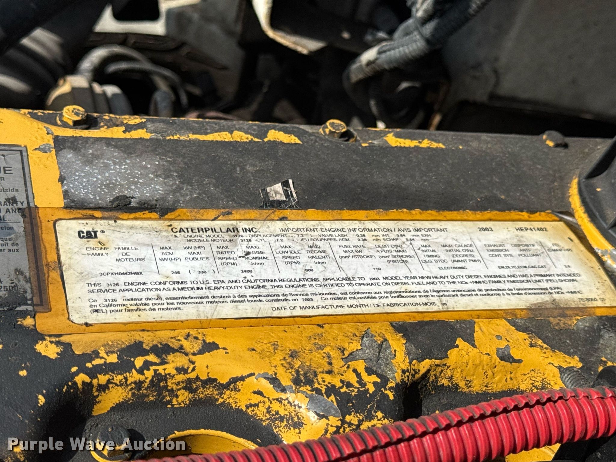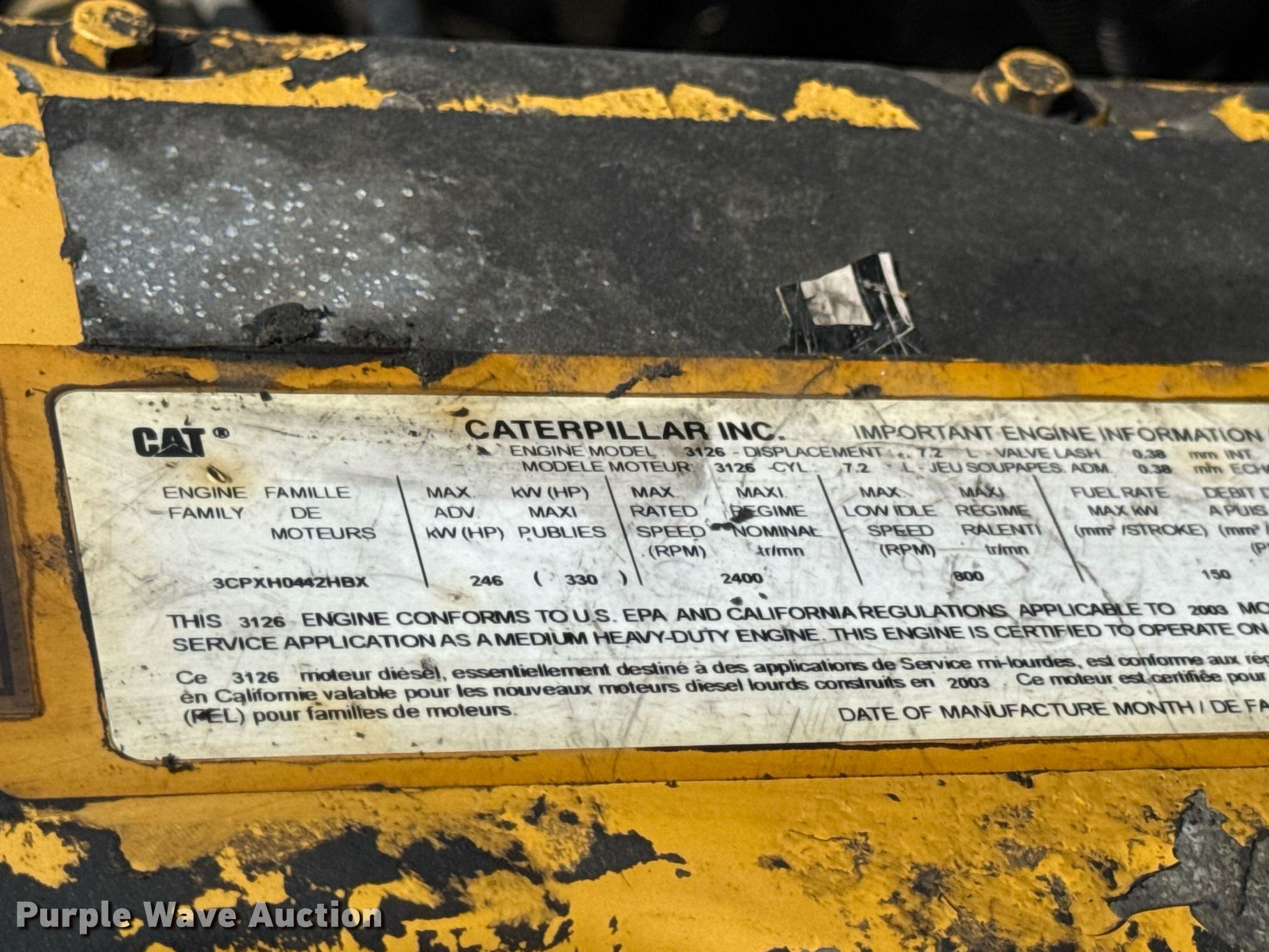 2004 Freightliner Business Class M2 106 truck cab and chassis. Miles: 539,662 on odometer, Hours: 25,502 on meter, VIN: 1FVACKAK24HM65489, Unit #: 2553. Engine Caterpillar 3126, Serial: HEP41402, Displacement: 7.2L, Cylinders: 6, Fuel type: Diesel, HP: 330. Transmission Allison, Automatic. Chassis Axles: Single, Suspension: Spring, Brakes: Air, Truck chassis: 20' 6", GVWR: 33,000 lbs FAWR: 12,000 lbs, RAWR: 22,700 lbs. Interior AC, Heat, Heated mirrors, Cruise control. Features Fuel tank: Single. Tires Size: 295/75R22.5. Nebraska title. Title distribution may be delayed up to 14 days from verification of funds. Hiland Dairy. New Bloomfield, MO 65063