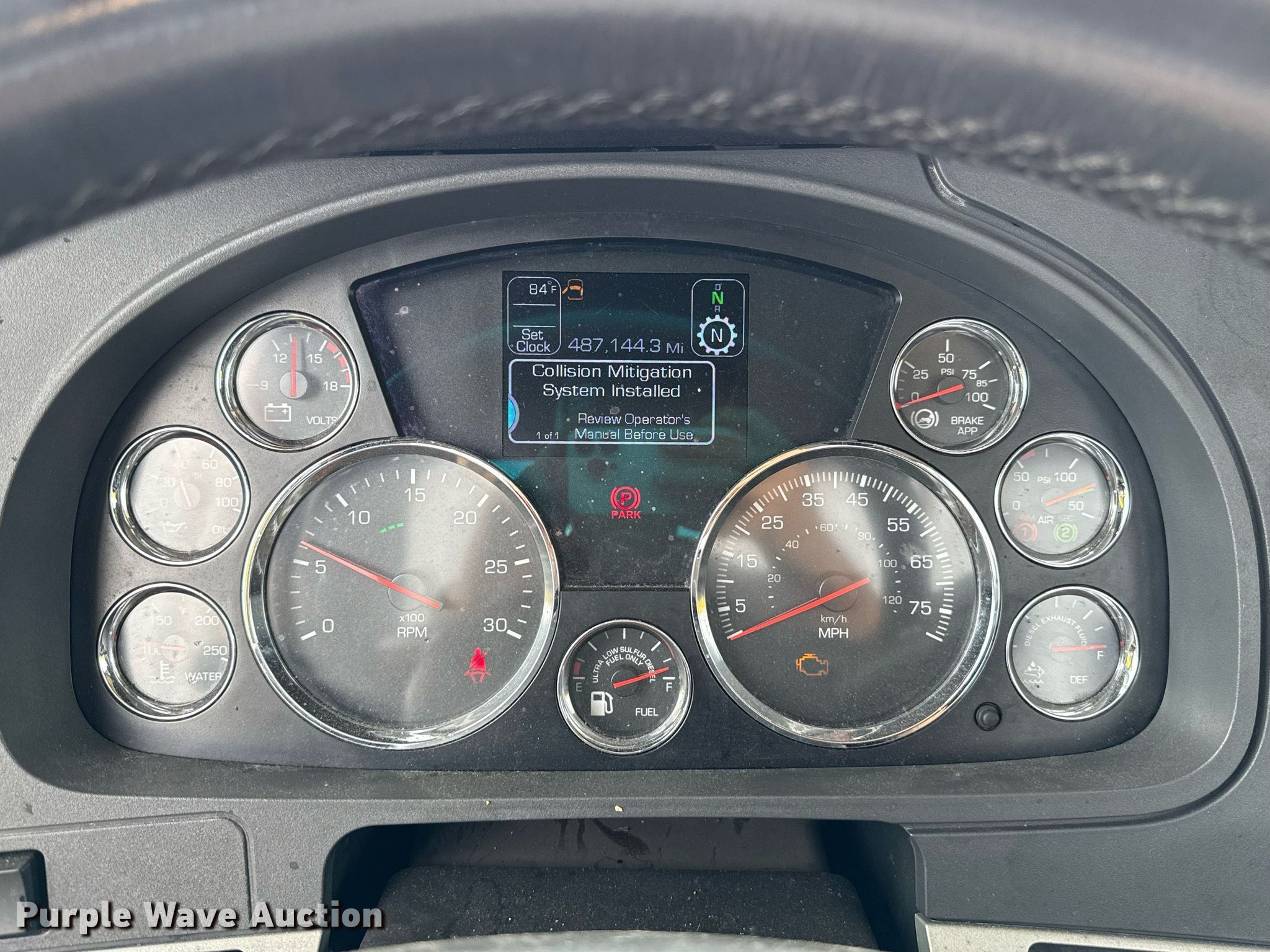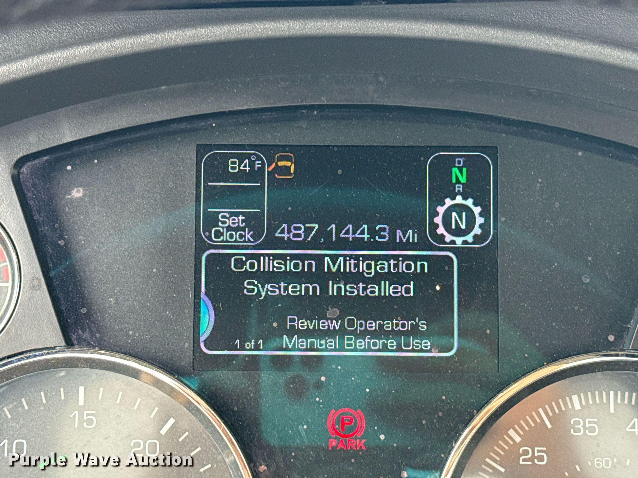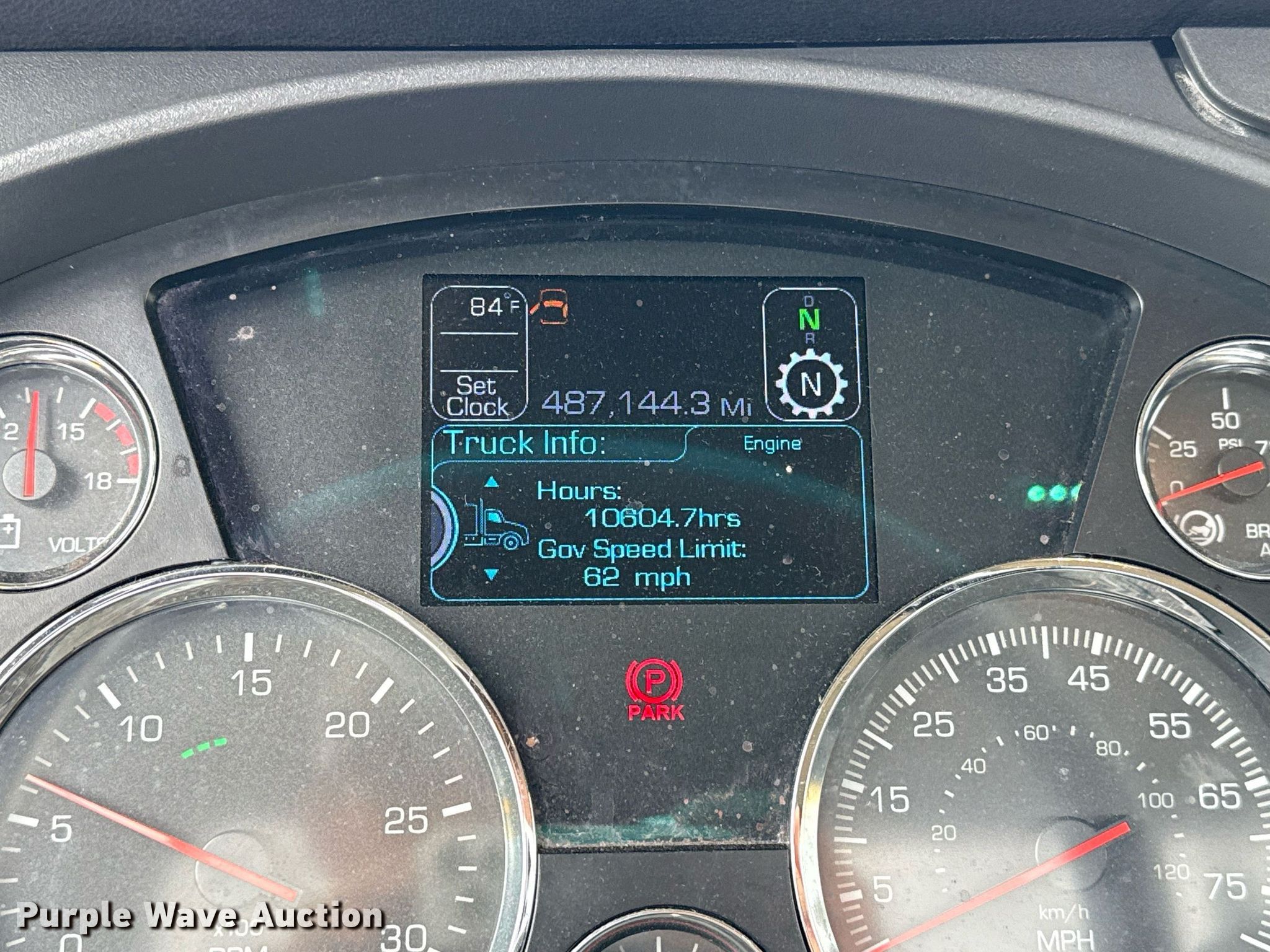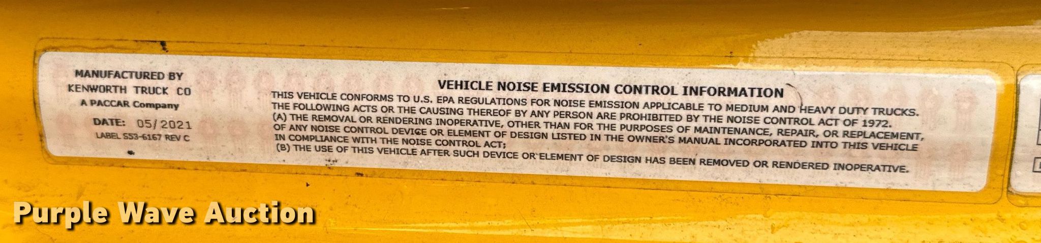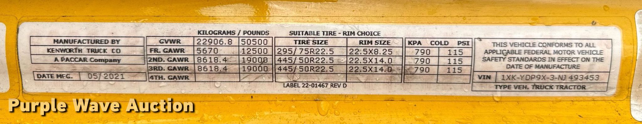 2022 Kenworth T680 semi truck. Miles: 487,144 on odometer, Hours: 10,605 on meter, VIN: 1XKYDP9X3NJ493453, Unit #: 22534. Engine Paccar MX-13, Serial: Y256096, Displacement: 12.9L, Cylinders: 6, Fuel type: Diesel, HP: 455, kW: 340, Engine brake. Transmission Automated manual. Chassis Axles: Tandem, Differential lock: Inter-axle, Suspension: Air Dump valves, Brakes: Air, GVWR: 50,500 lbs FAWR: 12,500 lbs, IAWR: 19,000 lbs, RAWR: 19,000 lbs. Interior AC, Heat, Heated mirrors, Power windows, Power locks, Cruise control, Air ride cab. Features Deck plate: Aluminum, Fifth wheel type: Fixed, Fuel tank: Single. Tires Front: 295/75R22.5, Rear: 445/50R22.5. Notes Dash warning indicator: Check engine. Oklahoma title. Title distribution may be delayed up to 30 days from verification of funds. Gemini Motor Transport. 10220 W Reno Ave. Oklahoma City, OK 73127