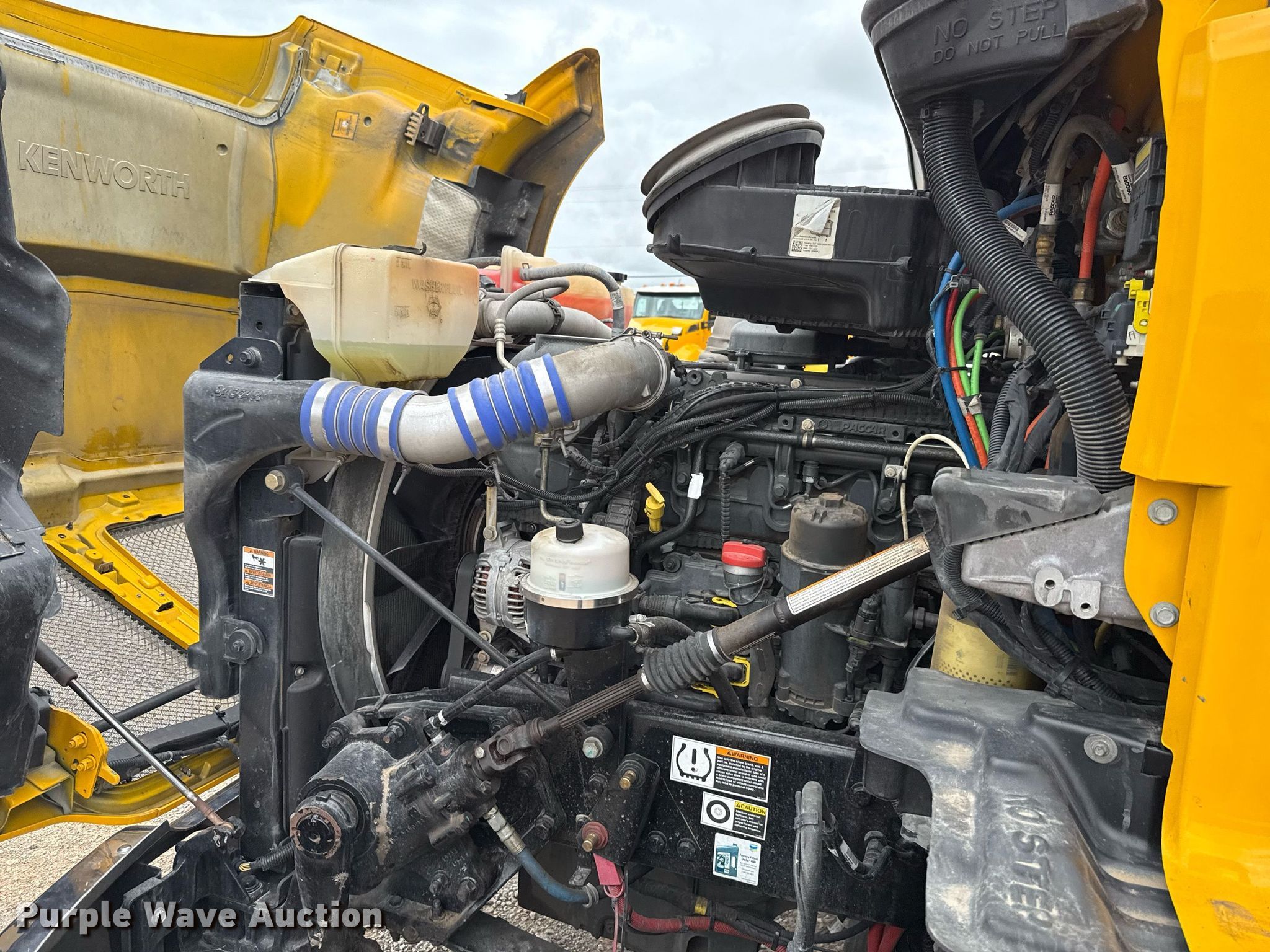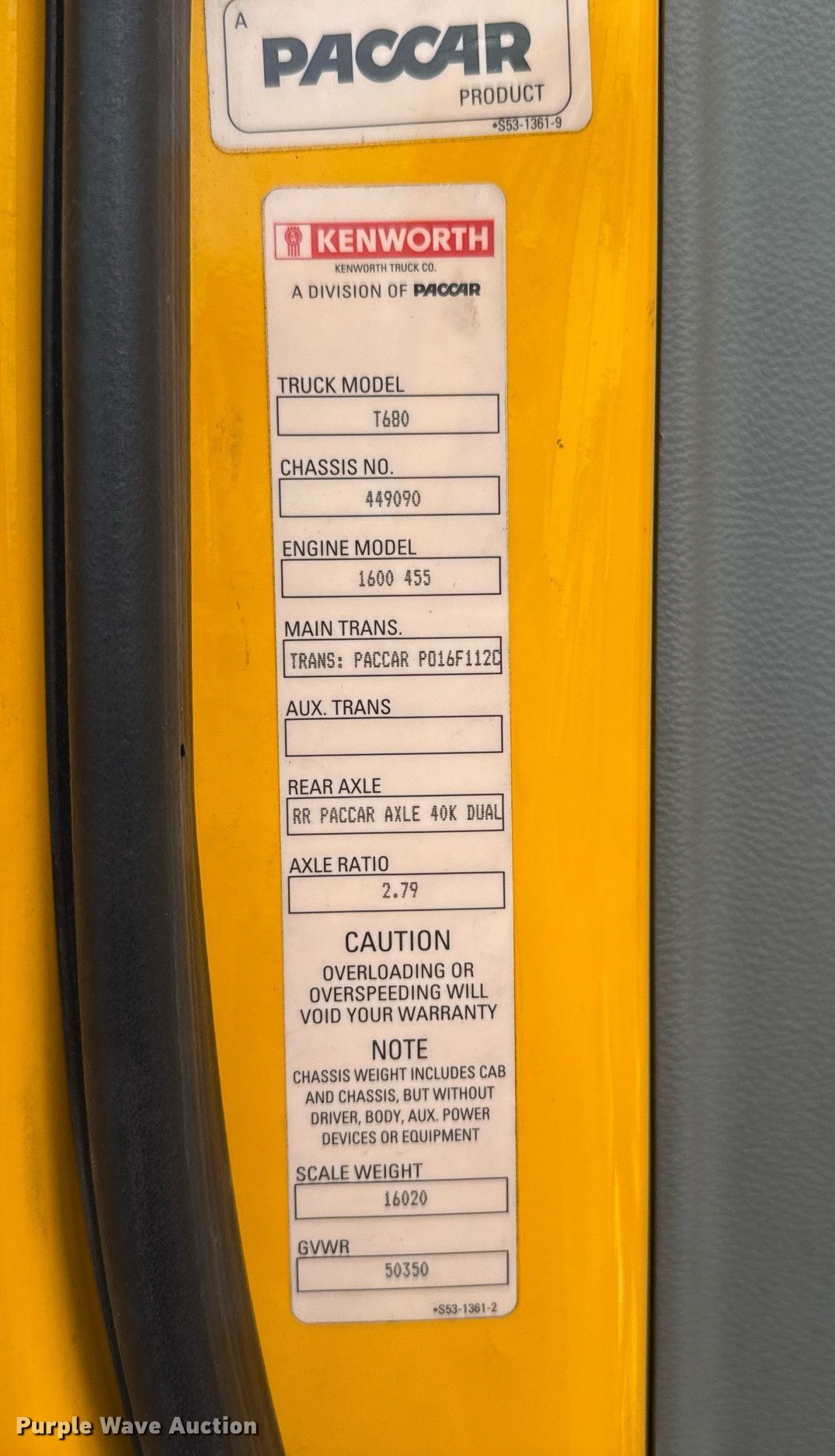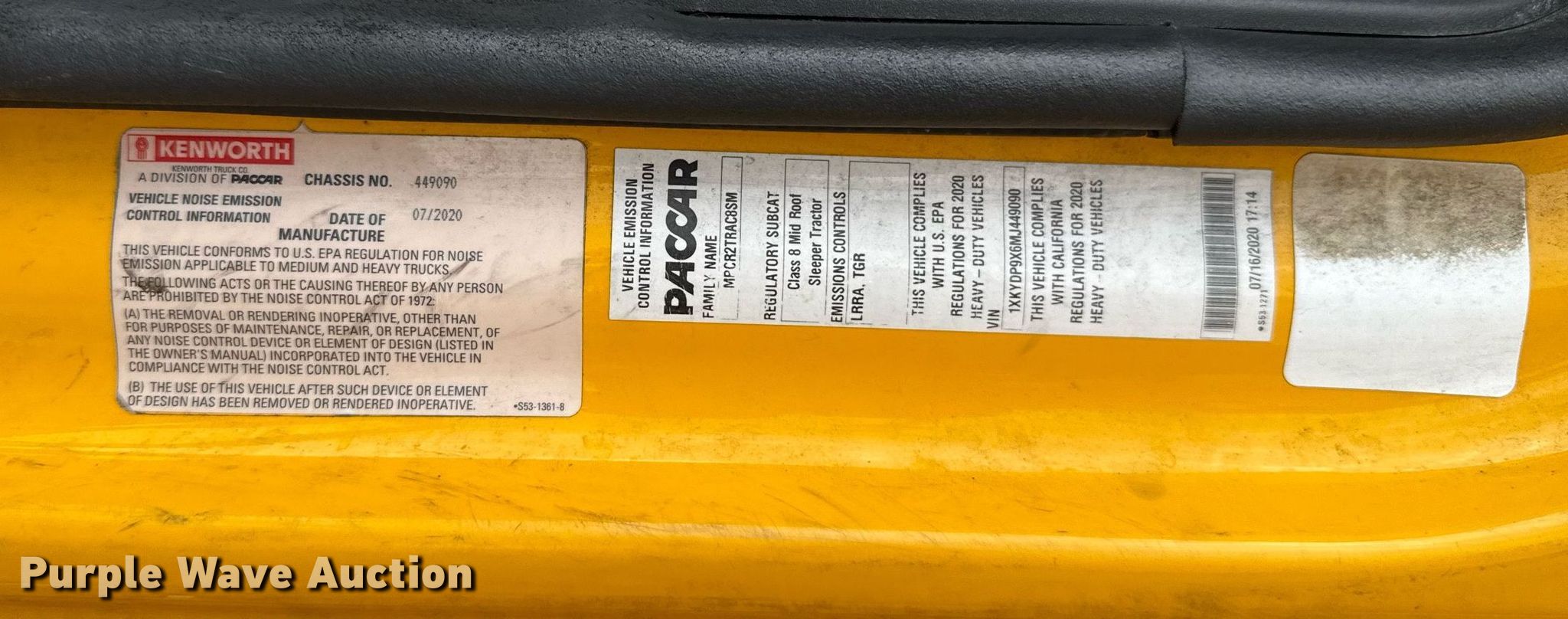 2021 Kenworth T680 semi truck. Miles: 440,777 on odometer, Hours: 14,638 on meter, VIN: 1XKYDP9X6MJ449090, Unit #: 21589. Engine Paccar MX-13, Serial: Y236009, Displacement: 12.9L, Cylinders: 6, Fuel type: Diesel, HP: 455, kW: 340, Engine brake. Transmission Automated manual. Chassis Axles: Tandem, Differential lock: Inter-axle, Suspension: Air Dump valves, Brakes: Air, GVWR: 50,350 lbs FAWR: 12,350 lbs, IAWR: 19,000 lbs, RAWR: 19,000 lbs. Interior AC, Heat, Heated mirrors, Power windows, Power locks, Cruise control, Air ride cab, Sleeper Sleeper length: 63", Beds: Single, Refrigerator, Microwave, Rear climate control. Features Deck plate: Aluminum, Fifth wheel type: Fixed, Fuel tank: Dual. Tires Front: 295/75R22.5, Rear: 445/50R22.5. Notes Windshield chipped or cracked. Oklahoma title. Title distribution may be delayed up to 30 days from verification of funds. Gemini Motor Transport. 10220 W Reno Ave. Oklahoma City, OK 73127