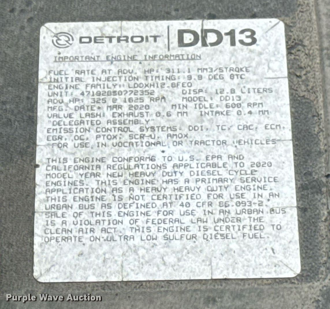 2021 Freightliner Cascadia 126 semi truck. Miles: 465,701 on odometer, Hours: 11,768 on meter, VIN: 3AKJHLDV8MSMK9795, Unit #: 21056. Engine Detroit Diesel DD13, Serial: 471928S0772352, Displacement: 12.8L, Cylinders: 6, Fuel type: Diesel, HP: 325, Engine brake. Transmission Automated manual. Chassis Axles: Tandem, Differential lock: Inter-axle, Suspension: Air Dump valves, Brakes: Air, GVWR: 52,500 lbs FAWR: 12,500 lbs, IAWR: 20,000 lbs, RAWR: 20,000 lbs, Wheelbase: 180". Interior AC, Heat, Heated mirrors, Power windows, Power locks, Cruise control, Air ride cab. Features Deck plate: Aluminum, Fifth wheel type: Fixed, Fuel tank: Single. Tires Front: 295/75R22.5, Rear: 445/50R22.5. Notes Dash warning indicator: Check engine, ABS, Traction control, Adaptive cruise control, DEF after-treatment problem. Oklahoma title. Title distribution may be delayed up to 30 days from verification of funds. Gemini Motor Transport. 10220 W Reno Ave. Oklahoma City, OK 73127