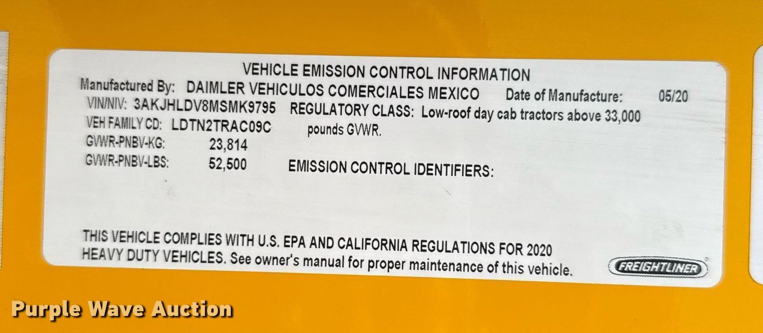 Purple Wave is selling a used Truck Tractor in Oklahoma. This item is a 2021 Freightliner Cascadia 126 semi truck with the following: Miles: 465,701 on odometer, Hours: 11,768 on meter, VIN: 3AKJHLDV8MSMK9795, Unit #: 21056