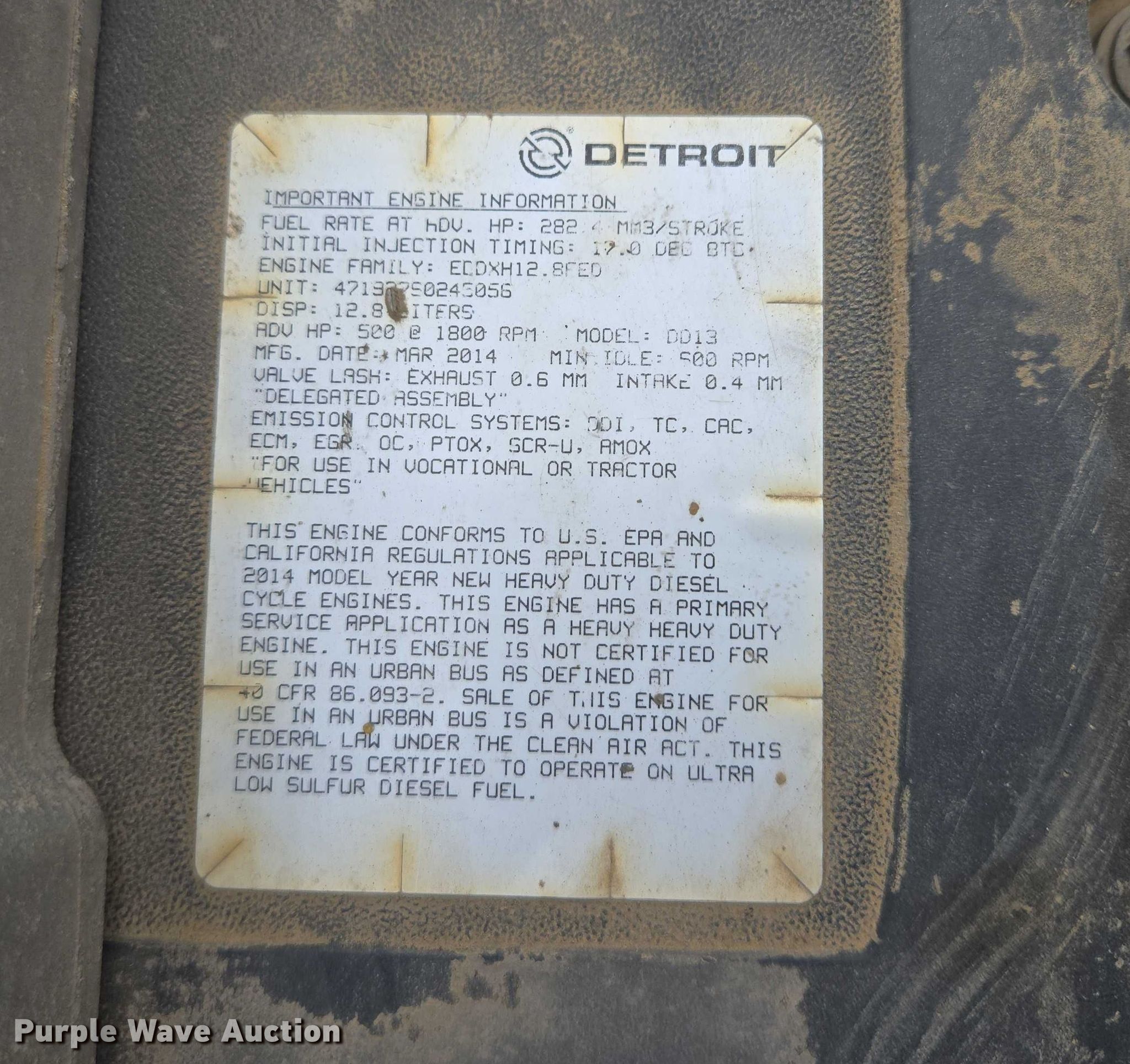 2015 Freightliner Cascadia 125 semi truck. Miles: 897,740 on odometer, VIN: 1FUJGLDV2FLGE8705, Unit #: 153220. Engine Detroit Diesel DD13, Displacement: 12.8L, Cylinders: 6, Fuel type: Diesel, Engine brake. Transmission Eaton Fuller, Manual, Speed: 10. Chassis Axles: Tandem, Differential lock: Inter-axle, Suspension: Air Dump valves, Brakes: Air, PTO, Wet kit, GVWR: 52,350 lbs FAWR: 12,350 lbs, IAWR: 20,000 lbs, RAWR: 20,000 lbs. Interior AC, Heat, Heated mirrors, Power windows, Cruise control, Air ride cab, Sleeper Sleeper length: 58", Beds: Single, Rear climate control. Features Deck plate: Aluminum, Fifth wheel type: Air operated, Sliding, Fuel tank: Single. Tires Front: 275/80R22.5, Rear: 445/50R22.5. Notes Trailer not included, Dash warning indicator: Check engine, Exhaust system, High soot level, Parked regen req'd, Diagnostic code SPN 1548 FMI 5. Minnesota title. Title distribution may be delayed up to 30 days from verification of funds. CHS, Inc.. Sioux Falls, SD 57107