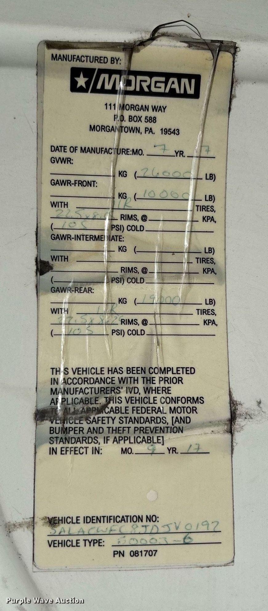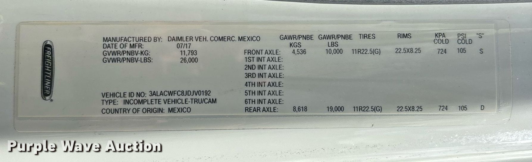 2018 Freightliner Business Class M2 106 box truck. Miles: 266,475 on odometer, Hours: 7,613 on meter, VIN: 3ALACWFC8JDJV0192, Unit #: 57909815. Engine Cummins, Displacement: 6.7L, Cylinders: 6, Fuel type: Diesel. Transmission Eaton Fuller, Automatic. Chassis Axles: Single, Suspension: Air, Brakes: Air, GVWR: 26,000 lbs. Interior AC, Heat, Cruise control. Features Box bed Morgan, 26' L x 102" W x 103" H, End gate lift, Maxon, Capacity: 3,000 lbs. Tires Size: 11R22.5. Repossessed item, stored at a secured facility. Please review REQUIRED REMOVAL INSTRUCTIONS. Lender owned. Item condition and history are unknown. No additional information is available. Titles will be distributed after confirmation of payment and removal. Florida title. Title distribution may be delayed up to 30 days from verification of funds. Lender Owned. Eight mile, AL 36613
