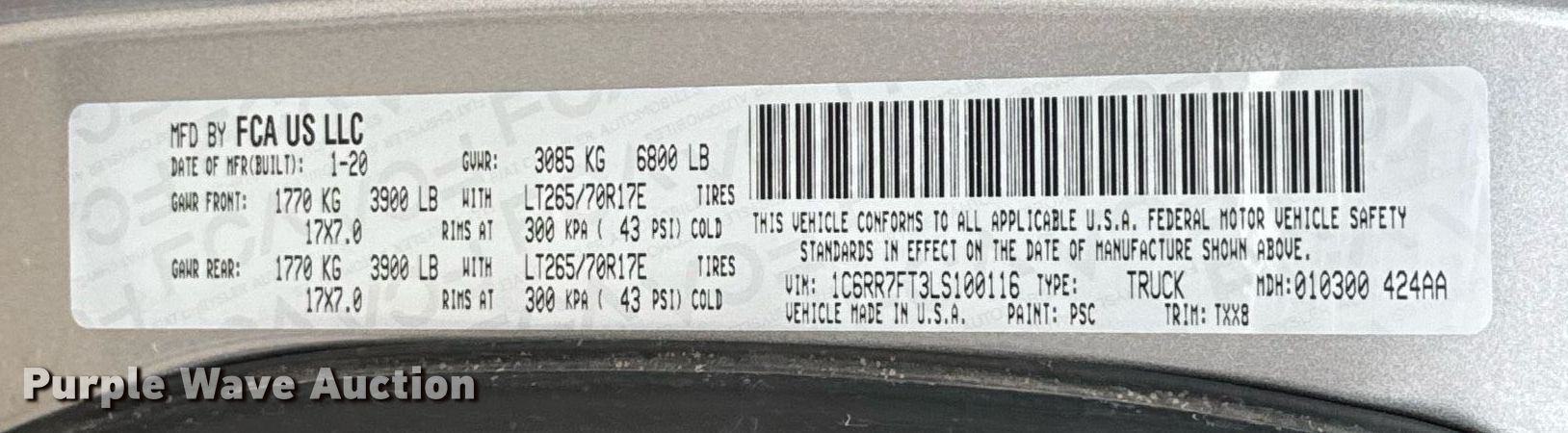 Purple Wave is selling a used 1/2 Ton Pickup or Van in Oklahoma. This item is a 2020 Dodge Ram 1500 Classic Quad Cab pickup truck with the following: Miles: 119,148 on odometer, VIN: 1C6RR7FT3LS100116